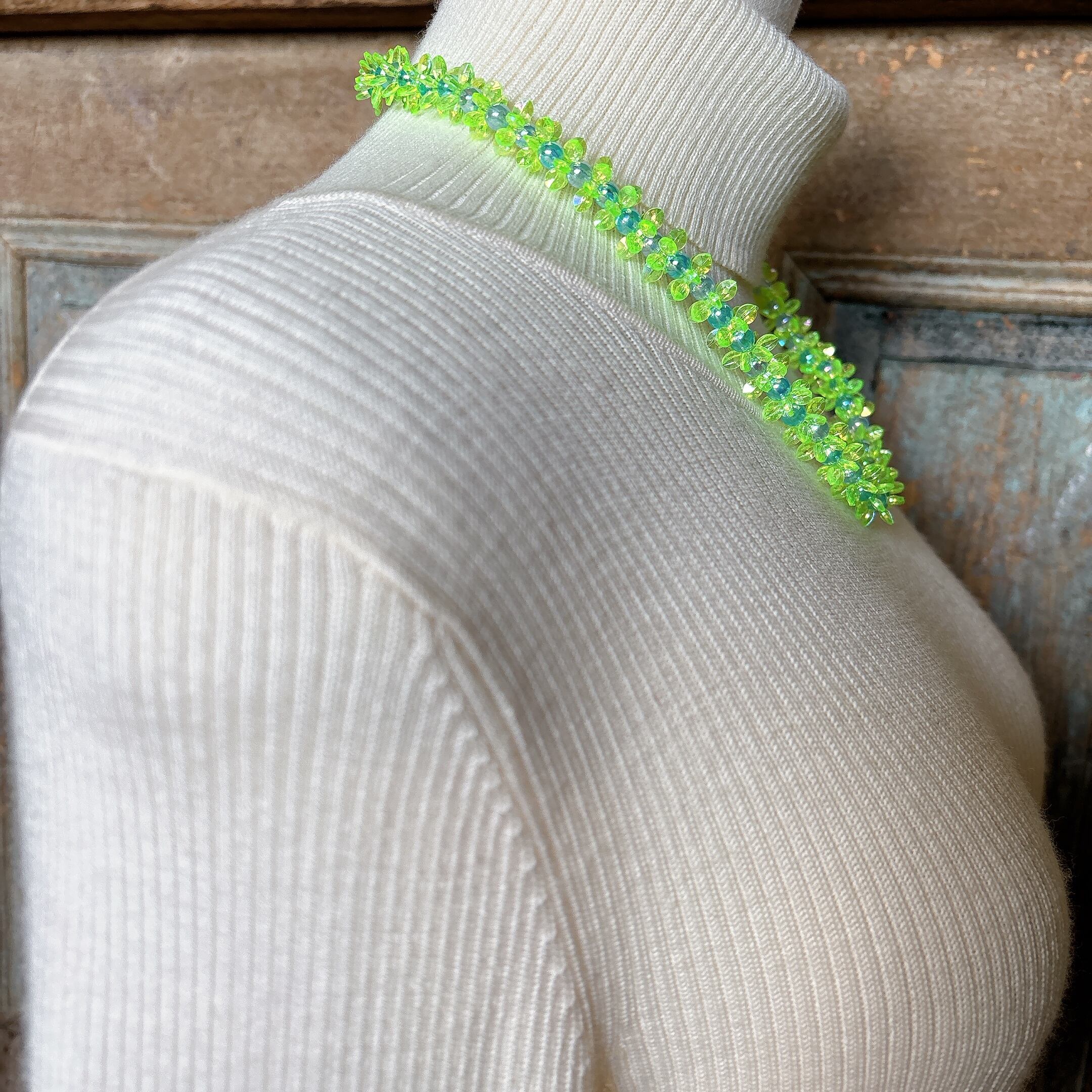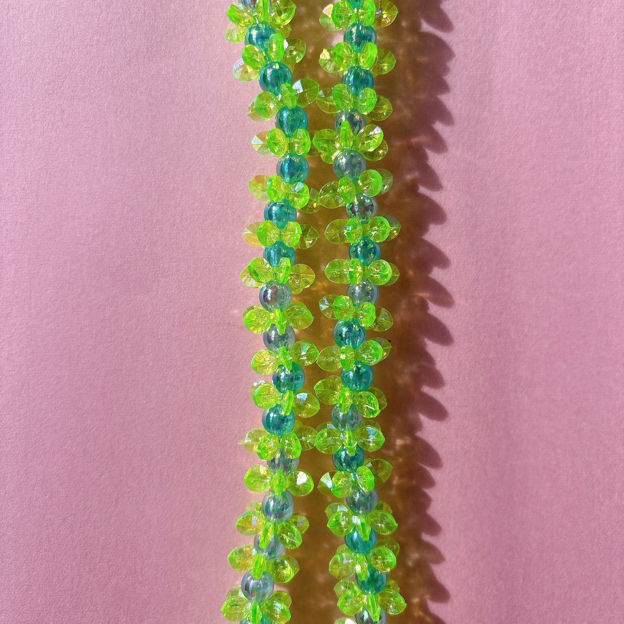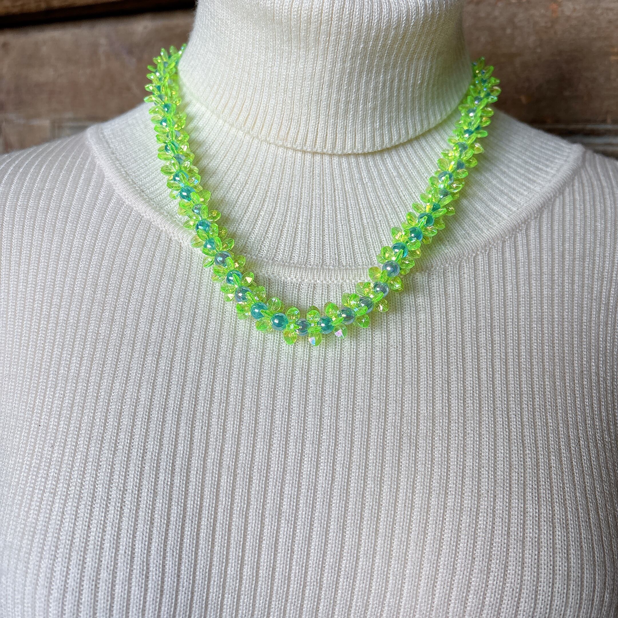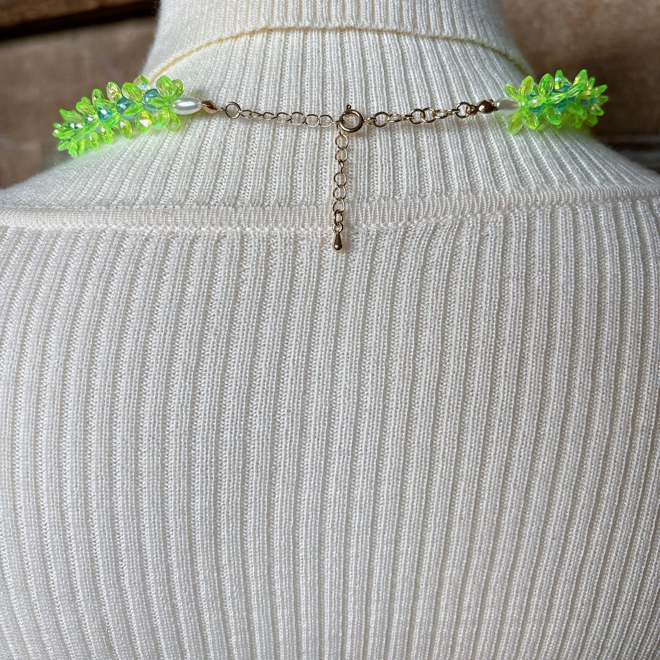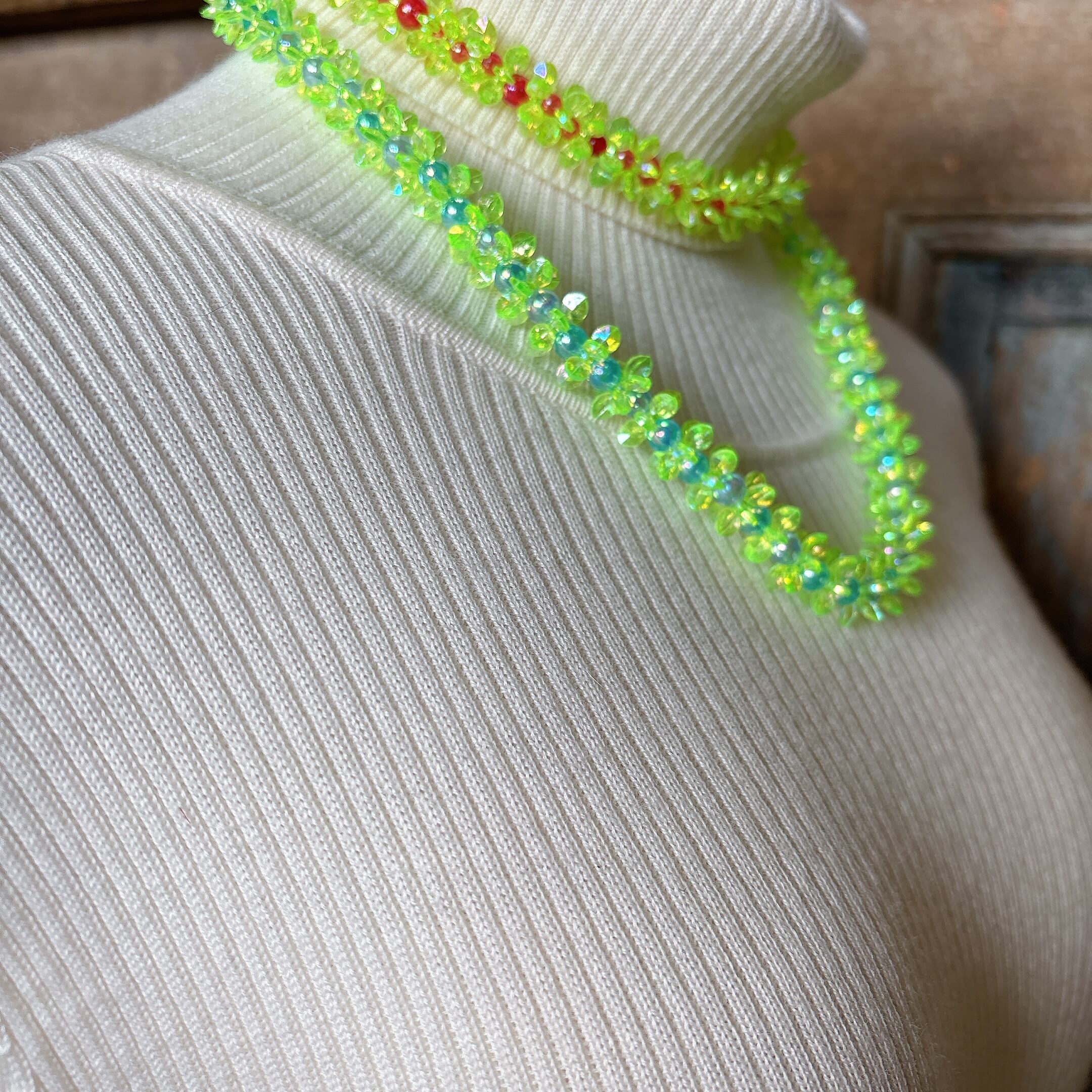 ◾️ ネオングリーンのフラワービーズに、透明感のあるブルービーズを組み合わせた爽やかなネックレス。
