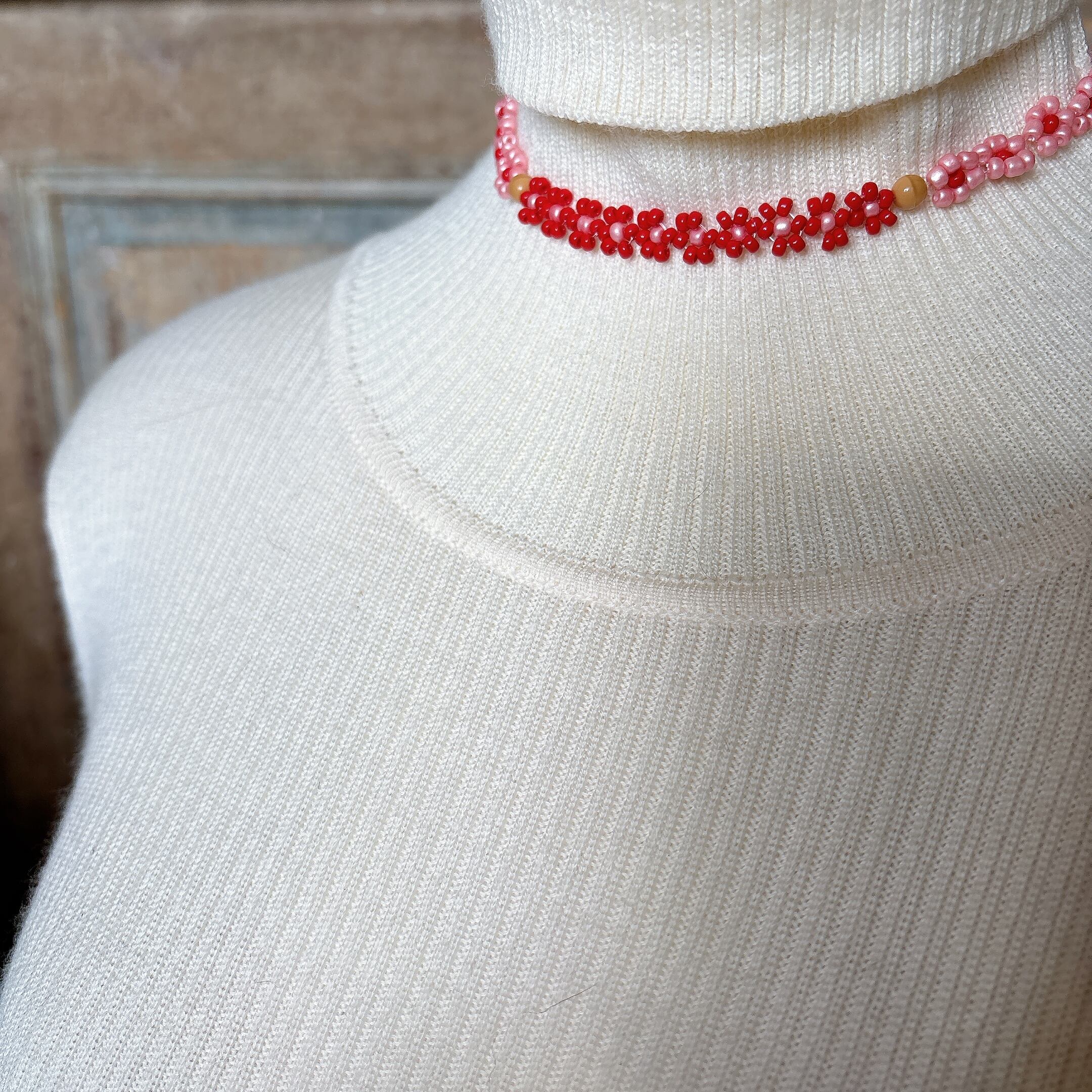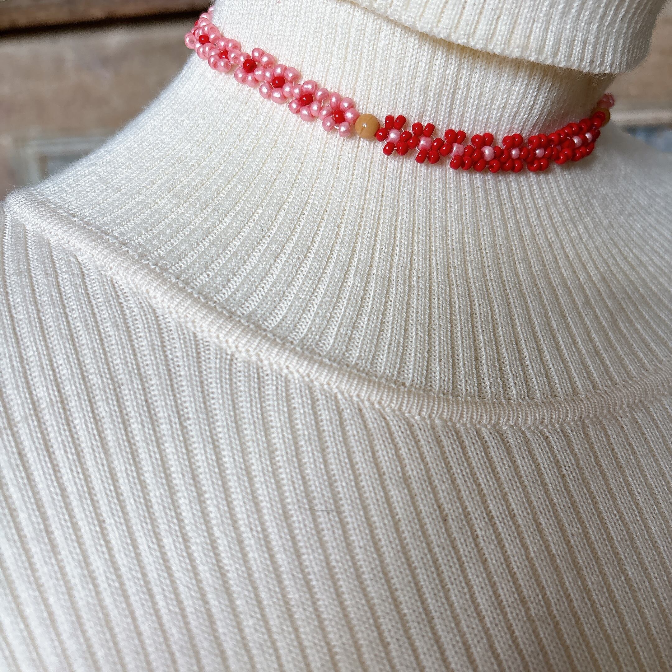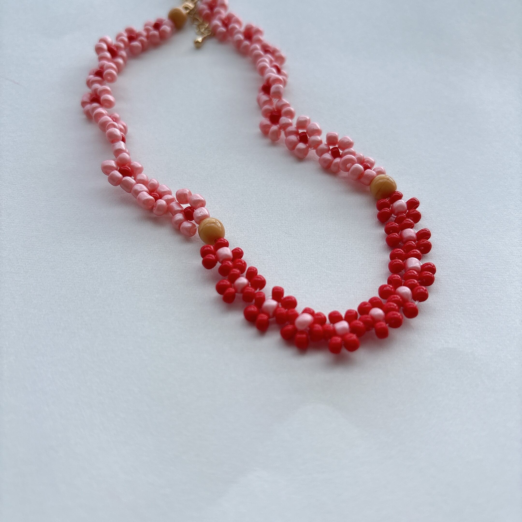 ◾️ 淡いピンクと鮮やかなレッドを組み合わせた、小花モチーフのビーズネックレス。