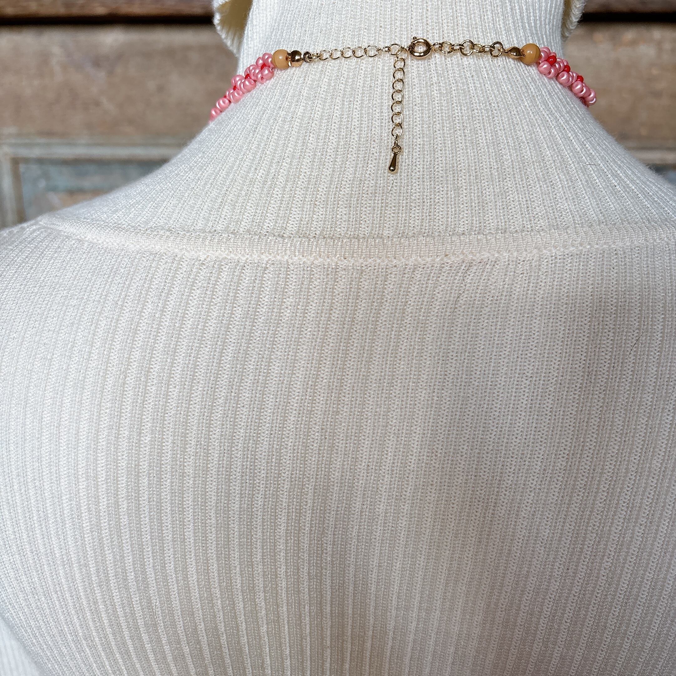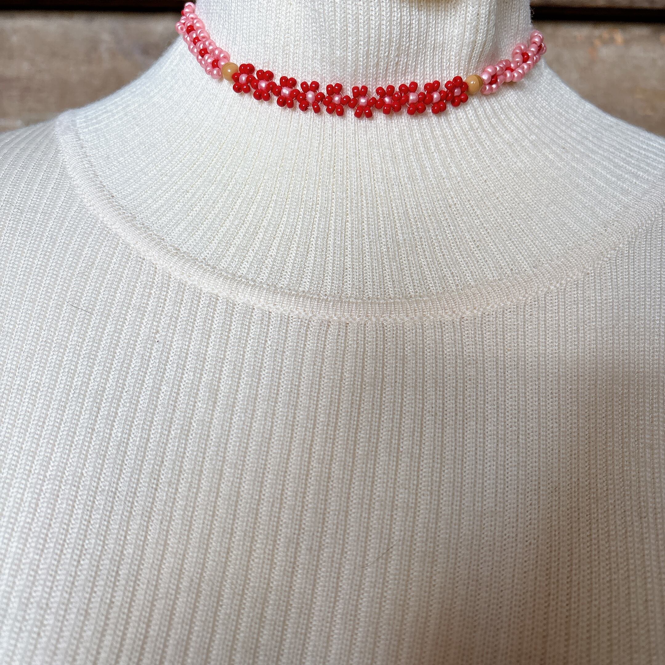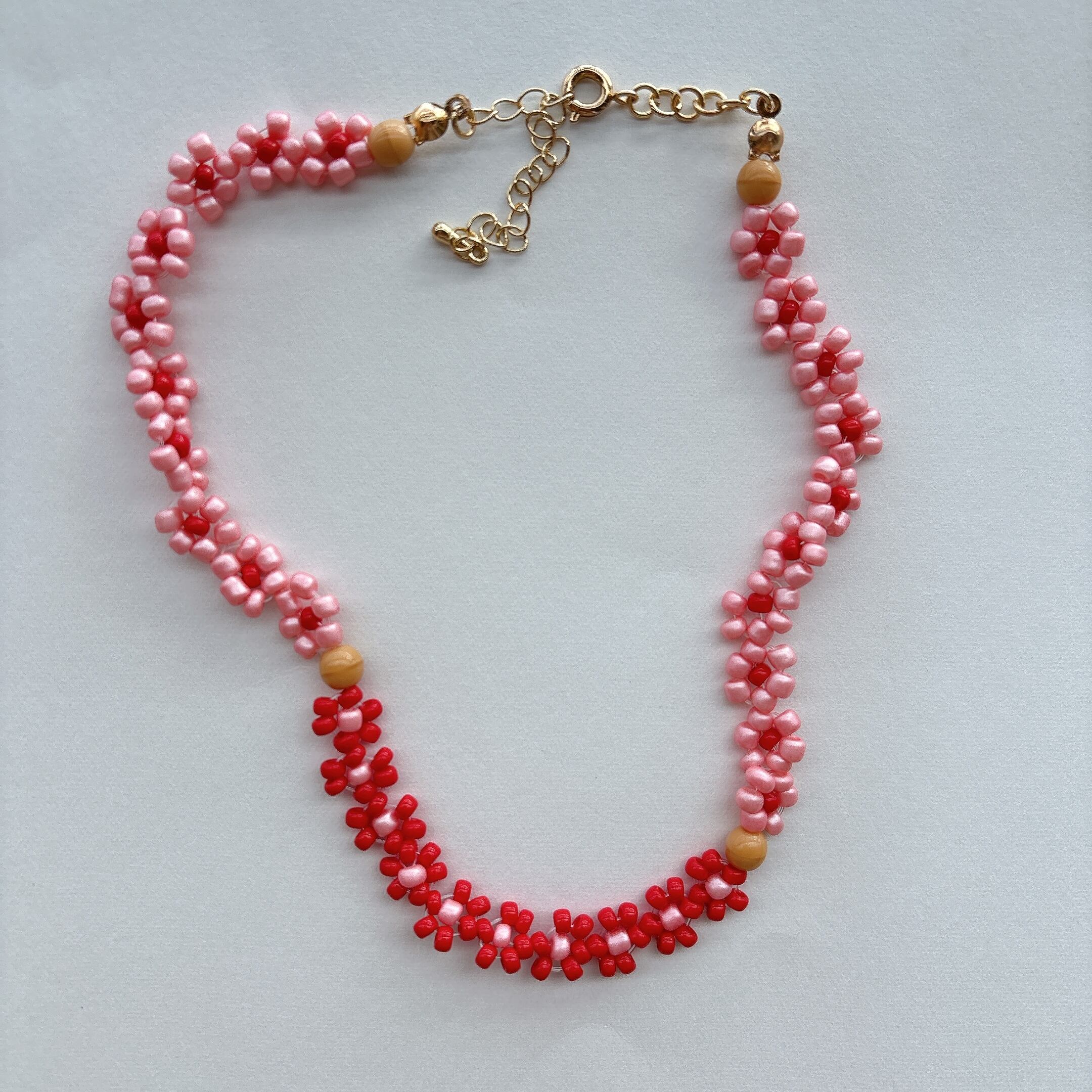 ◾️ 淡いピンクと鮮やかなレッドを組み合わせた、小花モチーフのビーズネックレス。