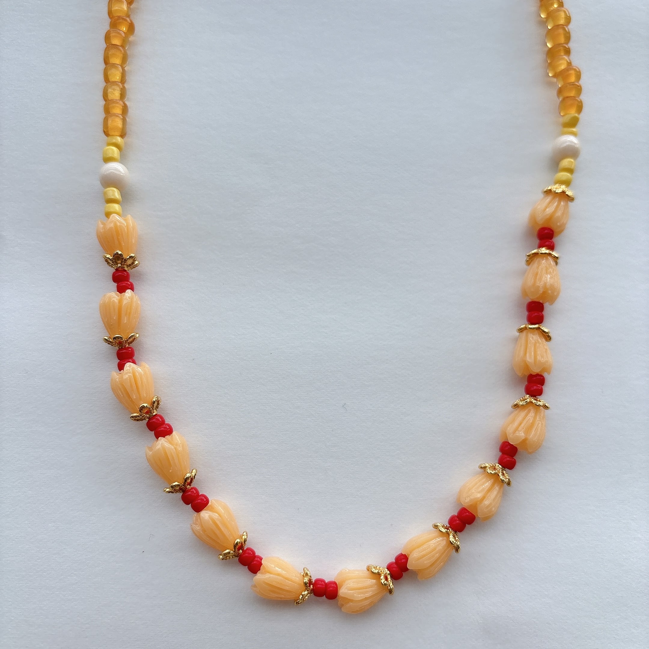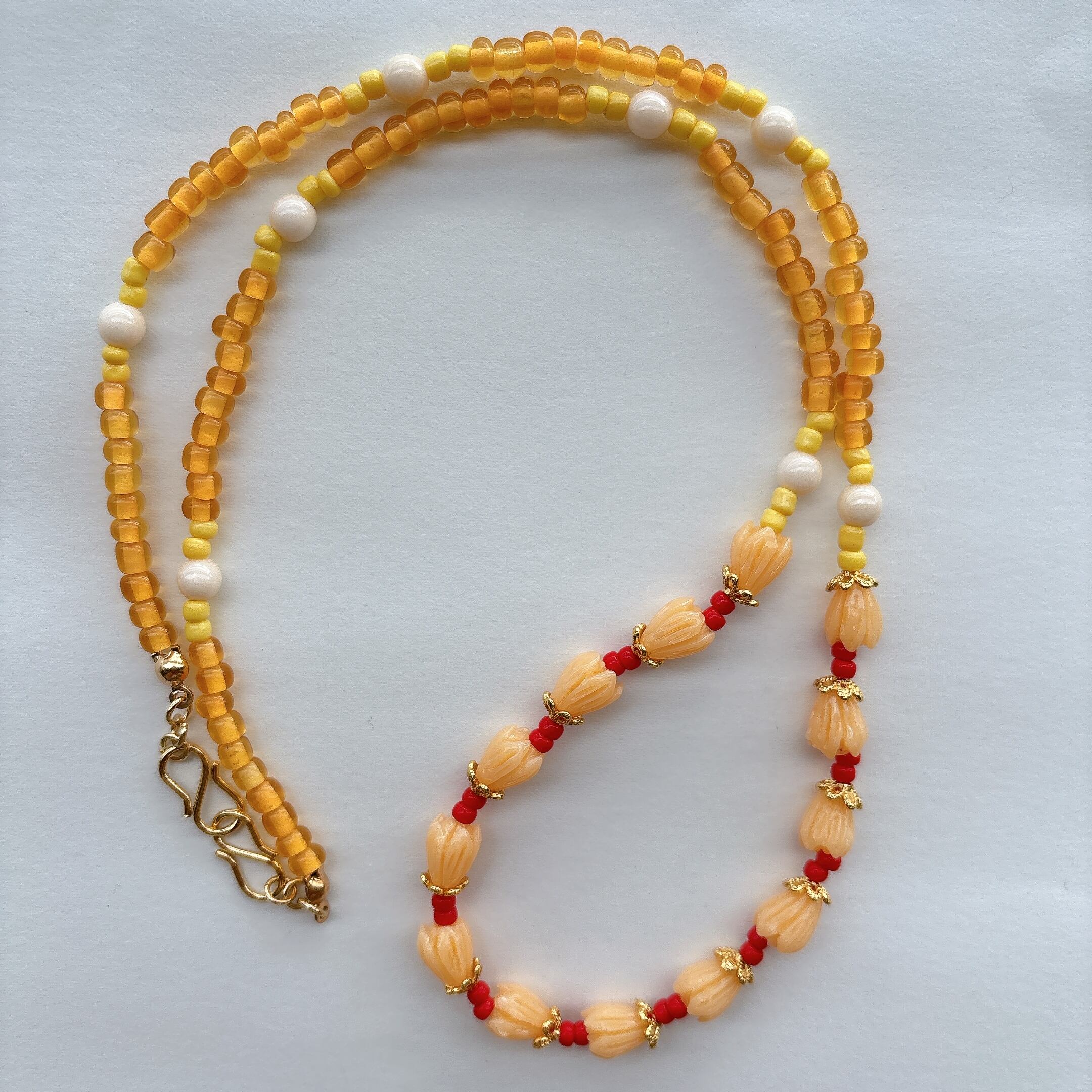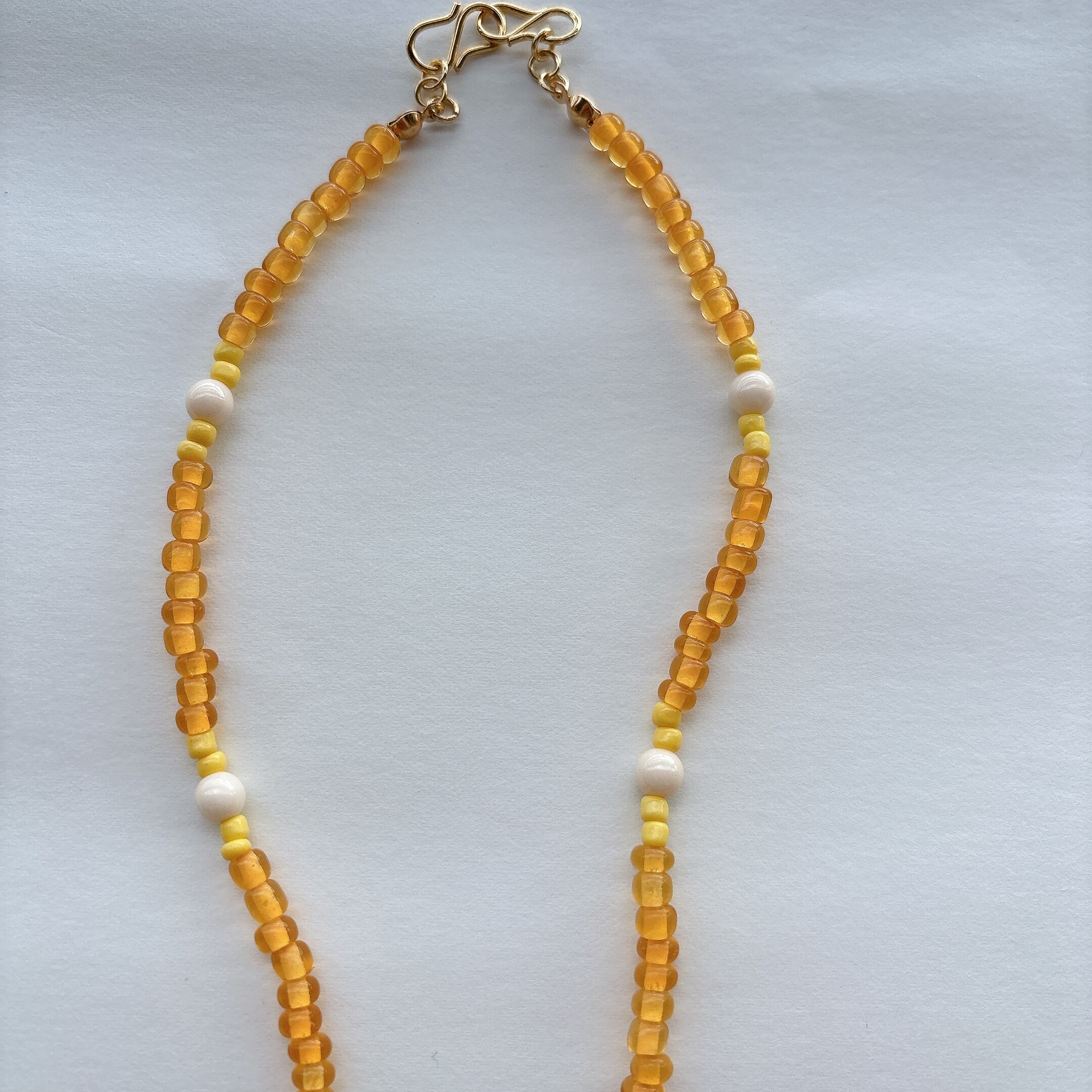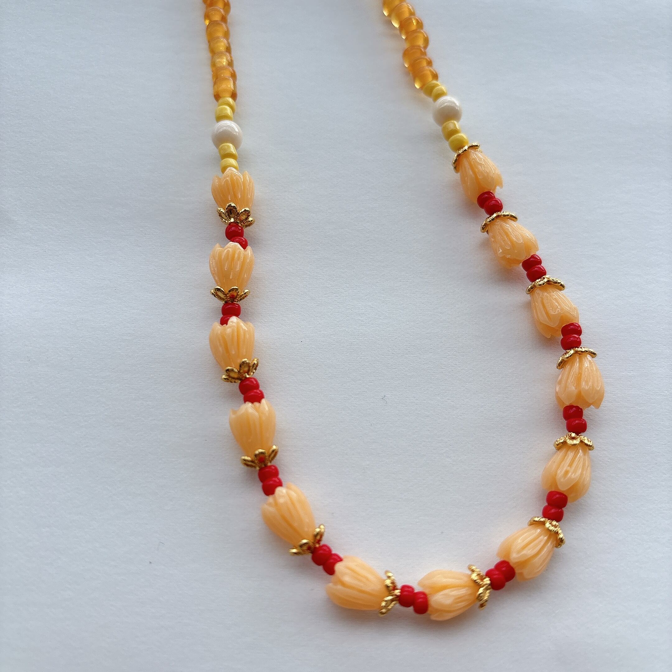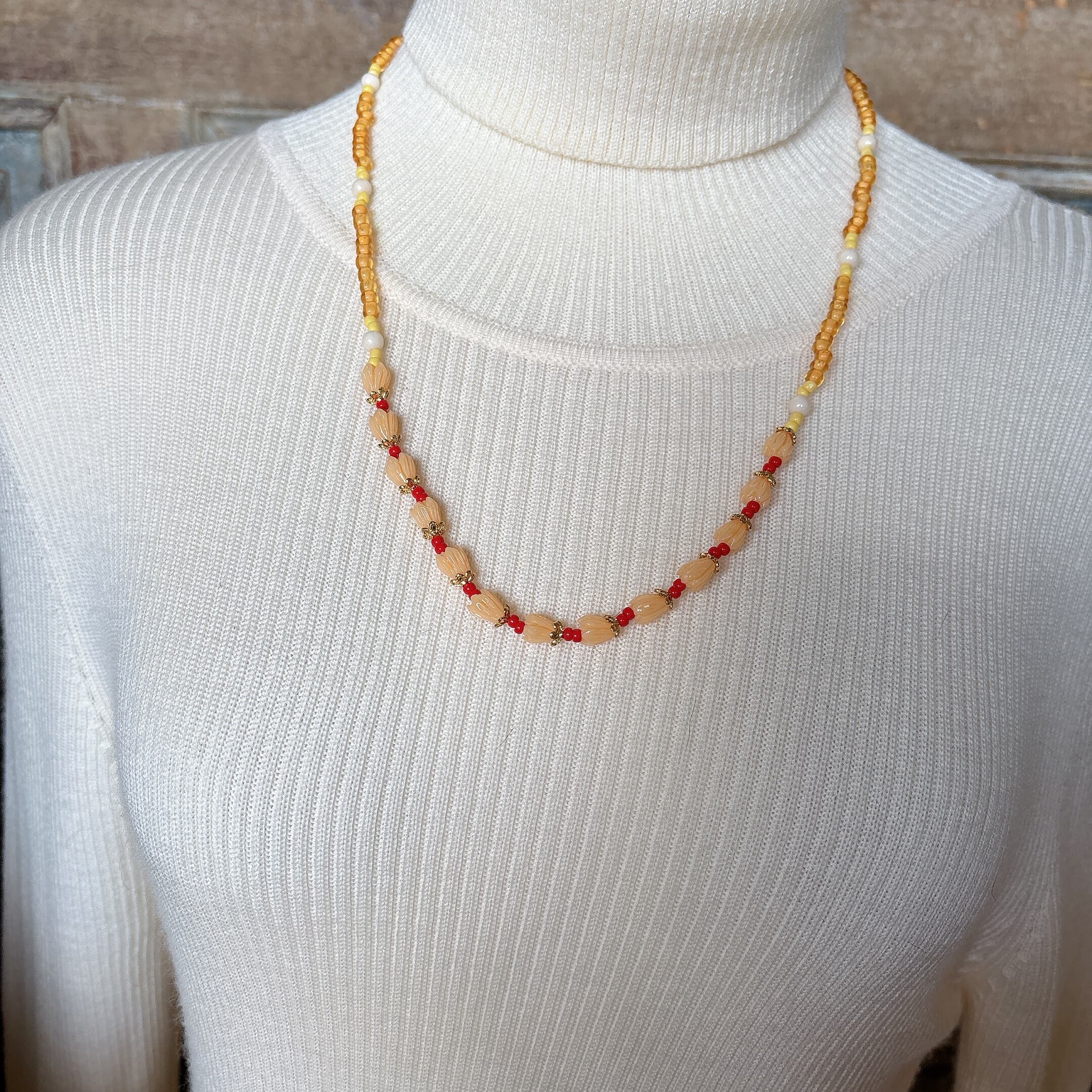 ◾️ 暖かみのあるオレンジ〜イエロートーンでまとめた、レトロでやさしい雰囲気のネックレス。