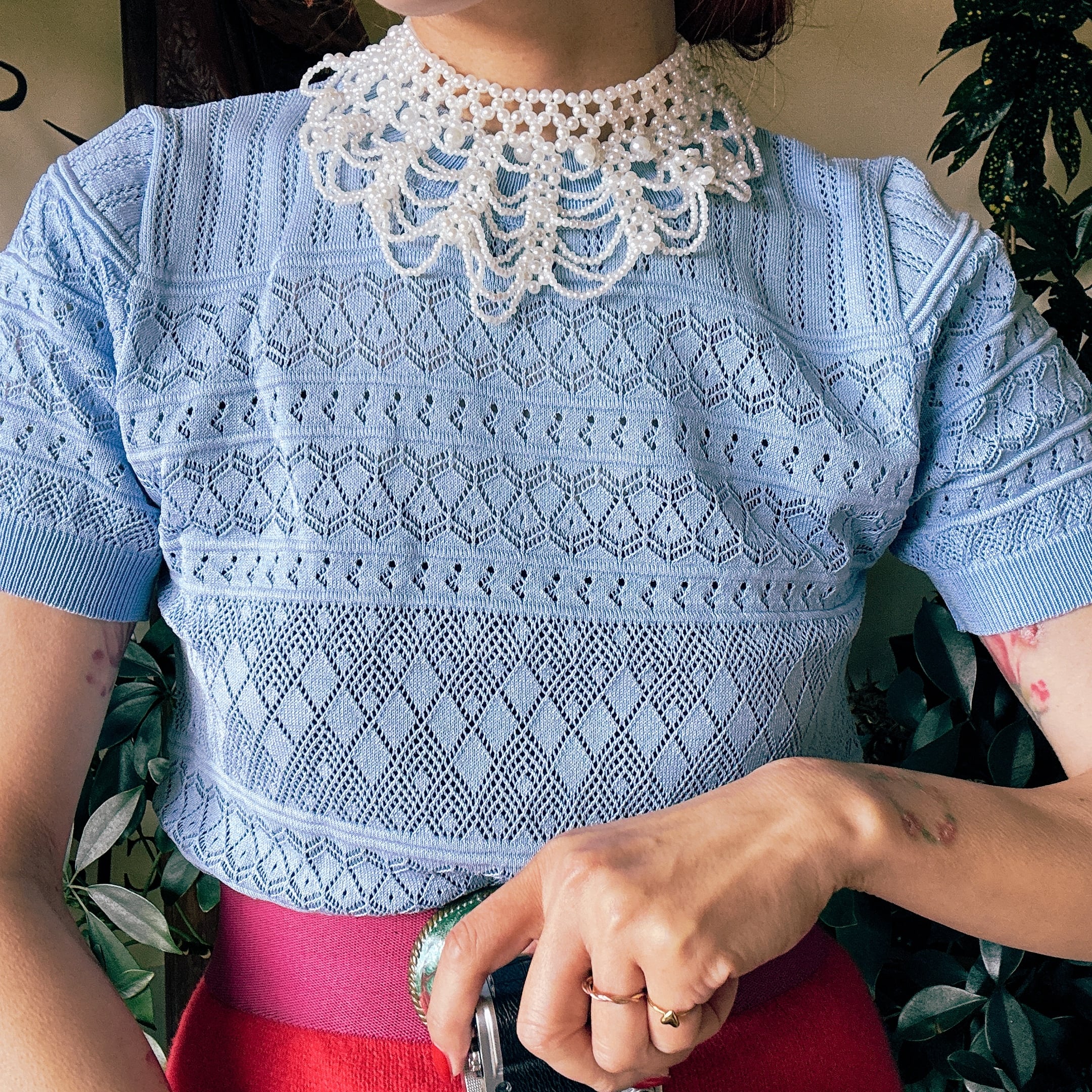 【NEWWITHTAGS】透かし編み 半袖 ニット【ブルー】