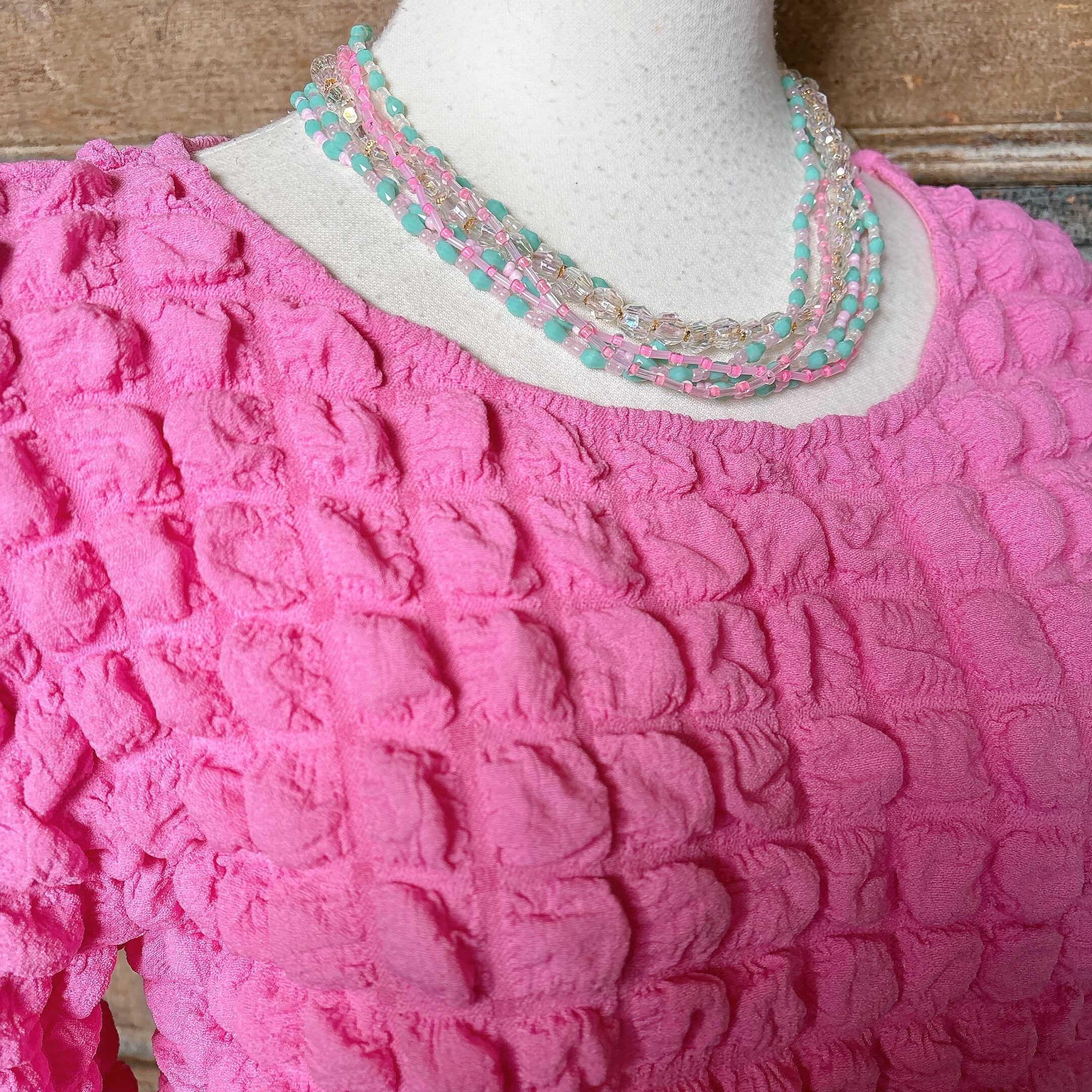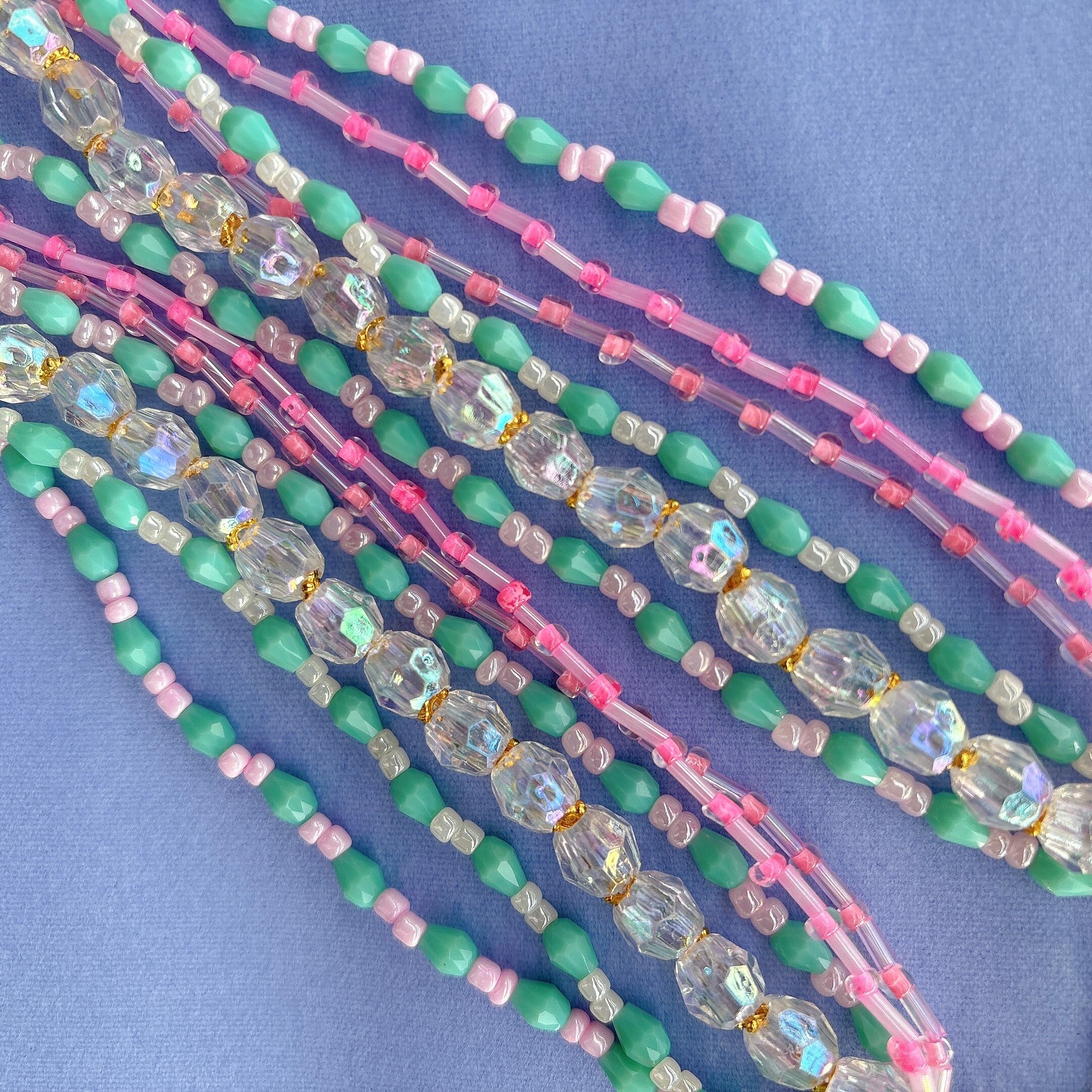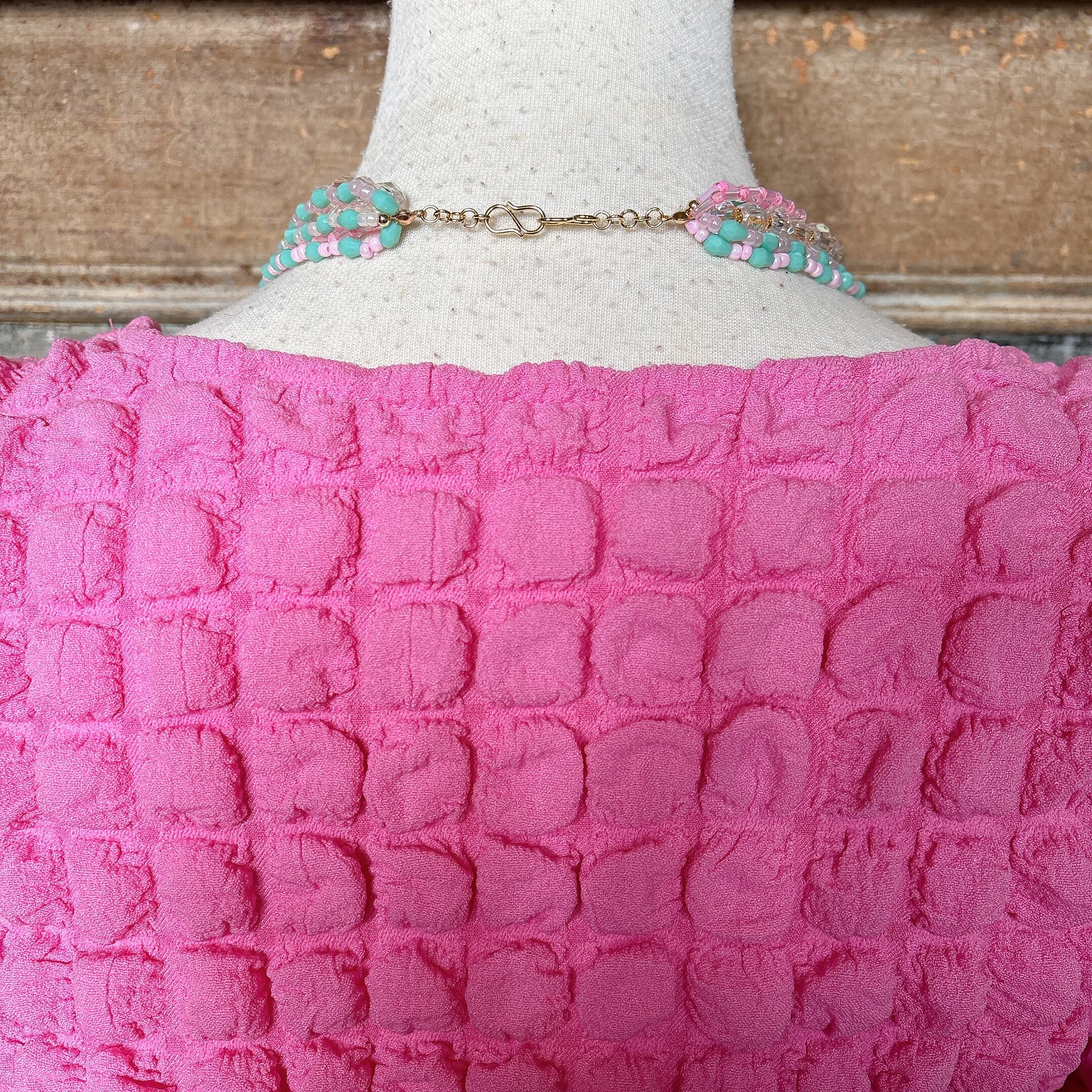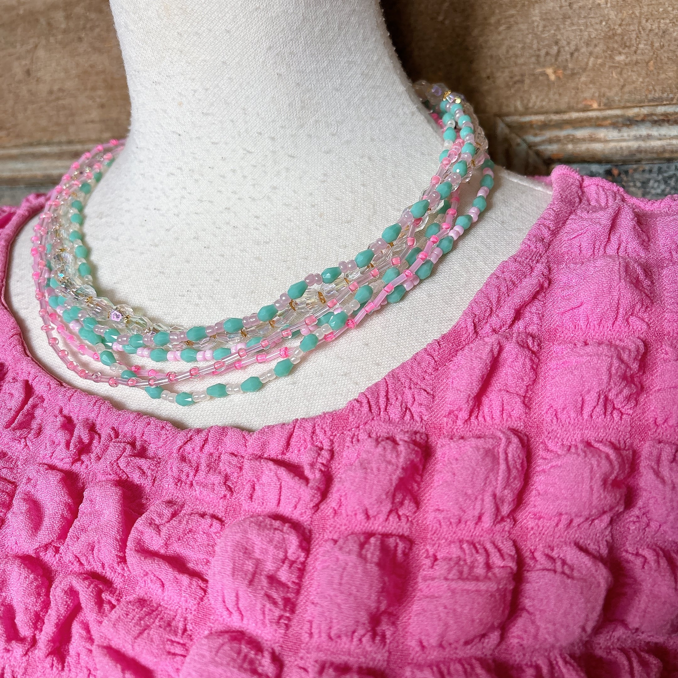 ◾️ ミントグリーンとピンクを基調に、透明感のあるクリアビーズを組み合わせた華やかなマルチストランドネックレス。