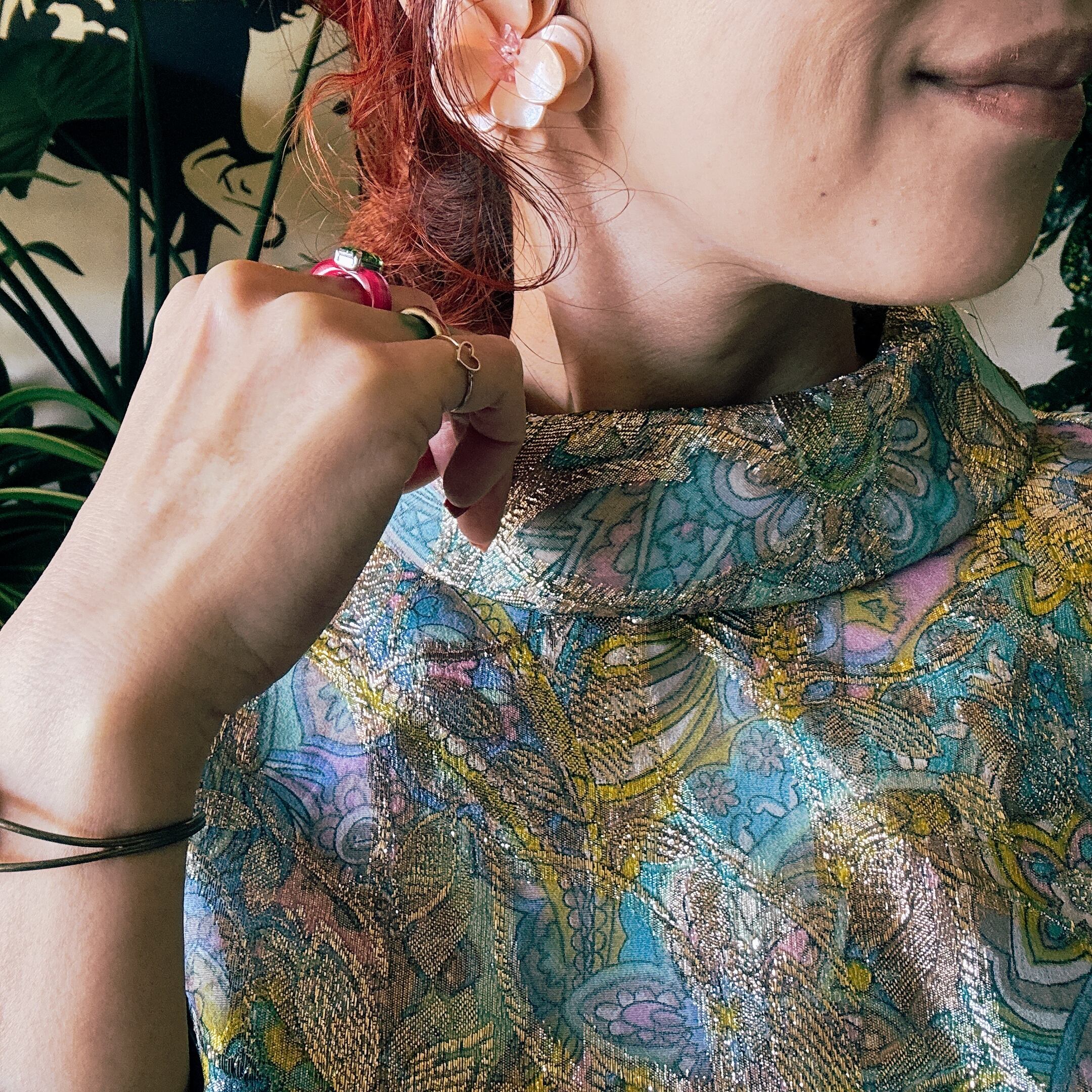 ブルーやグリーンを基調とした多色の柄に、光沢感のある織りが重なり、クラシカルで存在感のある一着です。ハイネック風の襟元とノースリーブデザインが、すっきりとしたシルエットを演出。ウエストに軽くギャザーが入り、女性らしいラインを作ります。一枚で主役になるヴィンテージらしい華やかさが魅力で、パーティーシーンや特別な日の装いにもおすすめです。