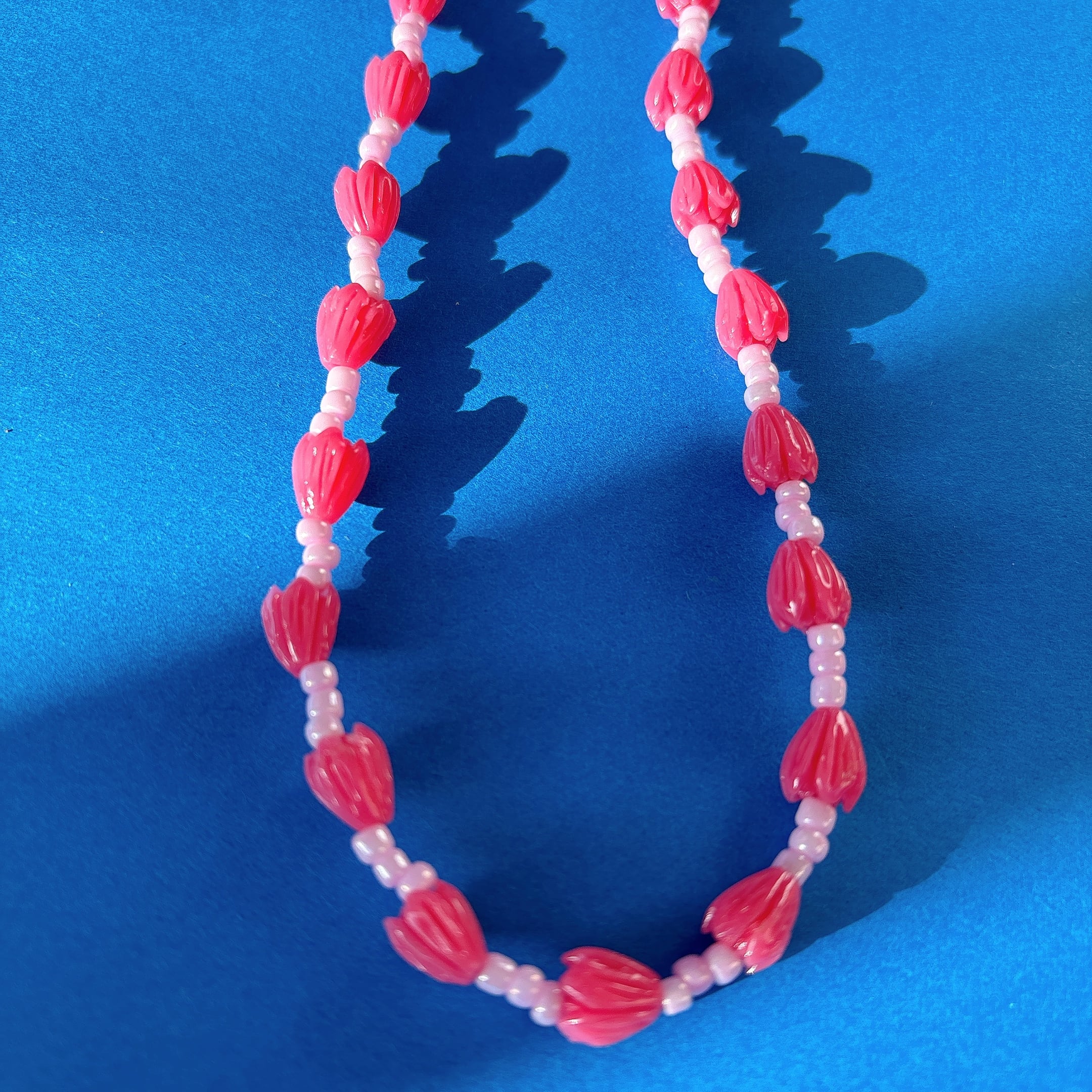 ◾️立体感のあるフラワーモチーフビーズを並べた、華やかなピンクカラーのネックレス。