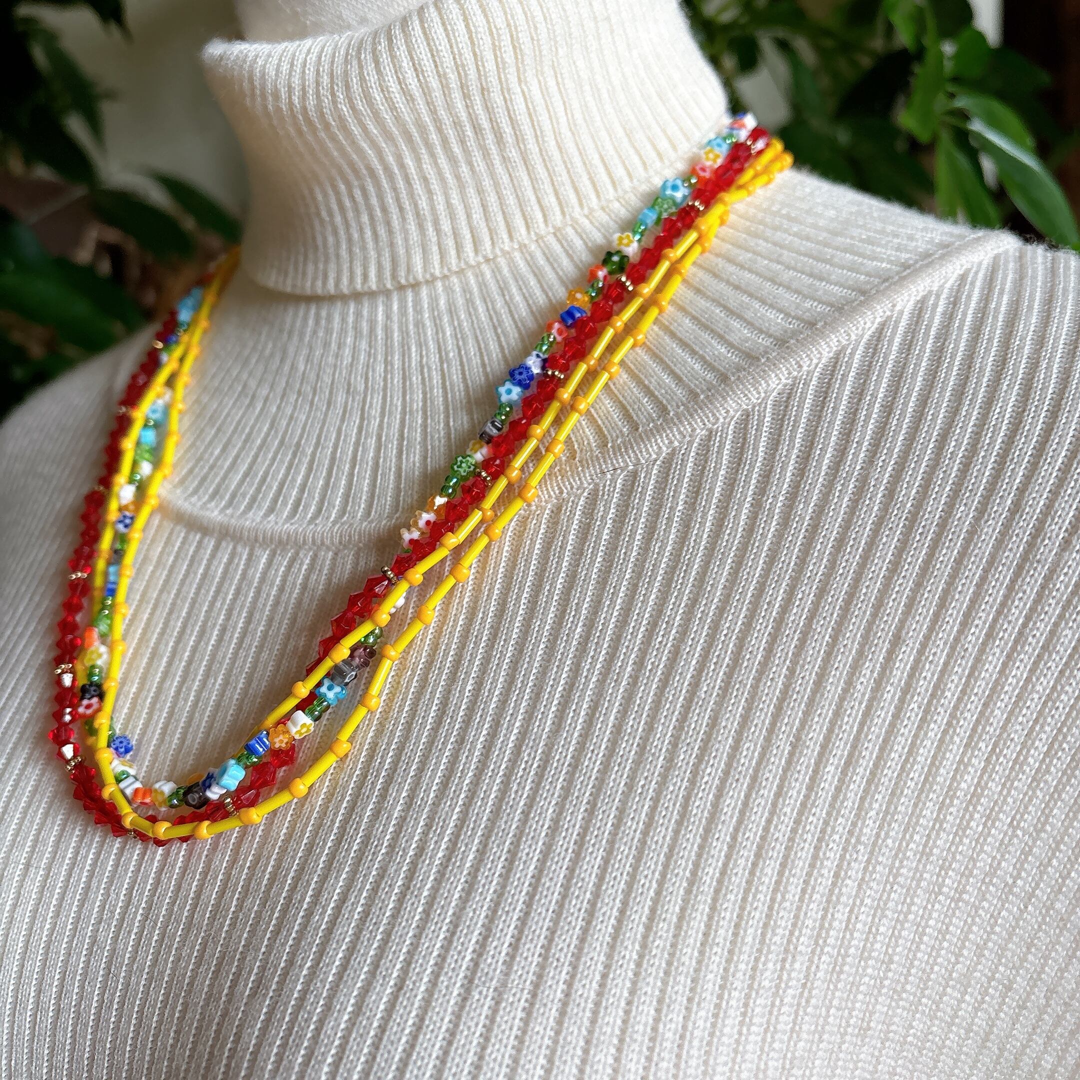 赤のカットビーズと、イエローのチューブビーズがリズミカルに重なり、軽やかで遊び心のある印象に仕上がっています。