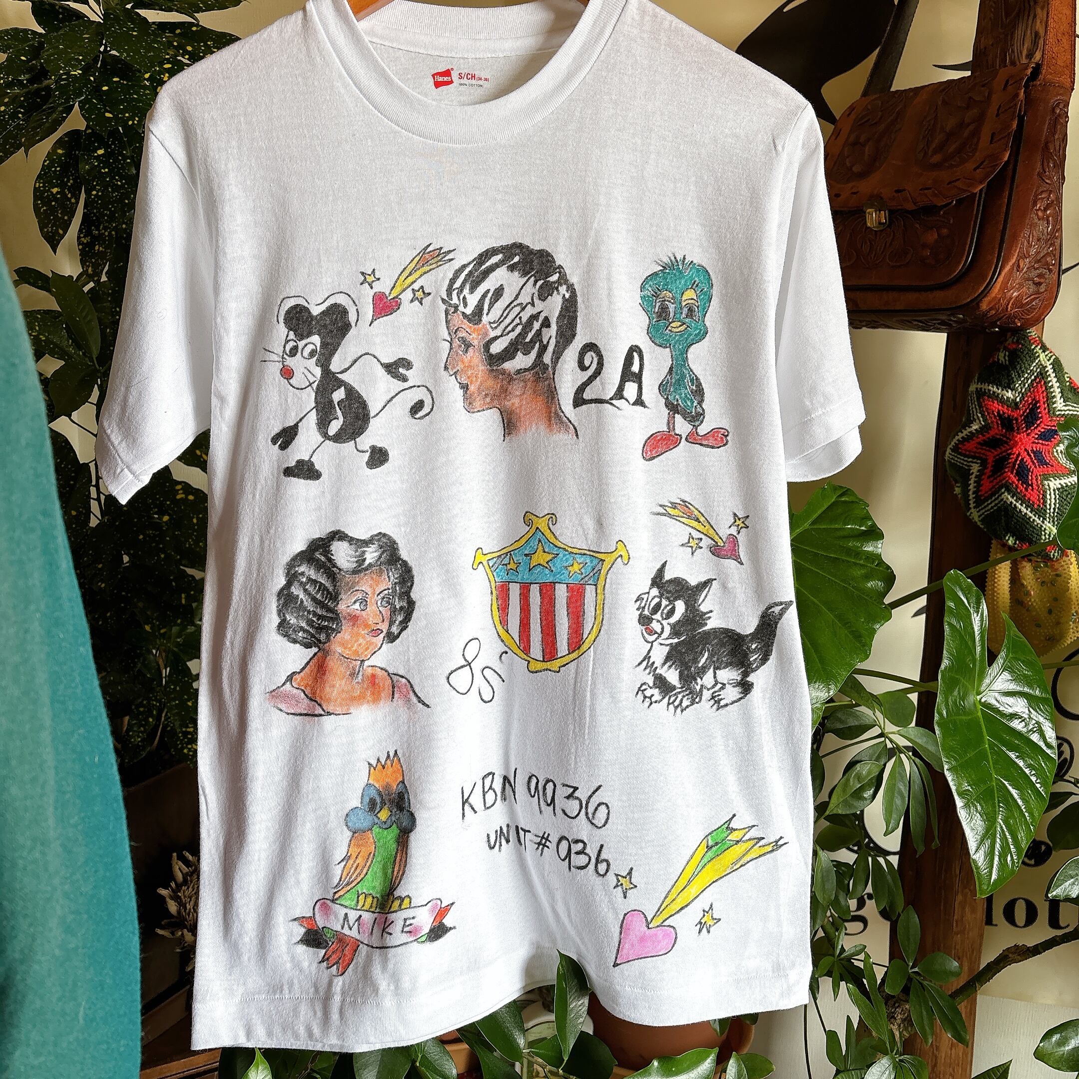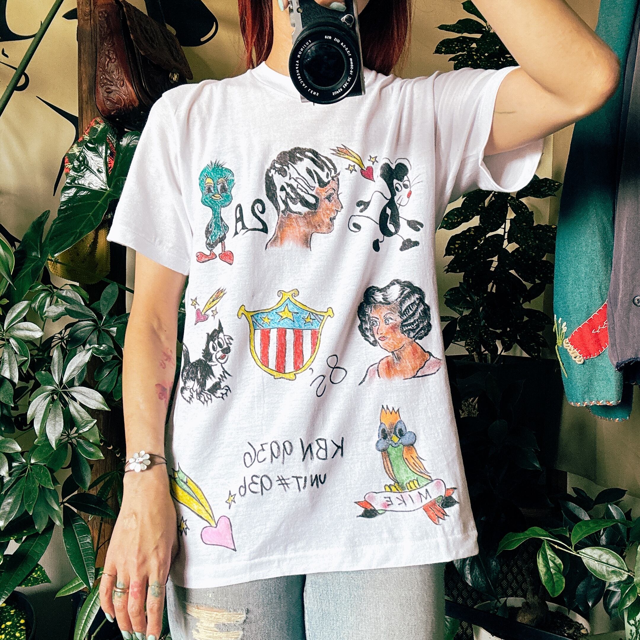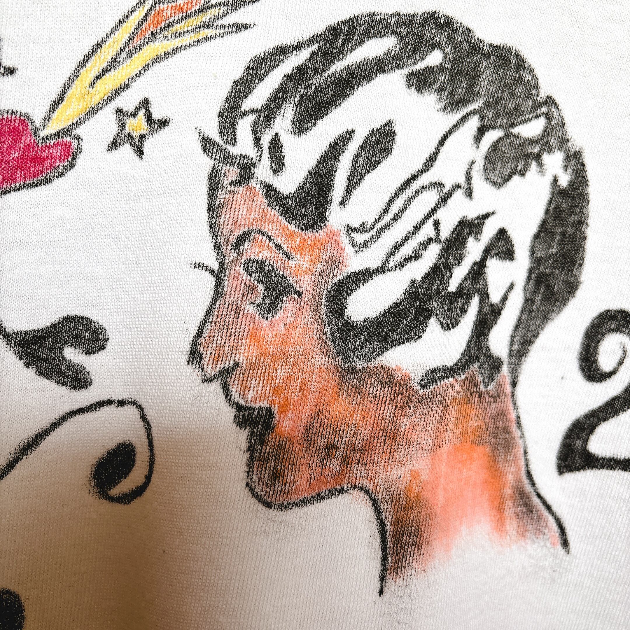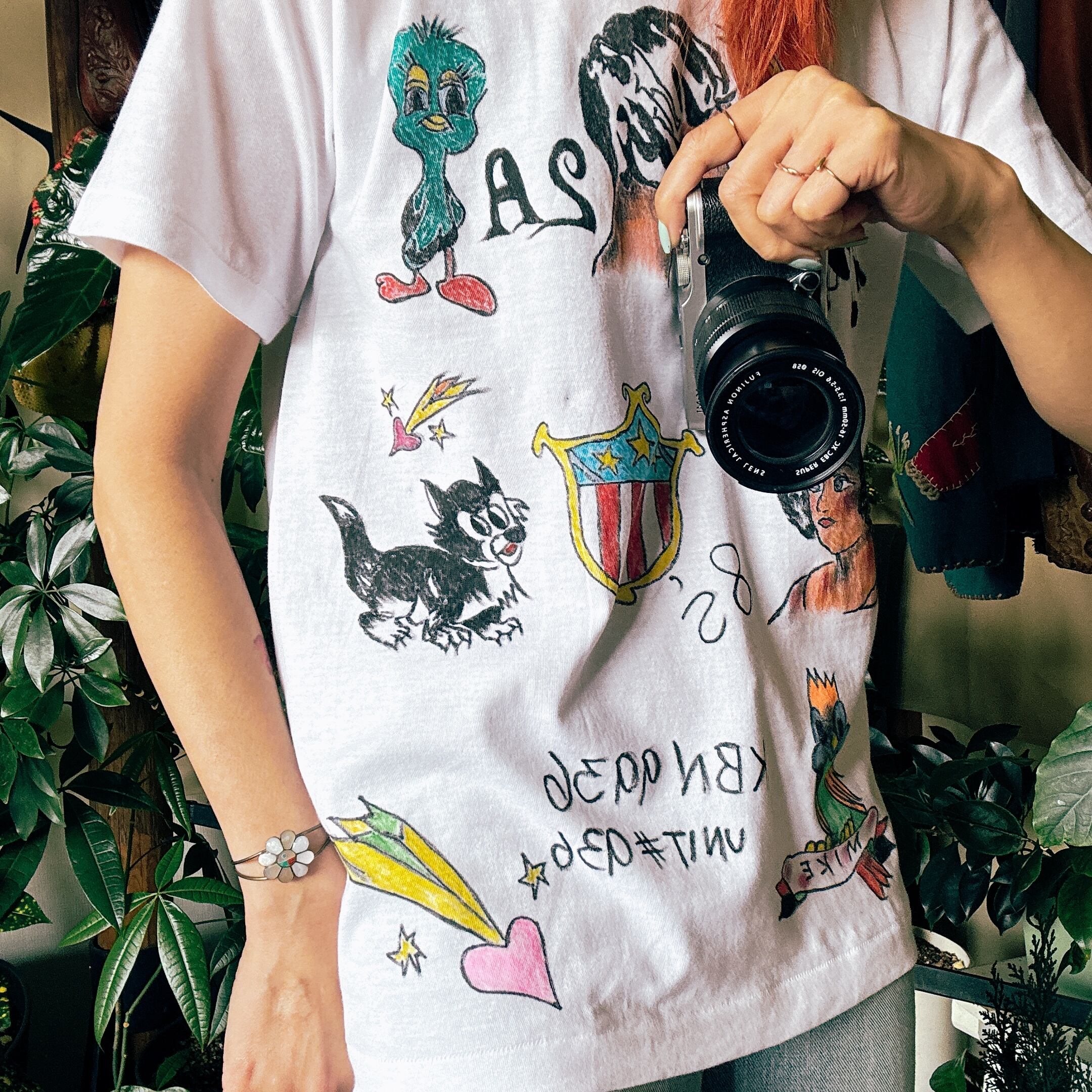 ◾️無地のティーシャツにハンドペイントを施しました。使い勝手の良いクルーネック。ユニセックスにお使いいただけます。表記サイズはSですが程よく伸縮性があり普段レディースMサイズ着用モデルでちょうど良く着られました。
