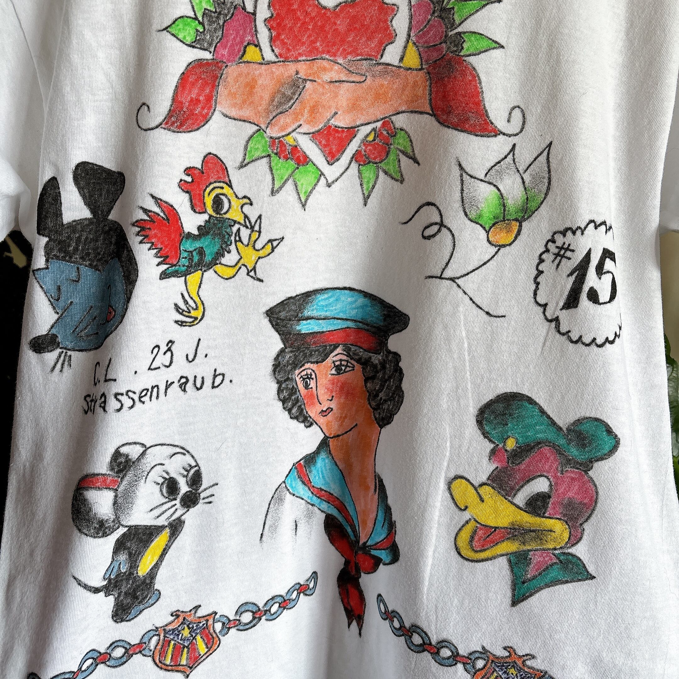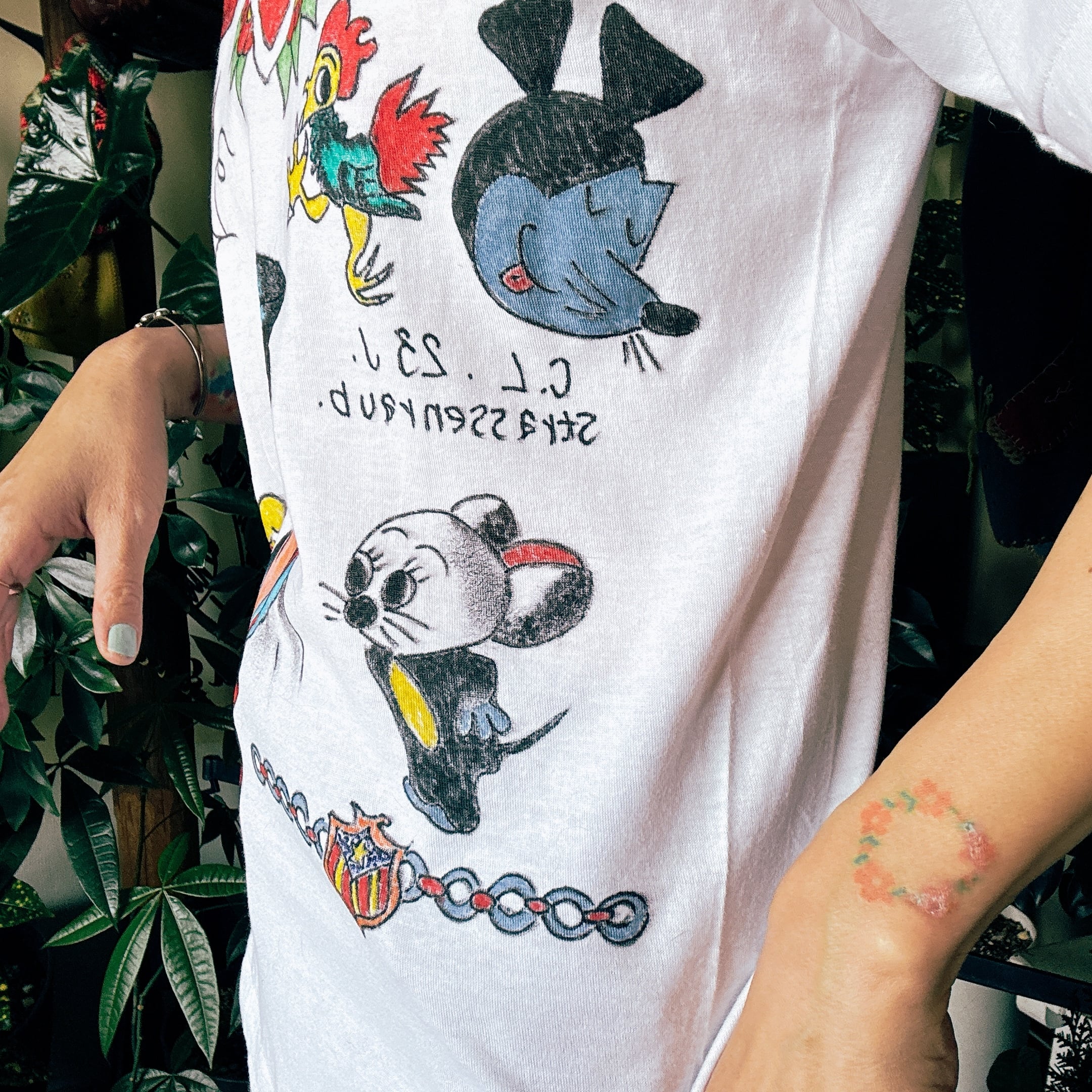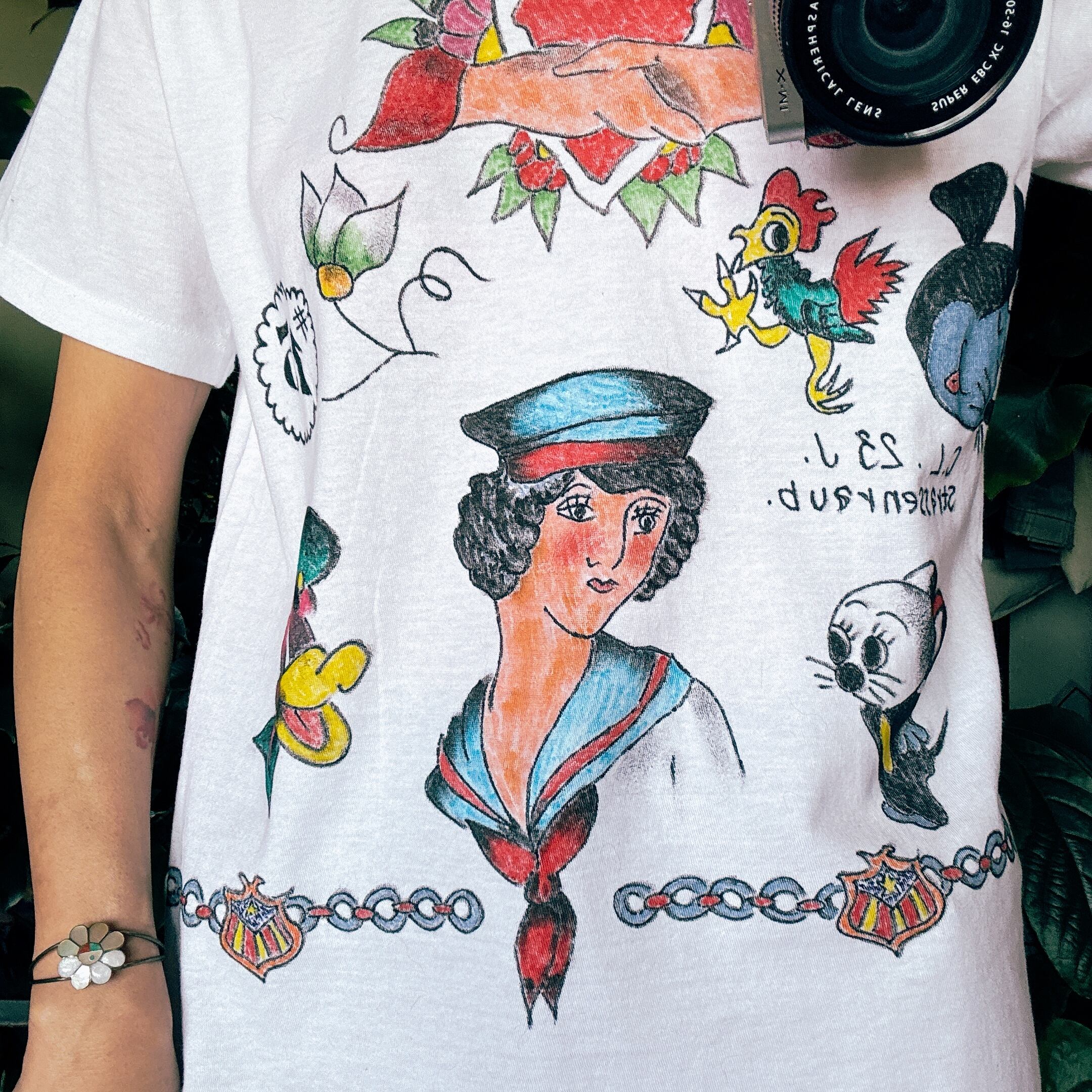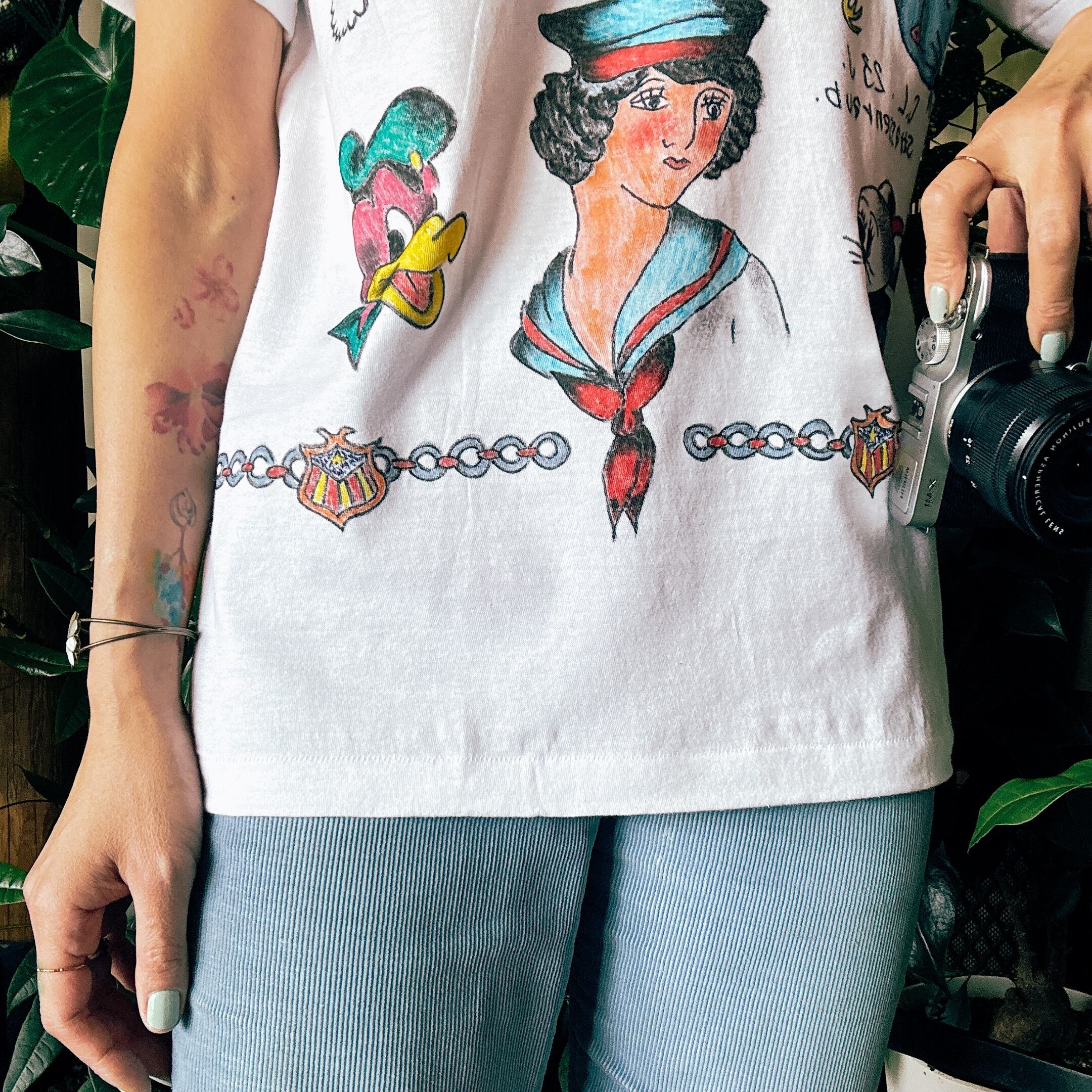 ◾️無地のティーシャツにハンドペイントを施しました。使い勝手の良いクルーネック。ユニセックスにお使いいただけます。表記サイズはSですが程よく伸縮性があり普段レディースMサイズ着用モデルでちょうど良く着られました。