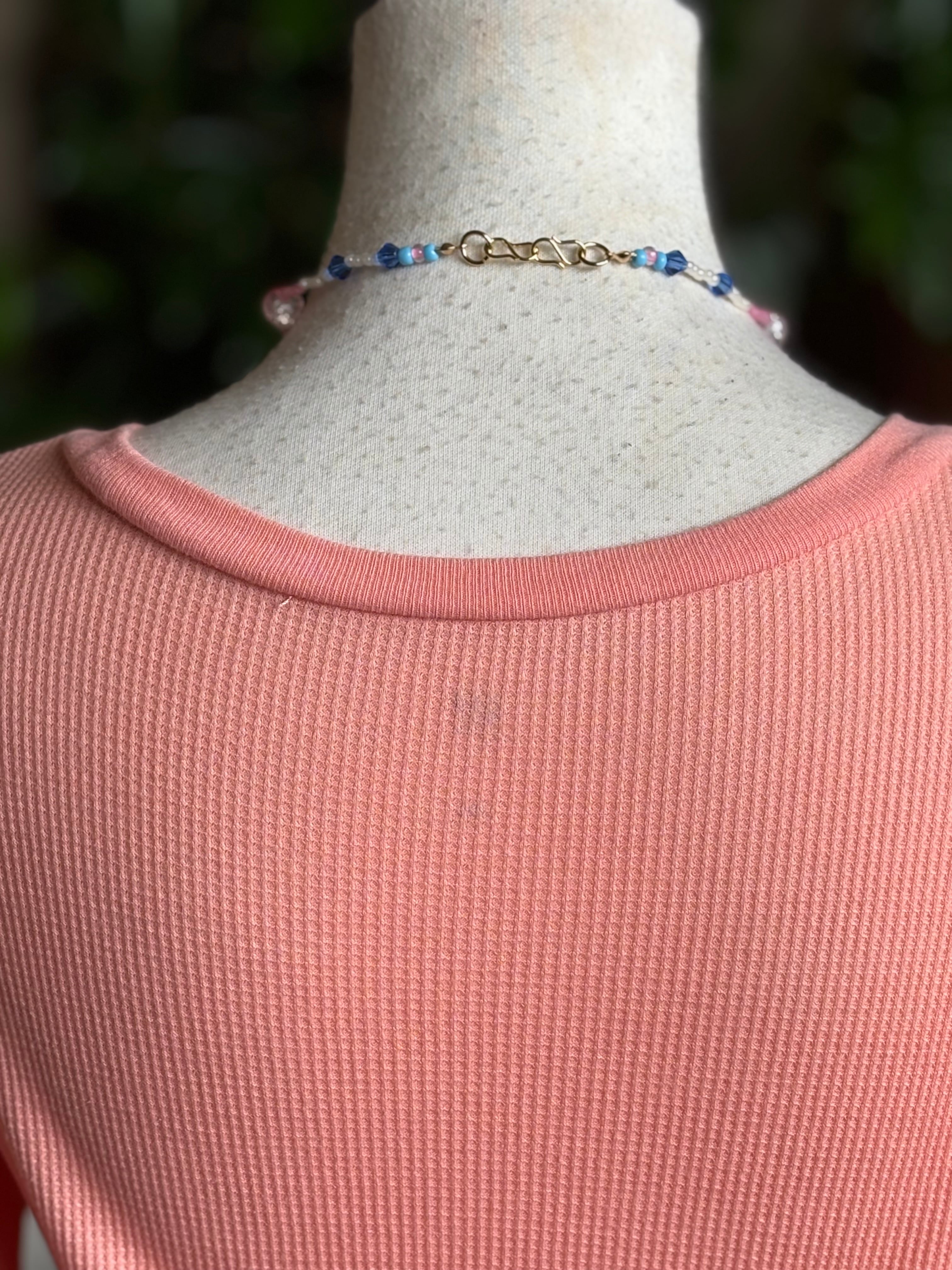 クリアホワイトをベースに、ピンクとブルーのガラスビーズをバランスよく配置し、軽やかで透明感のある印象に仕上げました。