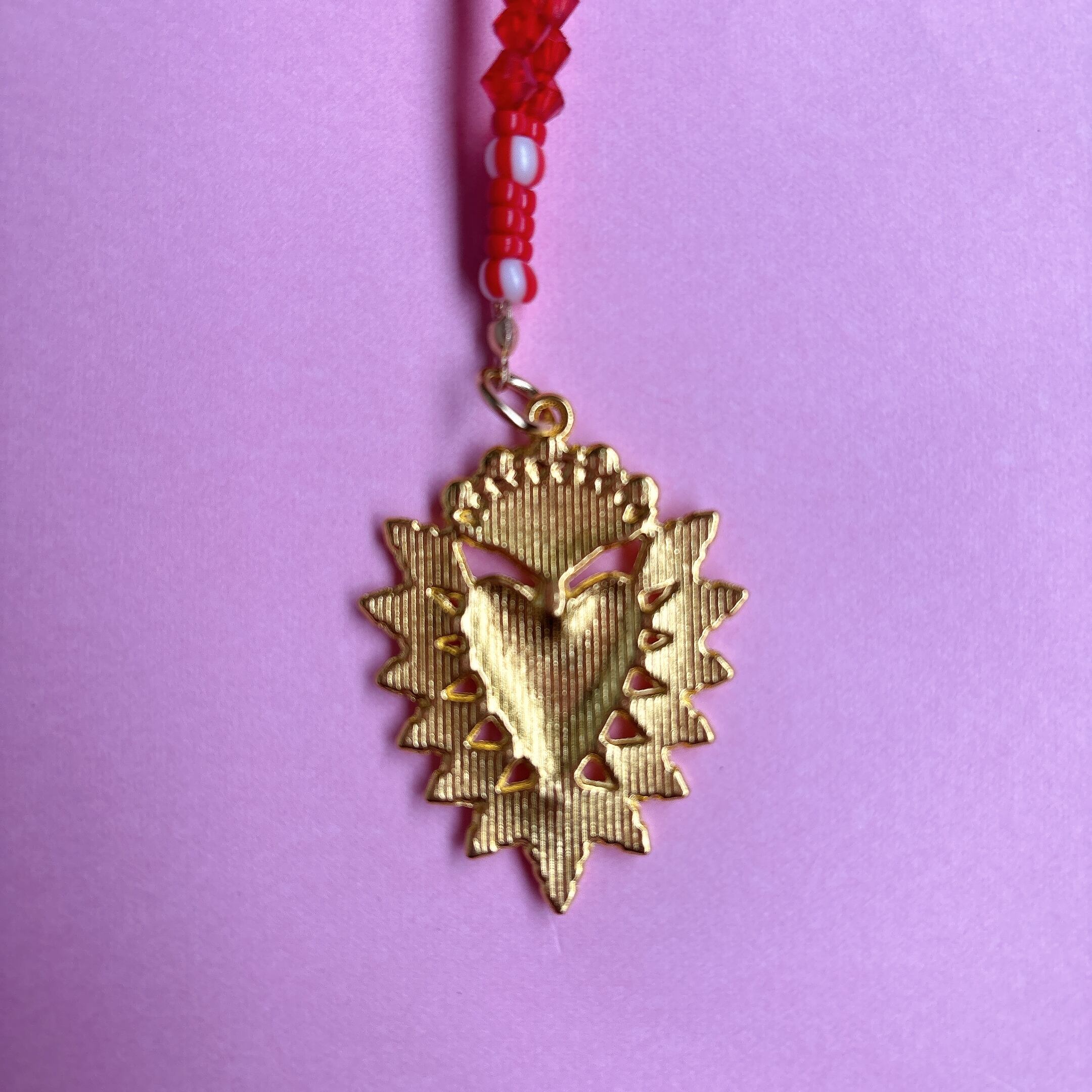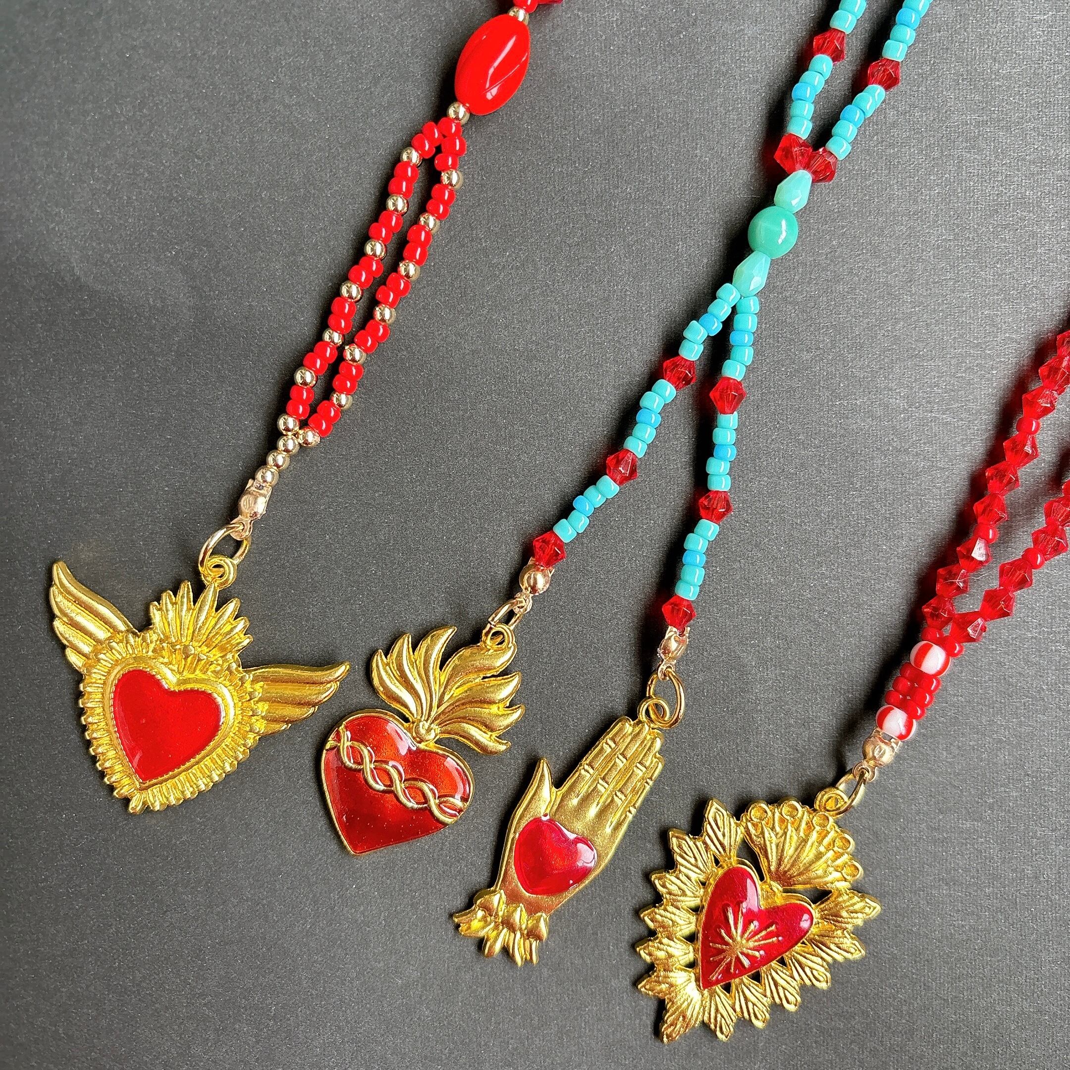 ◾️ 鮮やかなレッドビーズに、存在感のあるハートモチーフを合わせたネックレス。