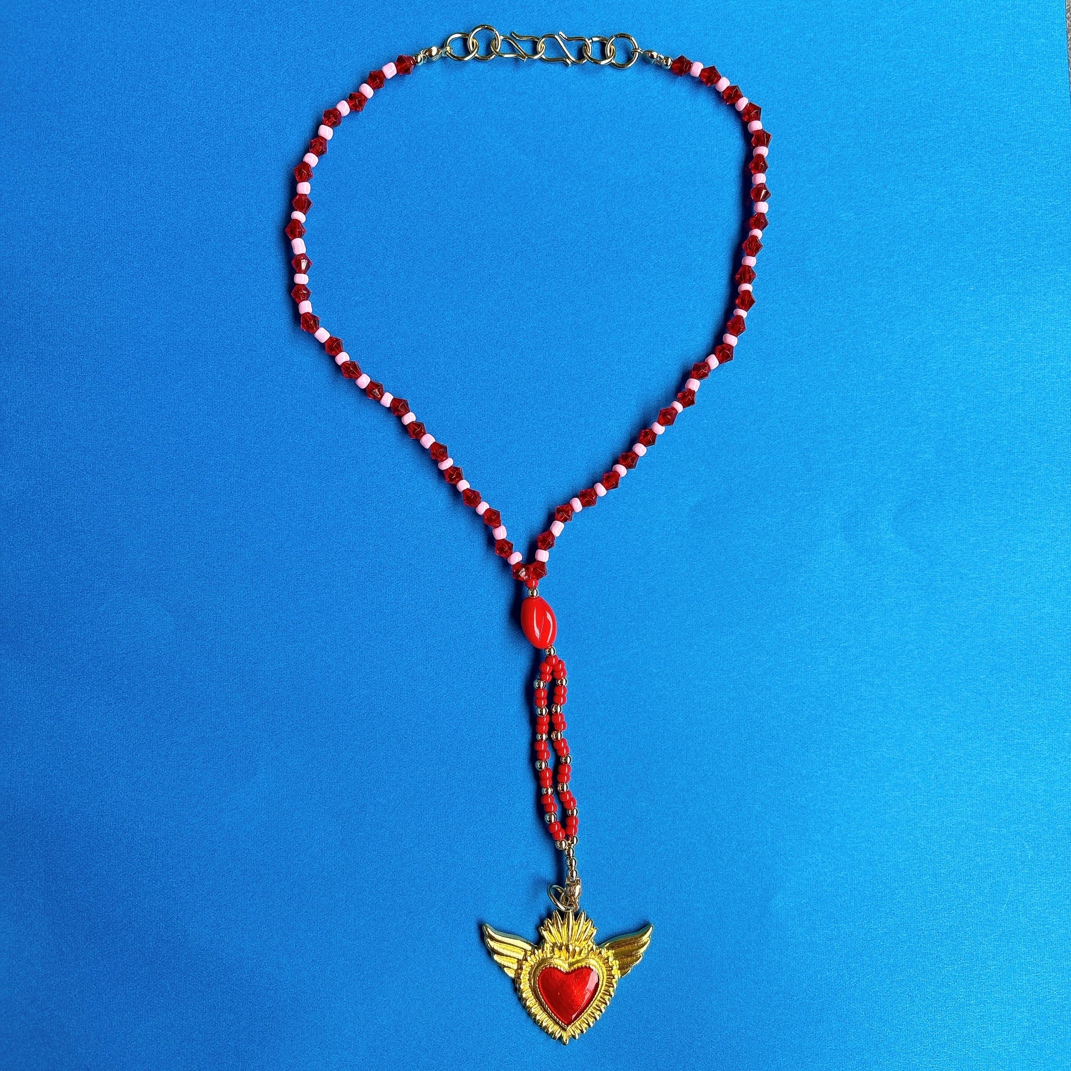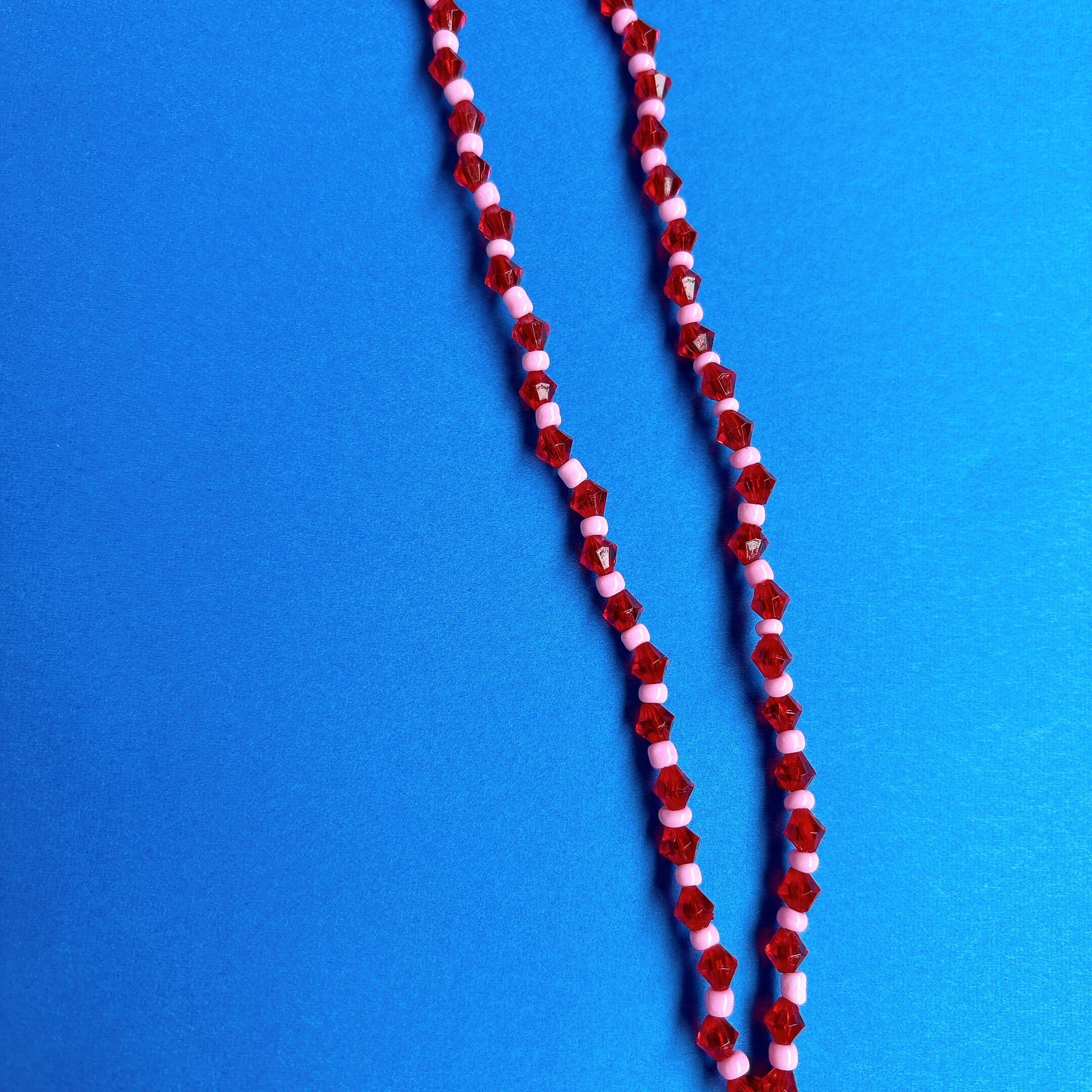 ◾️ 鮮やかなレッドとホワイトのビーズを組み合わせた、存在感のあるネックレス。