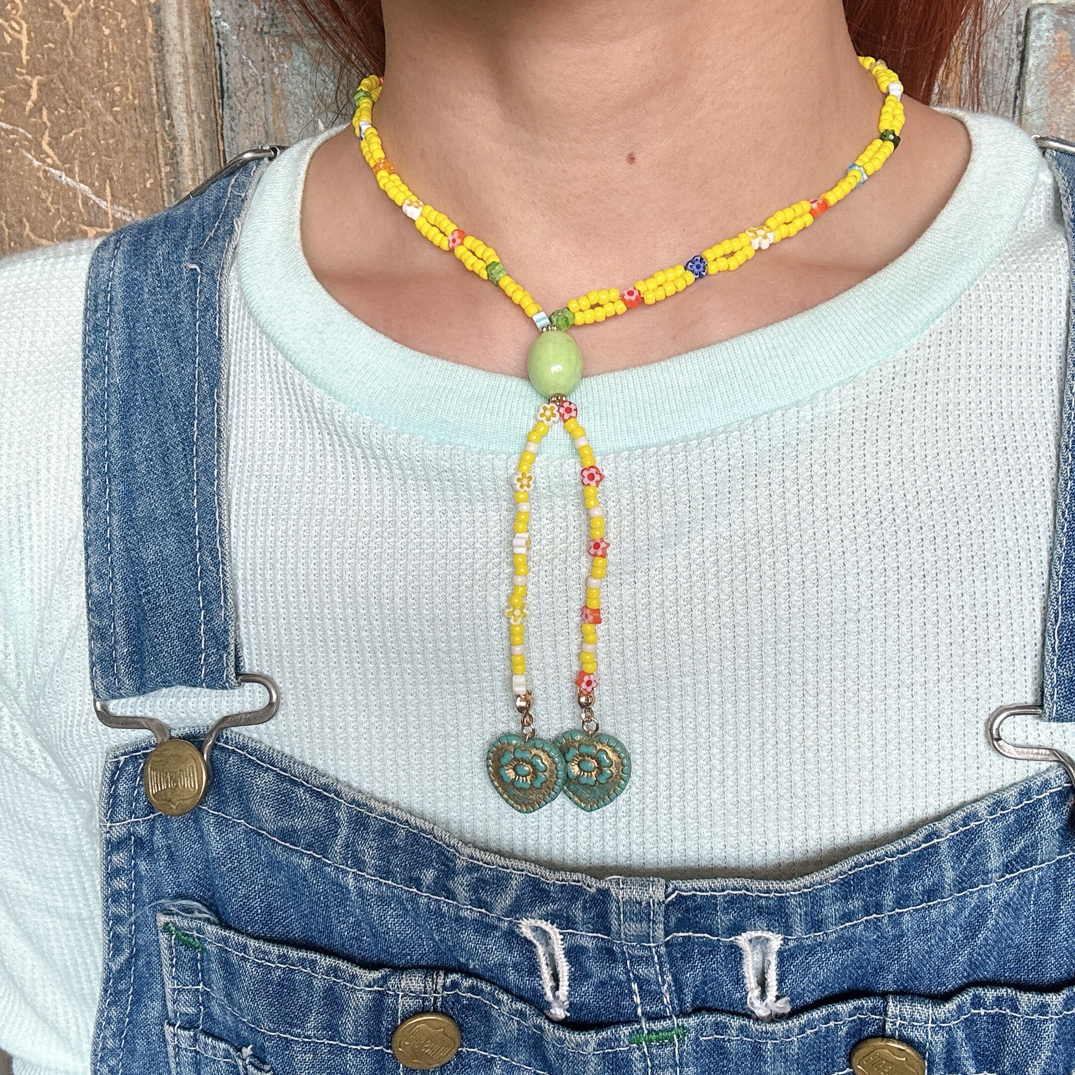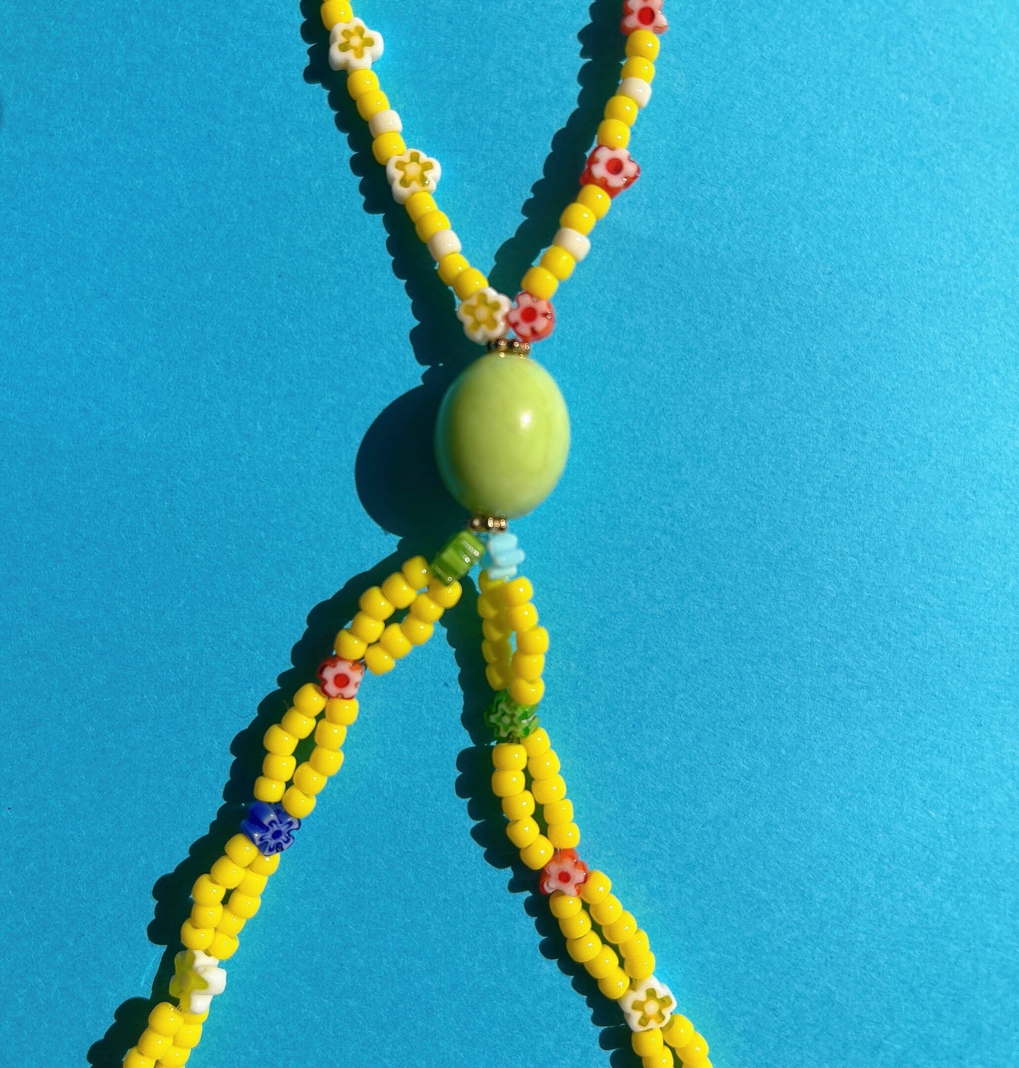 ◾️ 鮮やかなイエローをベースに、カラフルなフラワービーズを散りばめたY字デザインのビーズネックレス。中央にはやさしいグリーンのラウンドビーズを配し、そこから分かれる2本のラインが軽やかな動きを演出します。