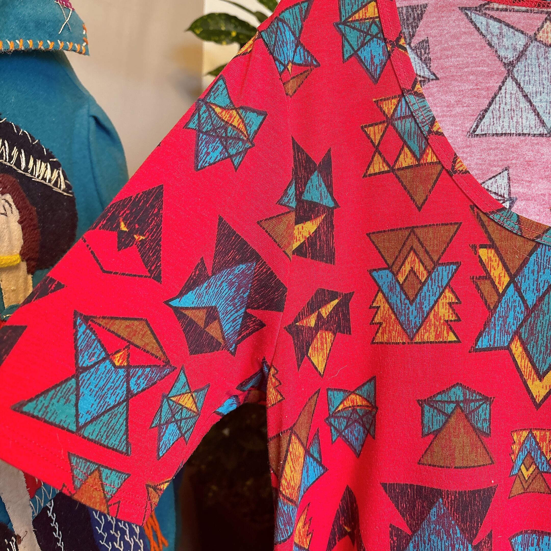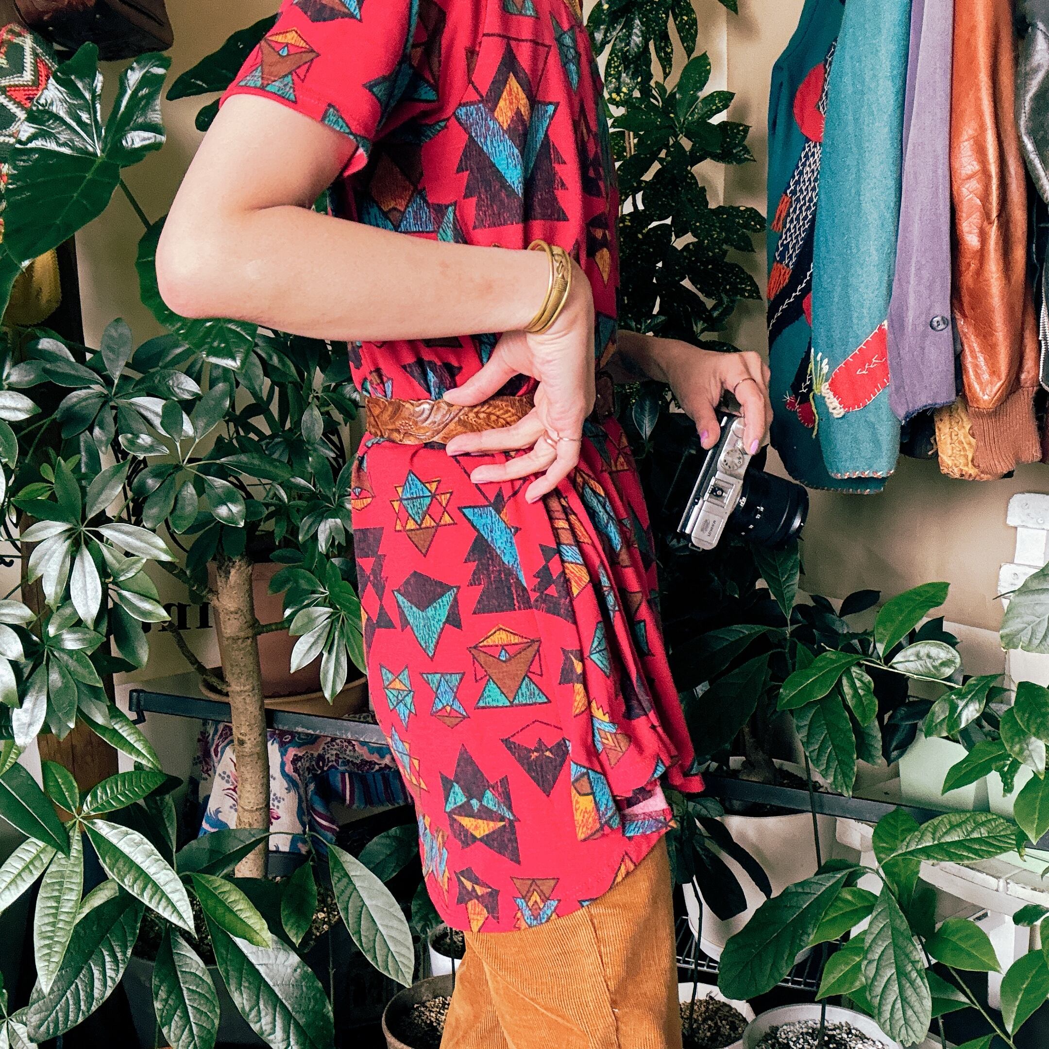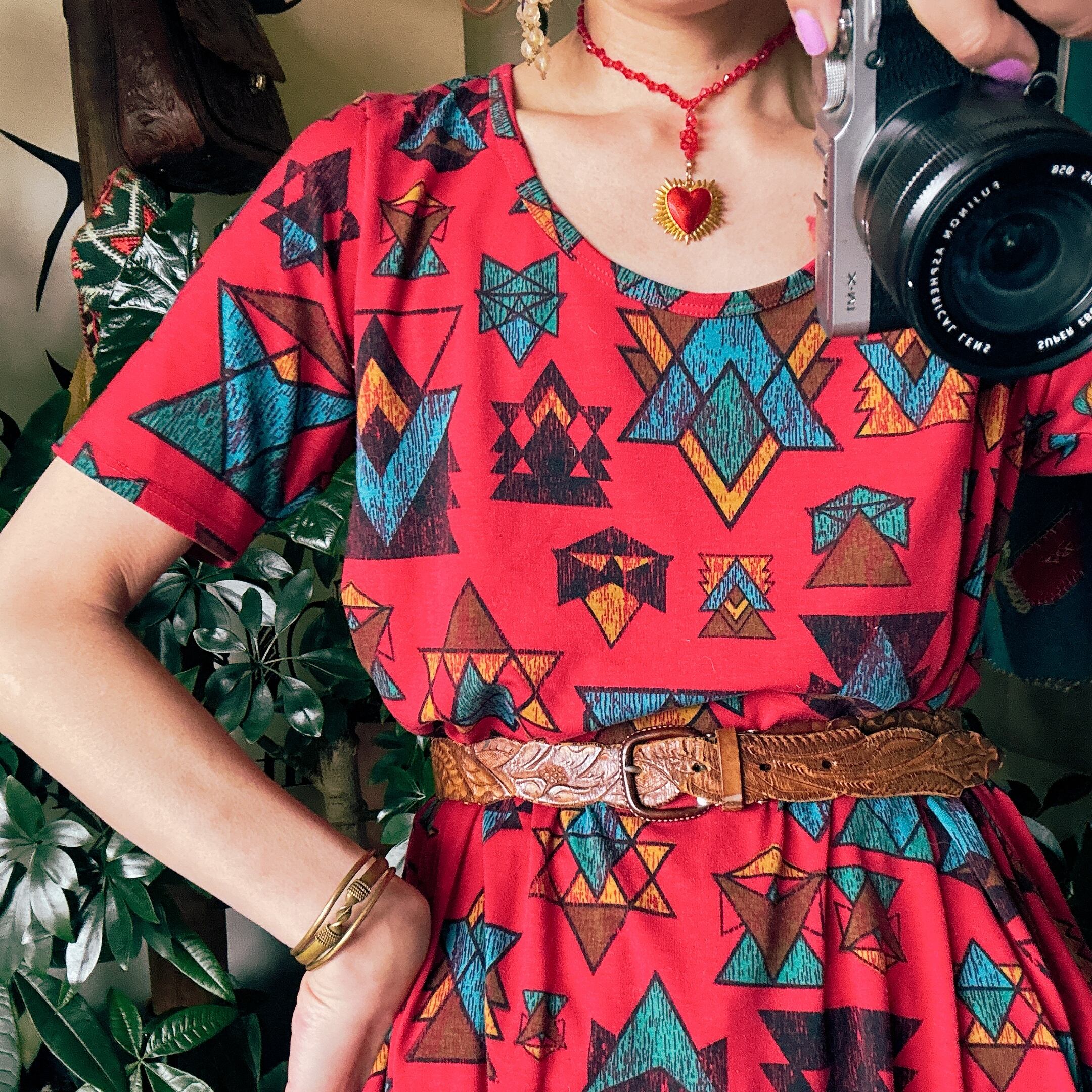 ◾️鮮やかなヴィンテージレッドに、エキゾチックな幾何学模様が映える主役級の一枚です。
