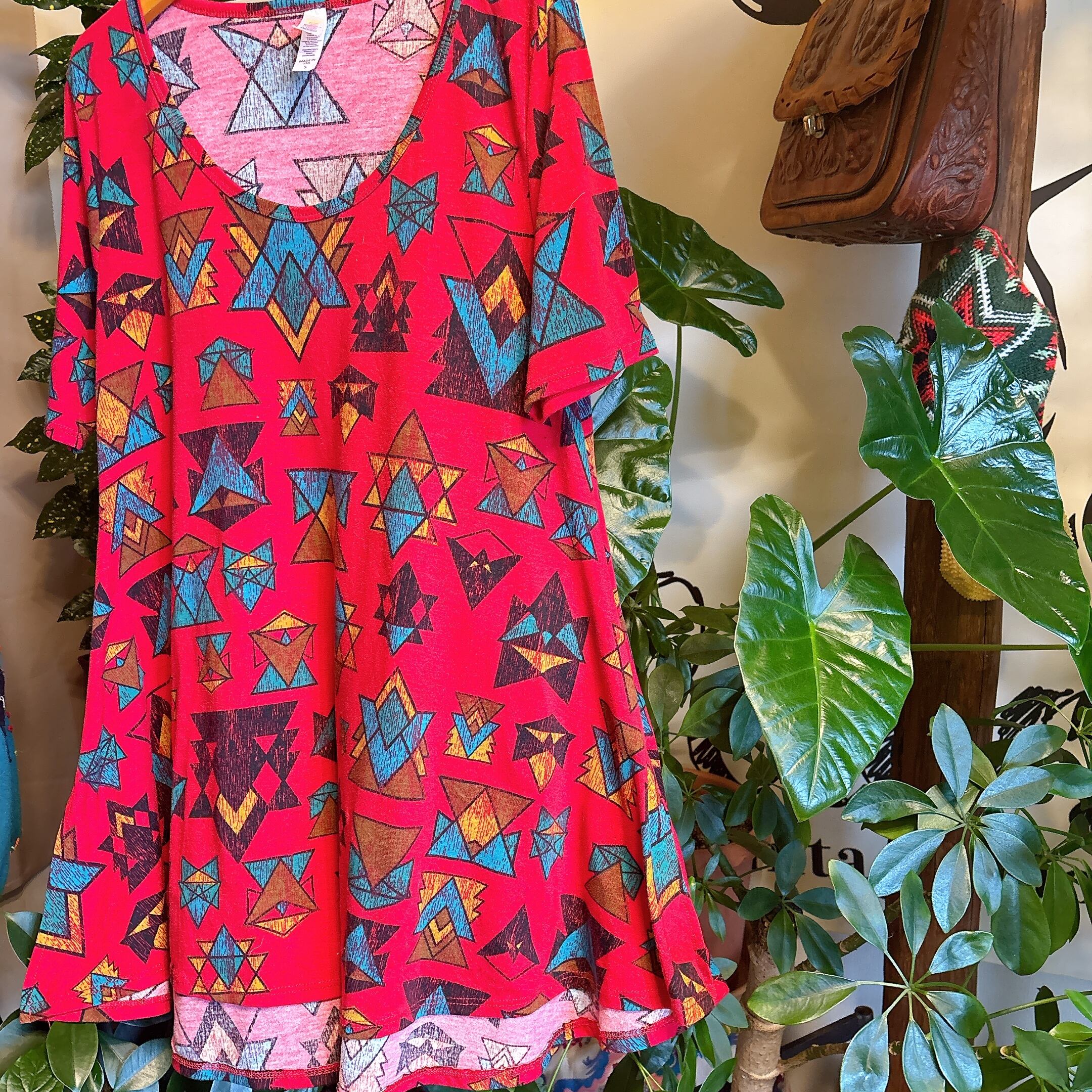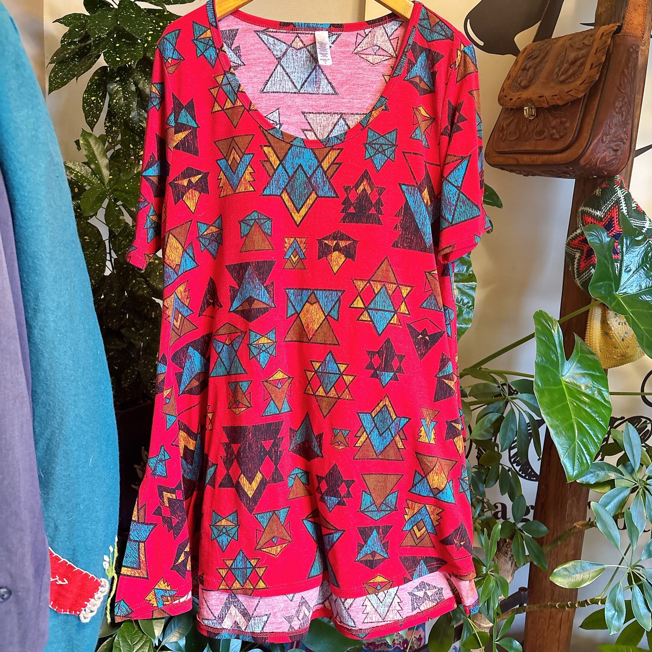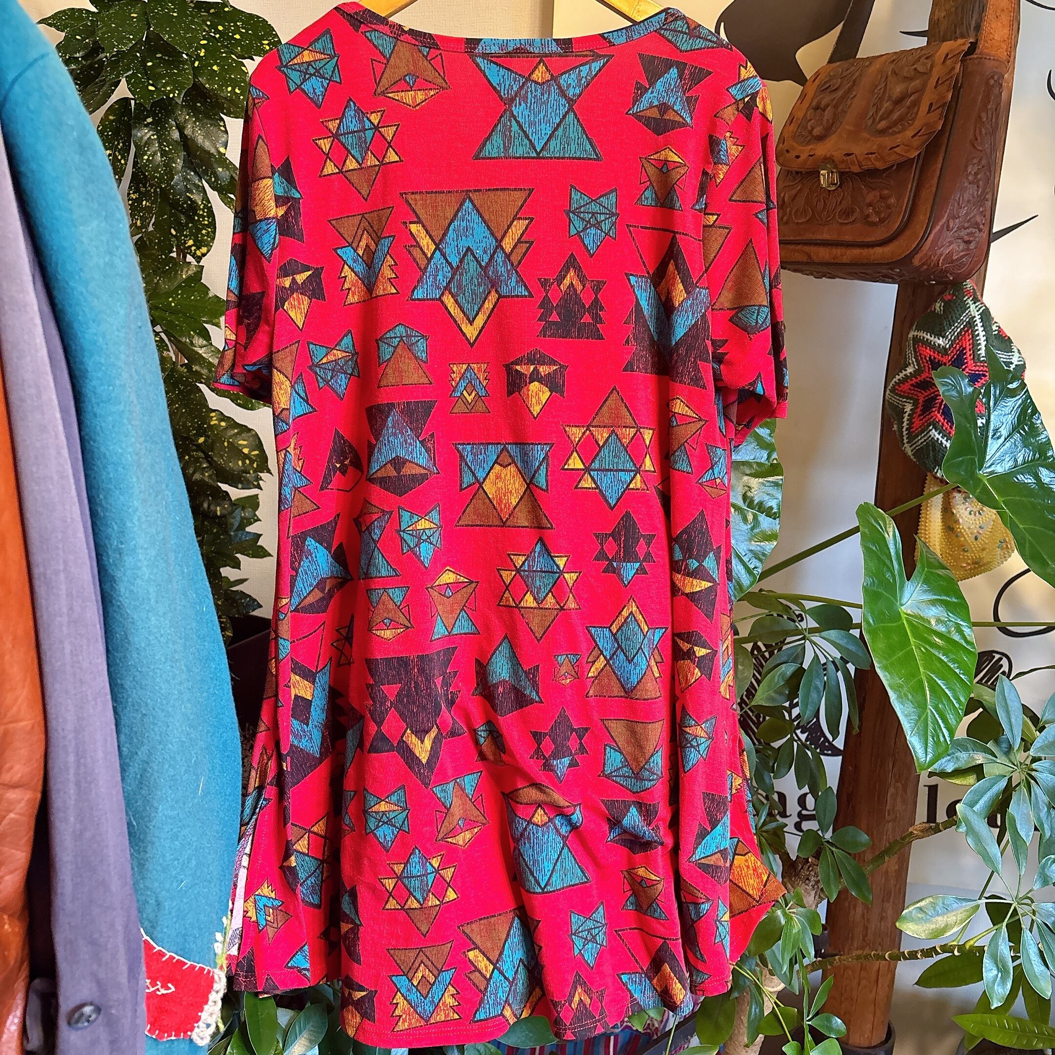 ◾️鮮やかなヴィンテージレッドに、エキゾチックな幾何学模様が映える主役級の一枚です。