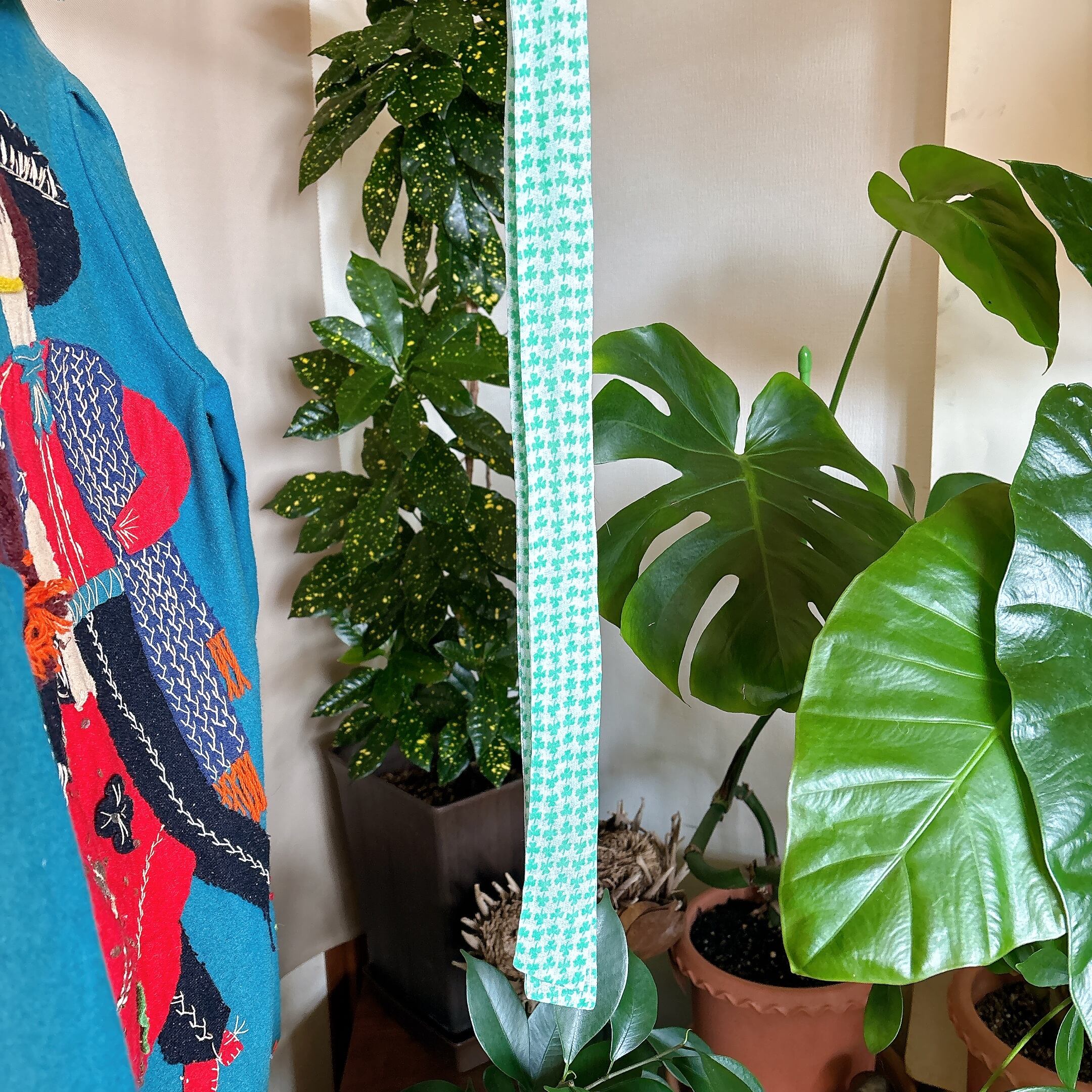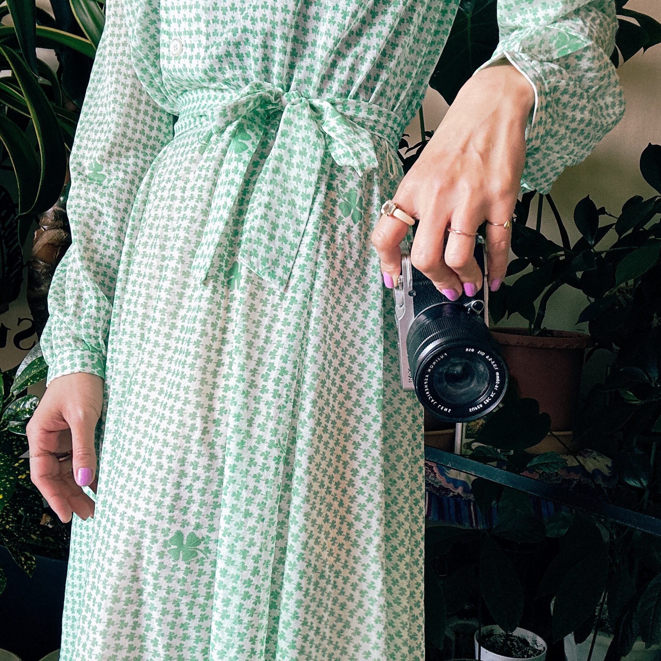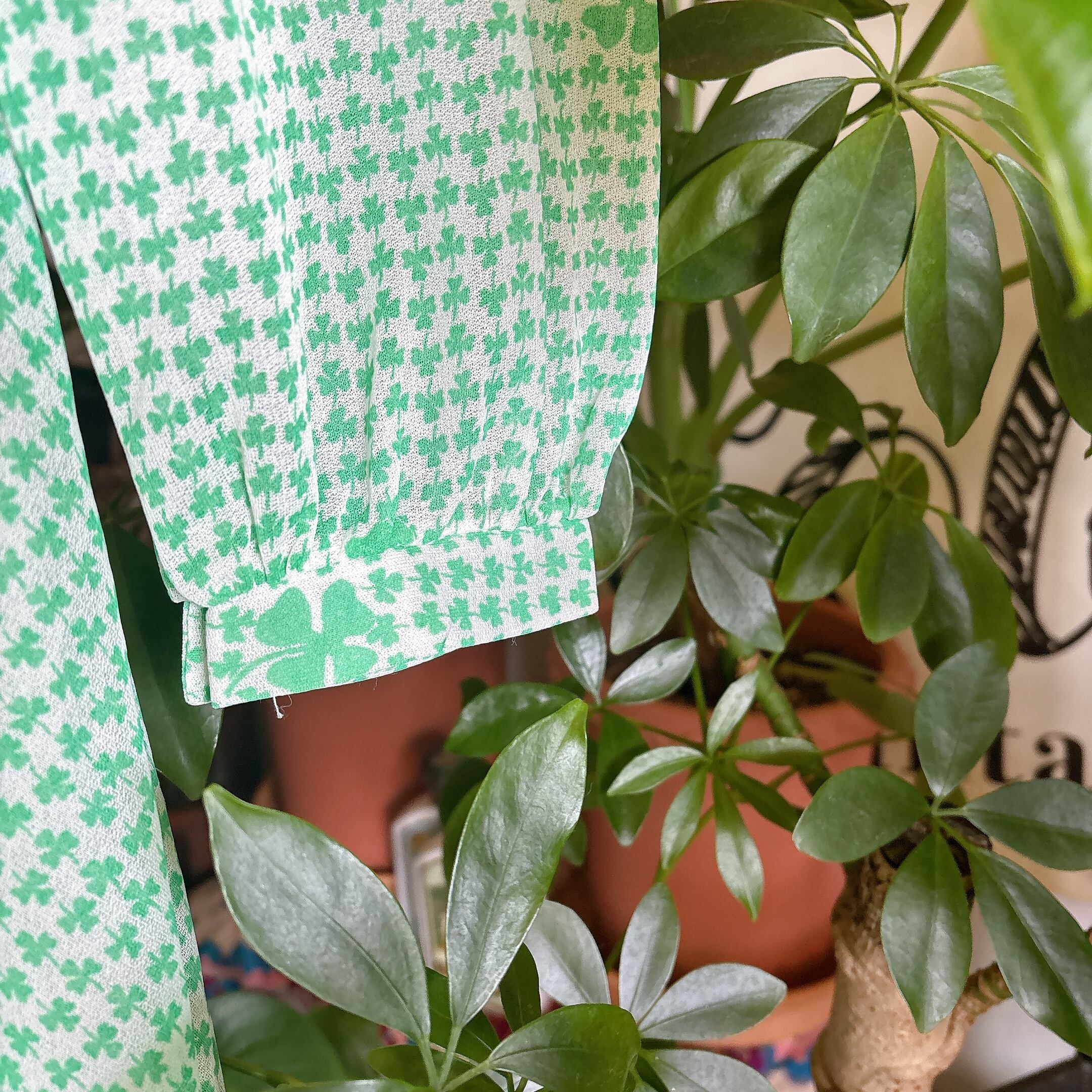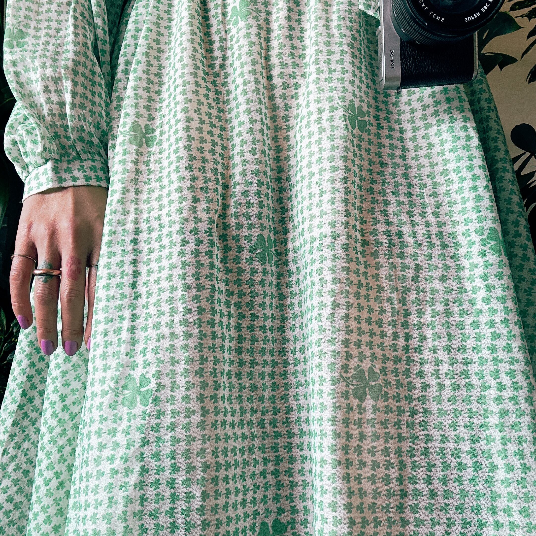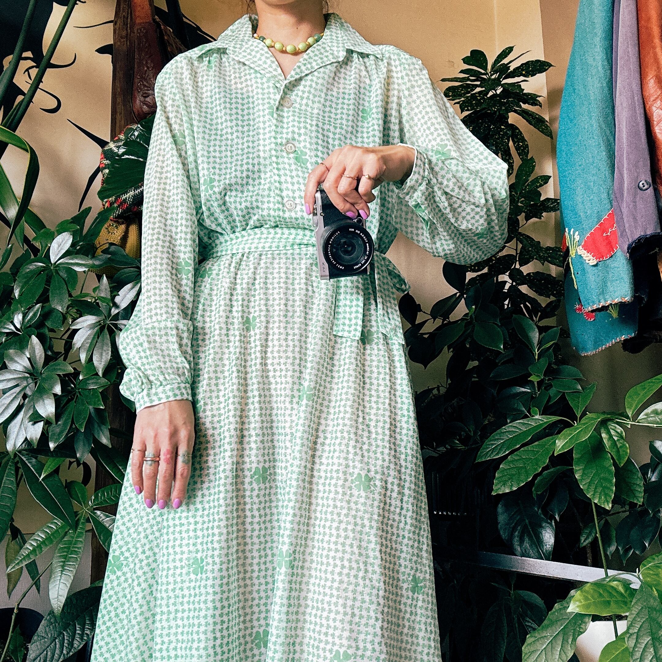 ◾️ グリーンのクローバー柄が全面に施された、爽やかで印象的なヴィンテージワンピース。