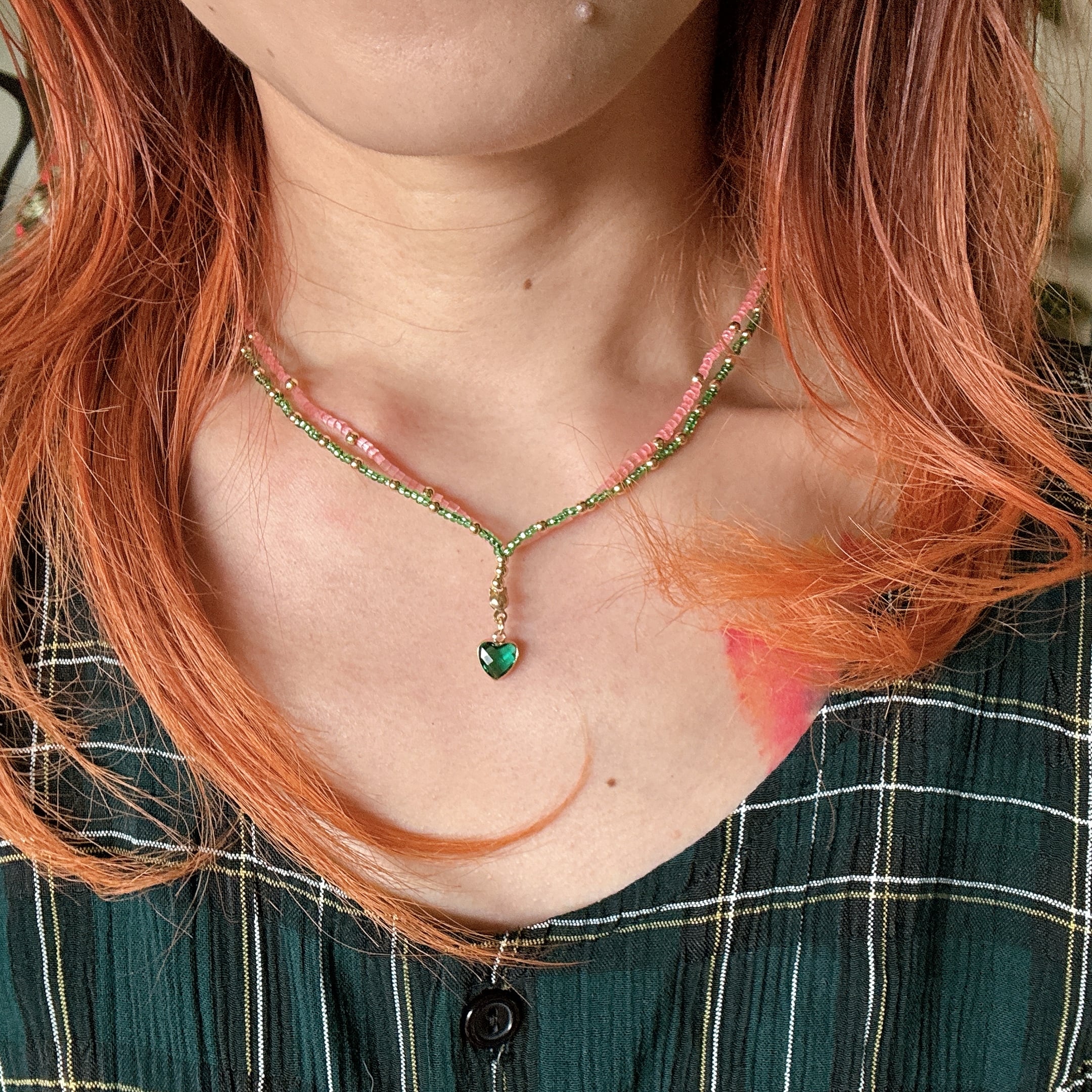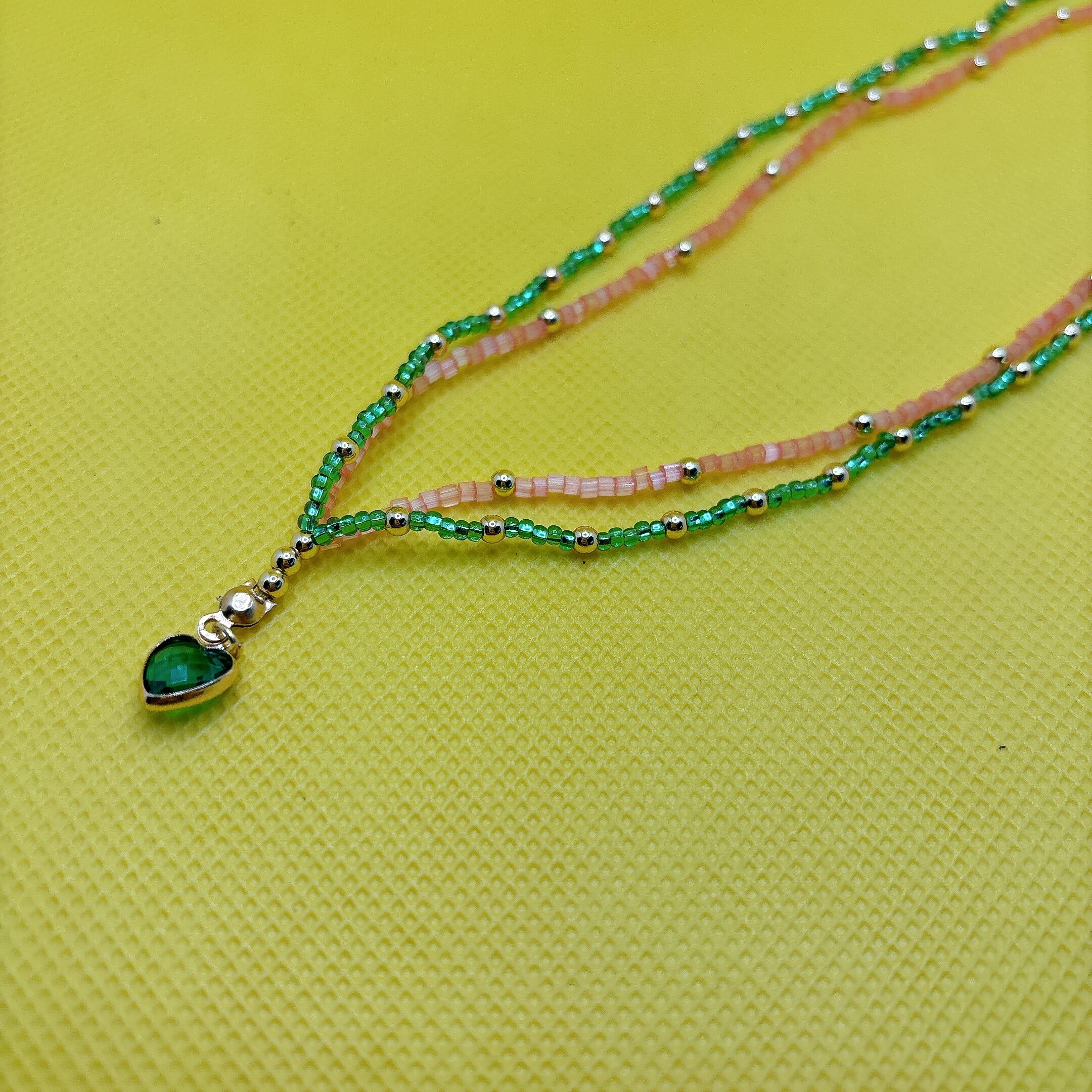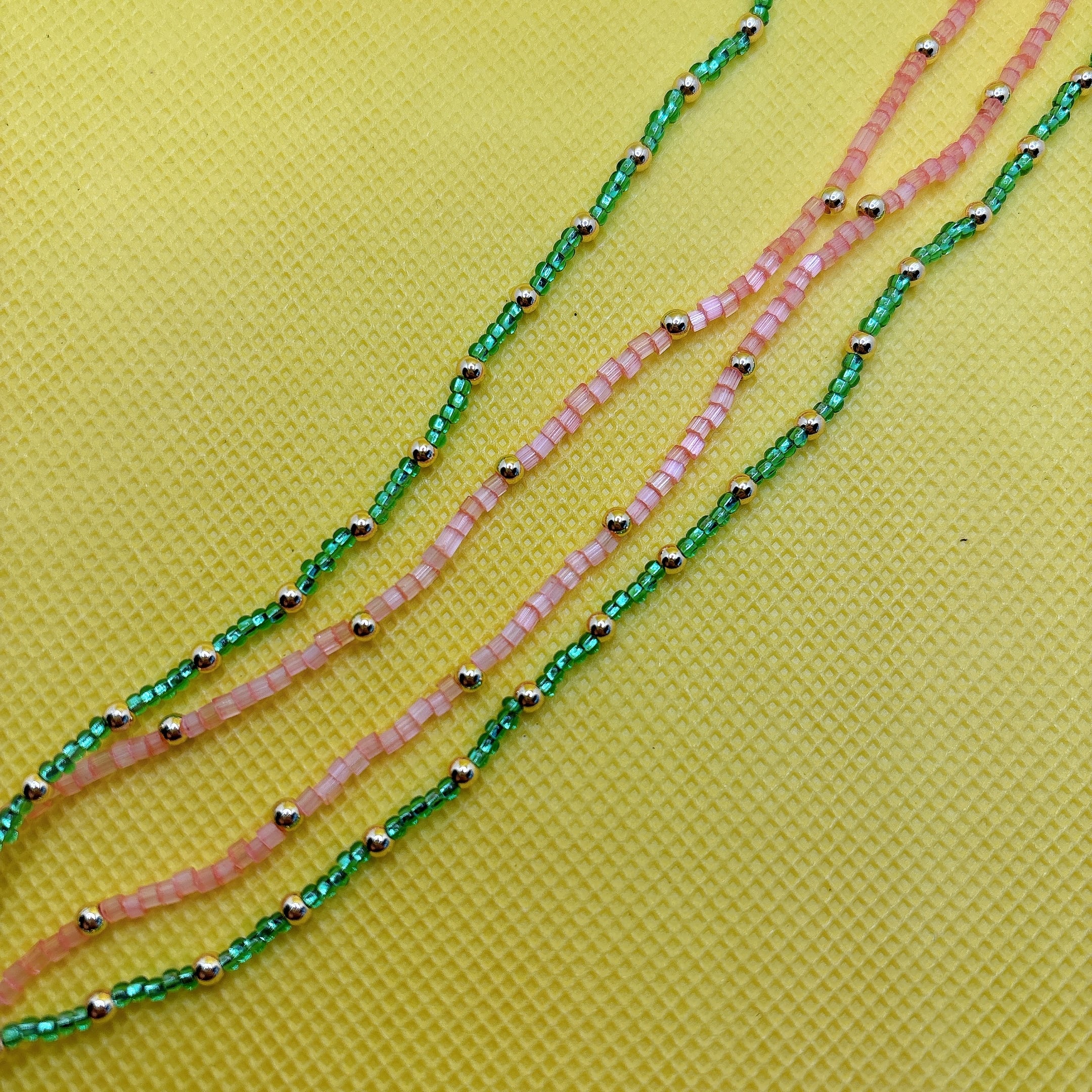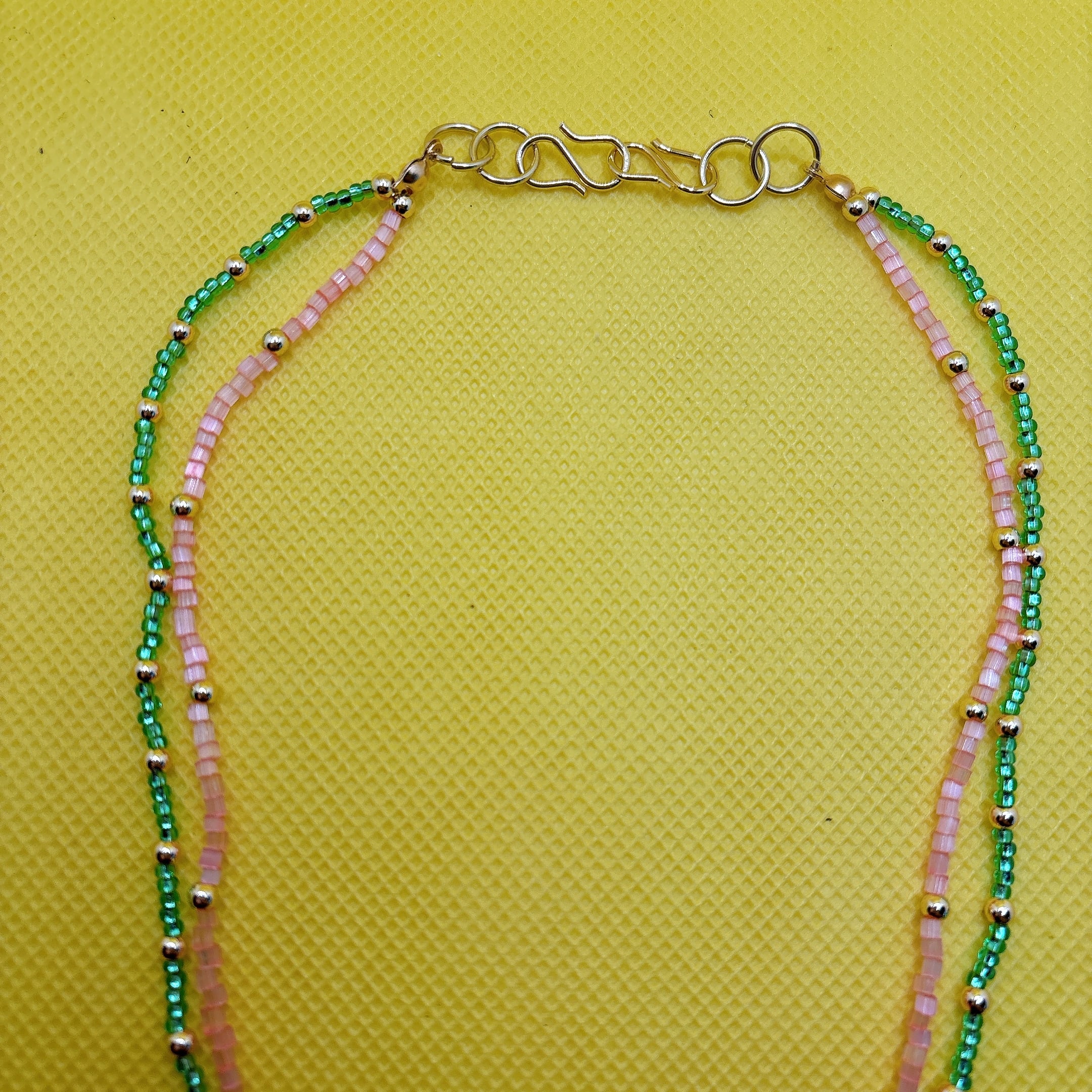 ◾️ グリーン、ピンク、ゴールドの小粒なシードビーズやグラスビーズを組み合わせたマルチカラーのデザインです。 細身のビーズネックレスで、シンプルに1本で着けるだけでなく、他のネックレスとレイヤードにも適したスタイルです。