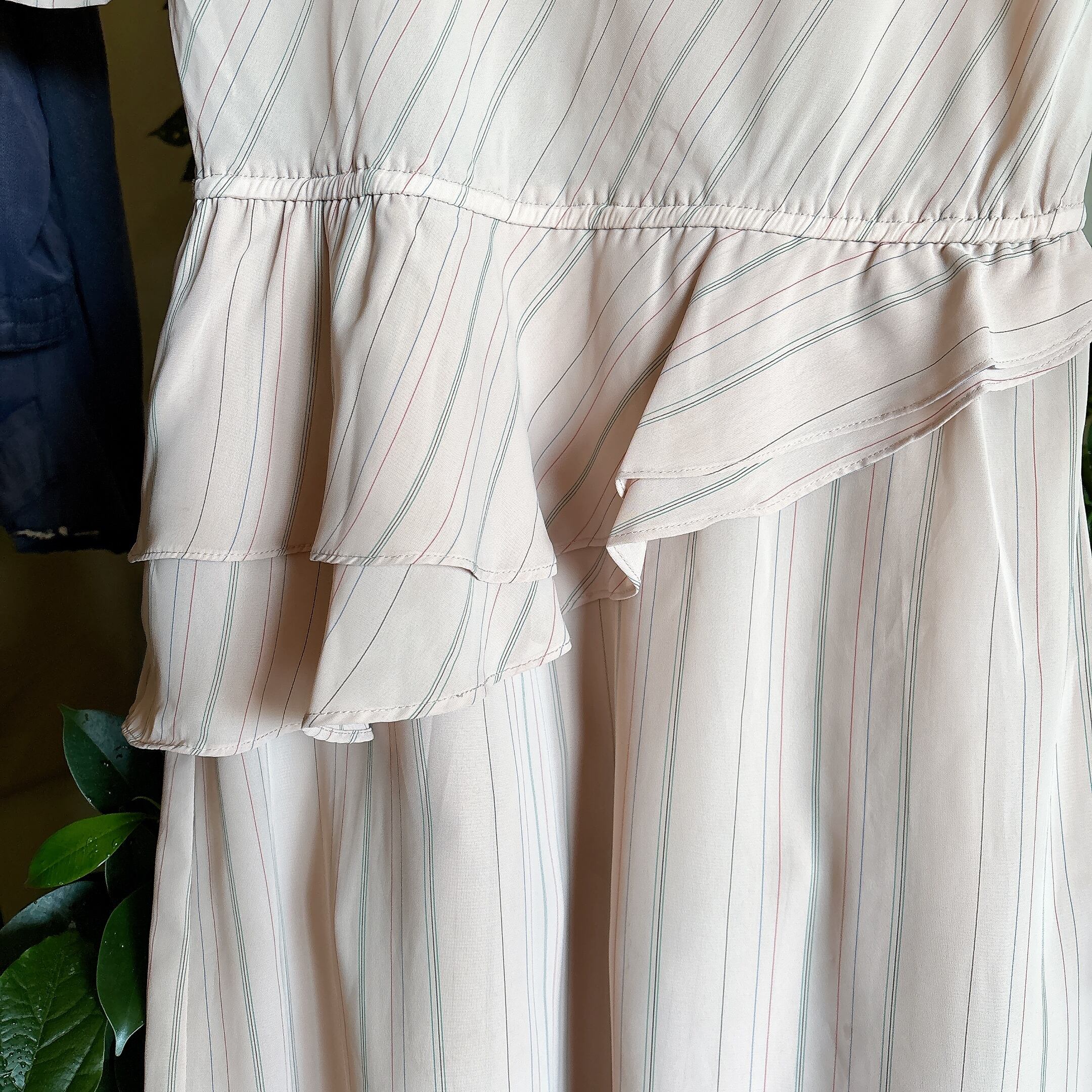 肩口の控えめなパフスリーブと、ウエストに施されたアシンメトリーなティアードフリル(ペプラム)が、クラシックな女性らしさを引き立てます。またウエストが程よくシェイプされており、スタイルアップ効果も期待できる洗練されたミディ丈のデザインです。