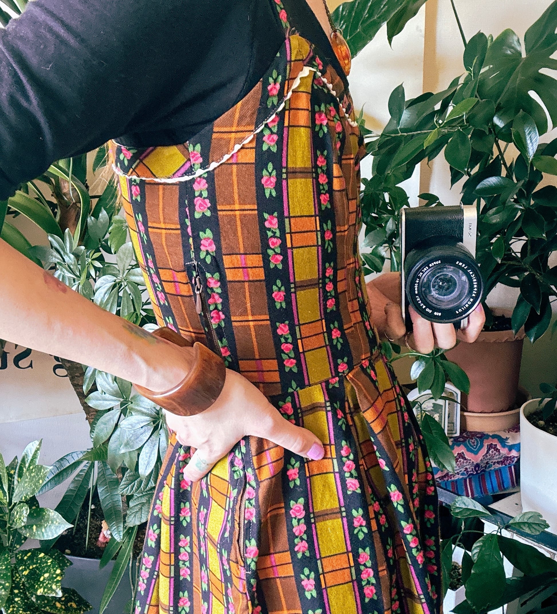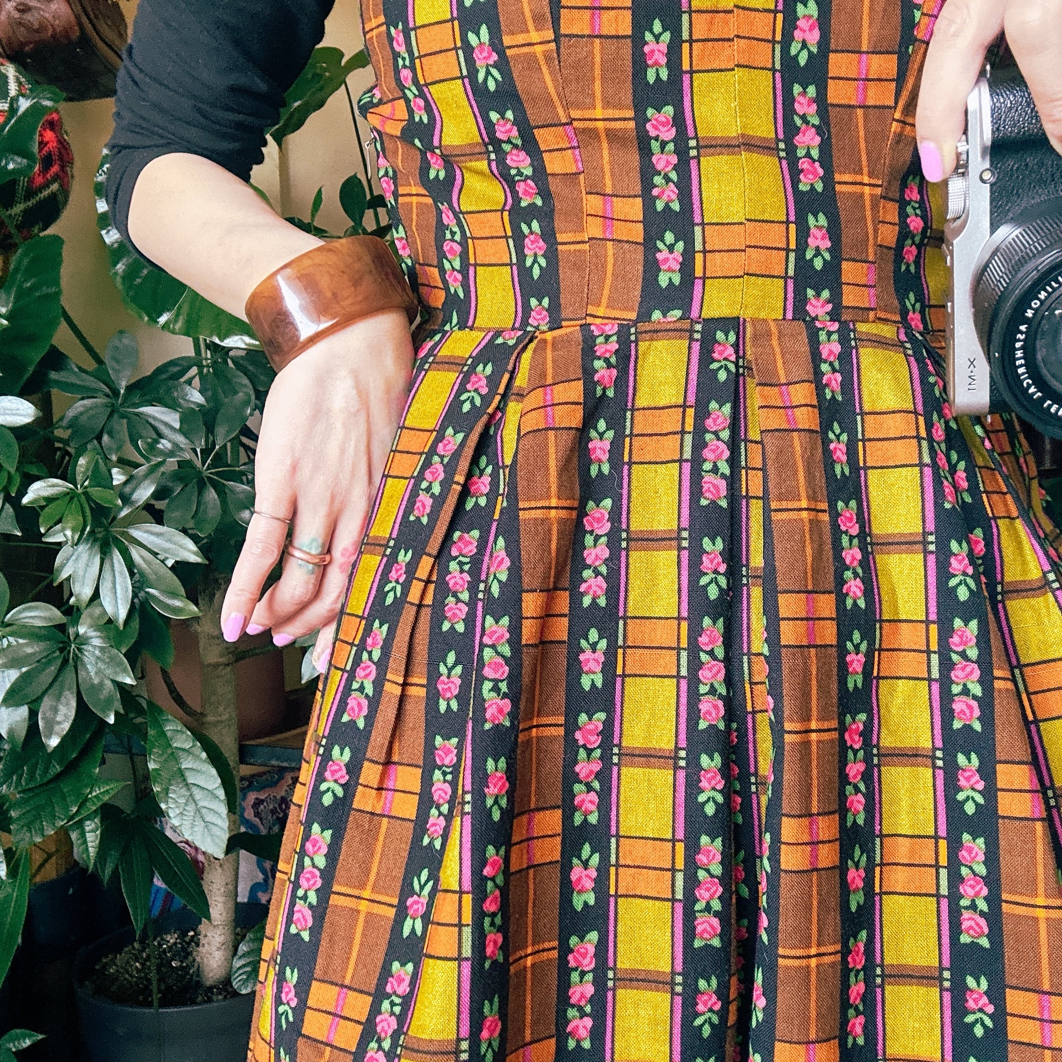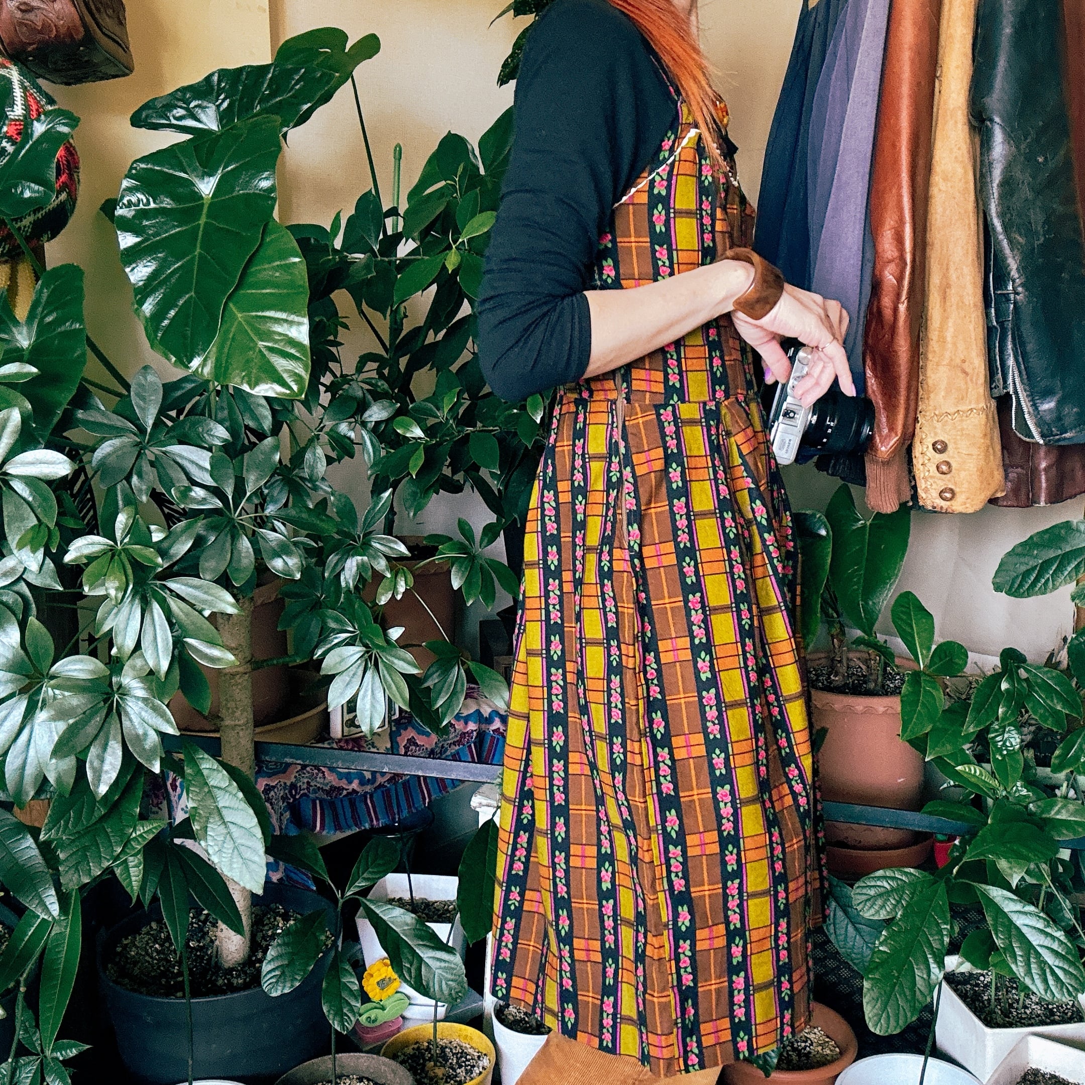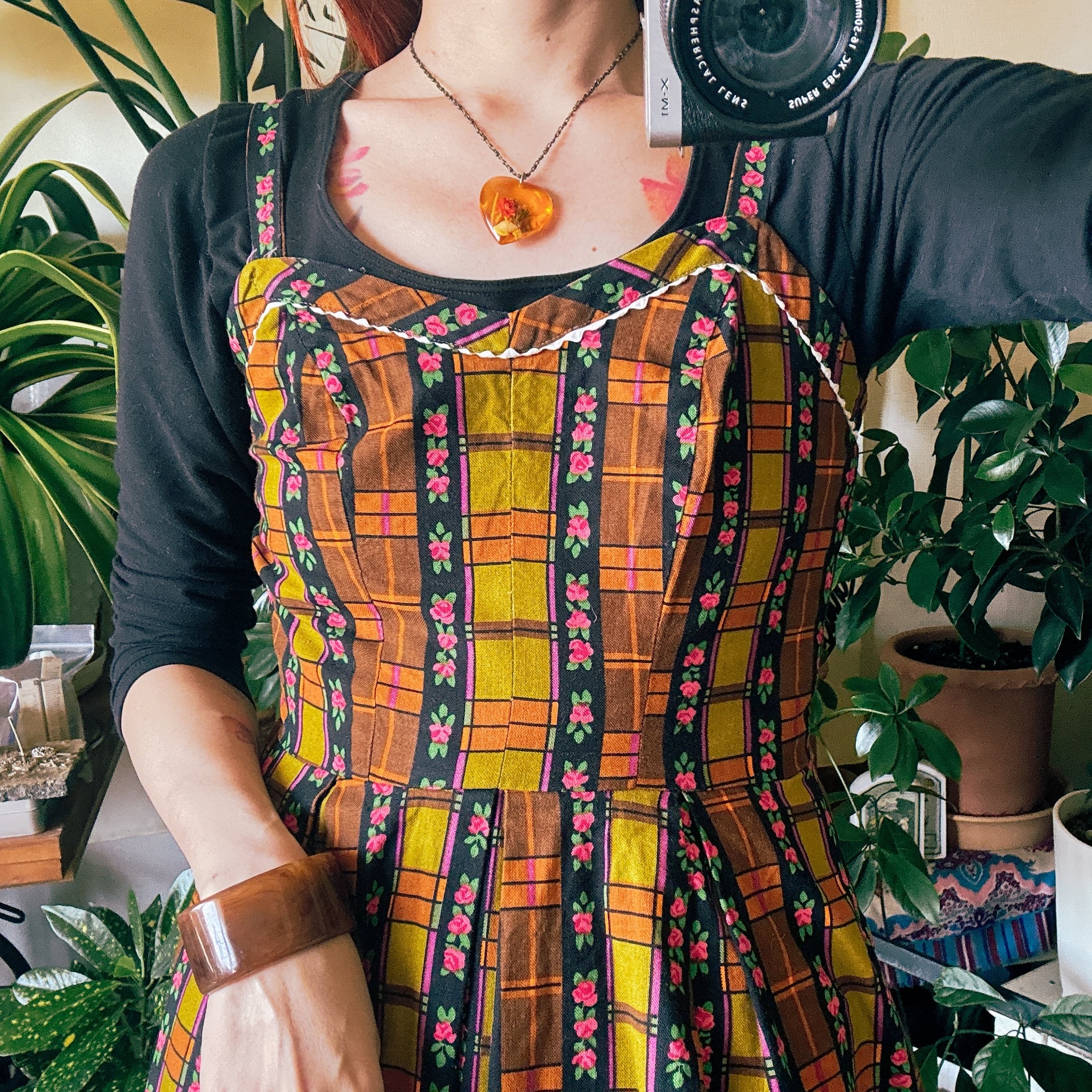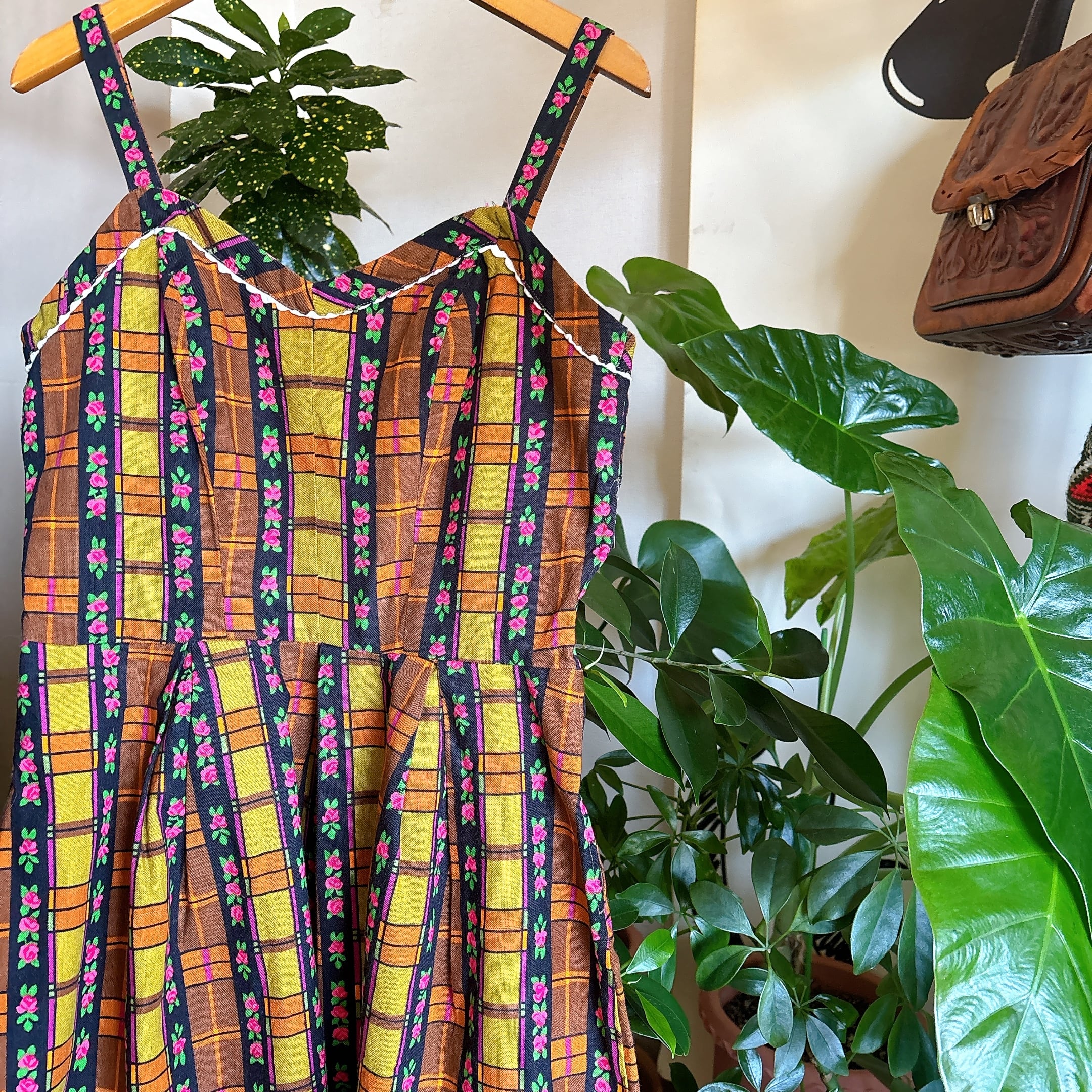 ◾️ 1970年代らしい温かみのある配色と、フラワーストライプ×チェック柄が印象的なエプロンワンピースです。