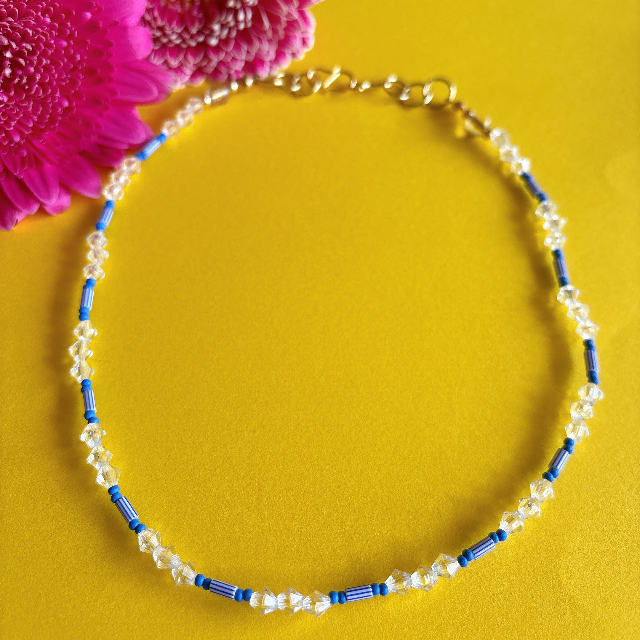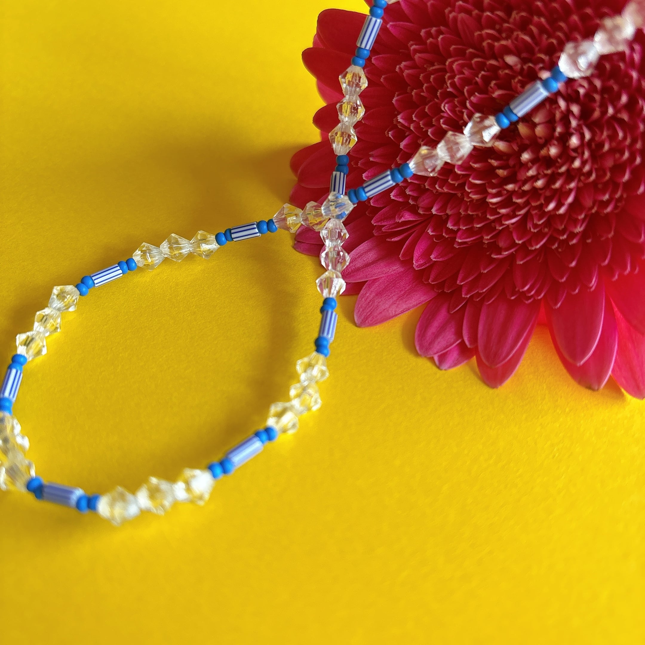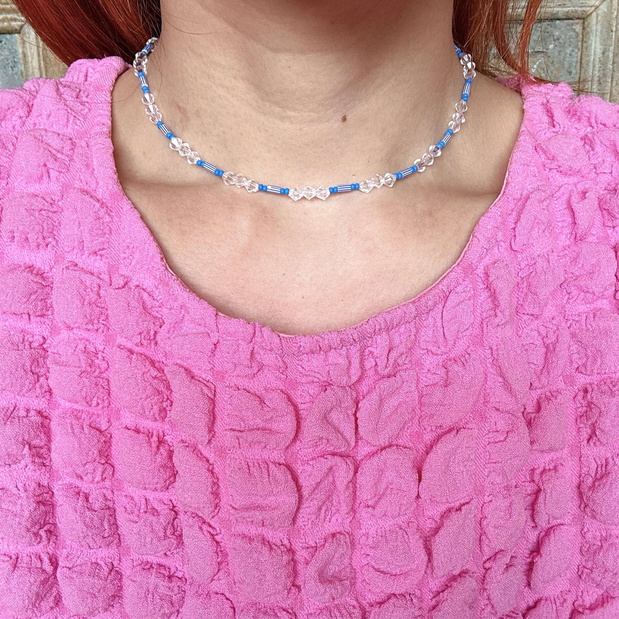 ◾️ 透明感のあるクリアビーズに、爽やかなブルーのアクセントを効かせたネックレス。