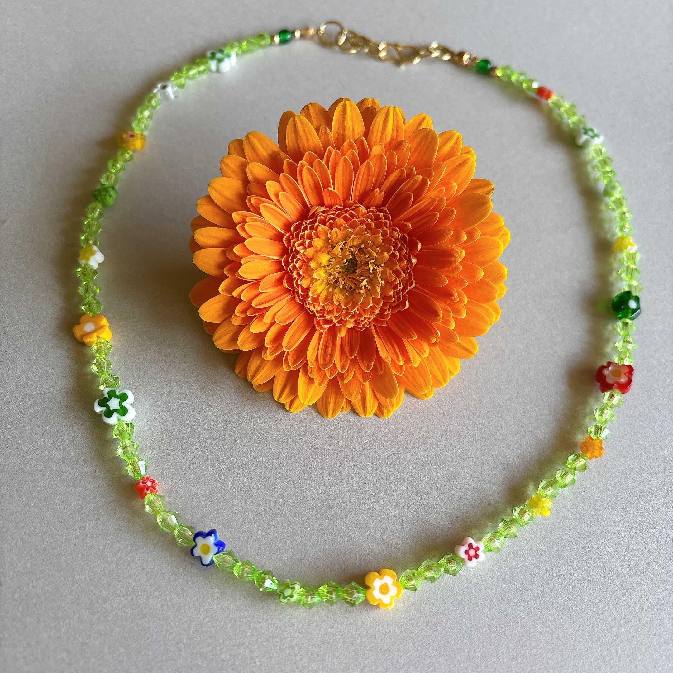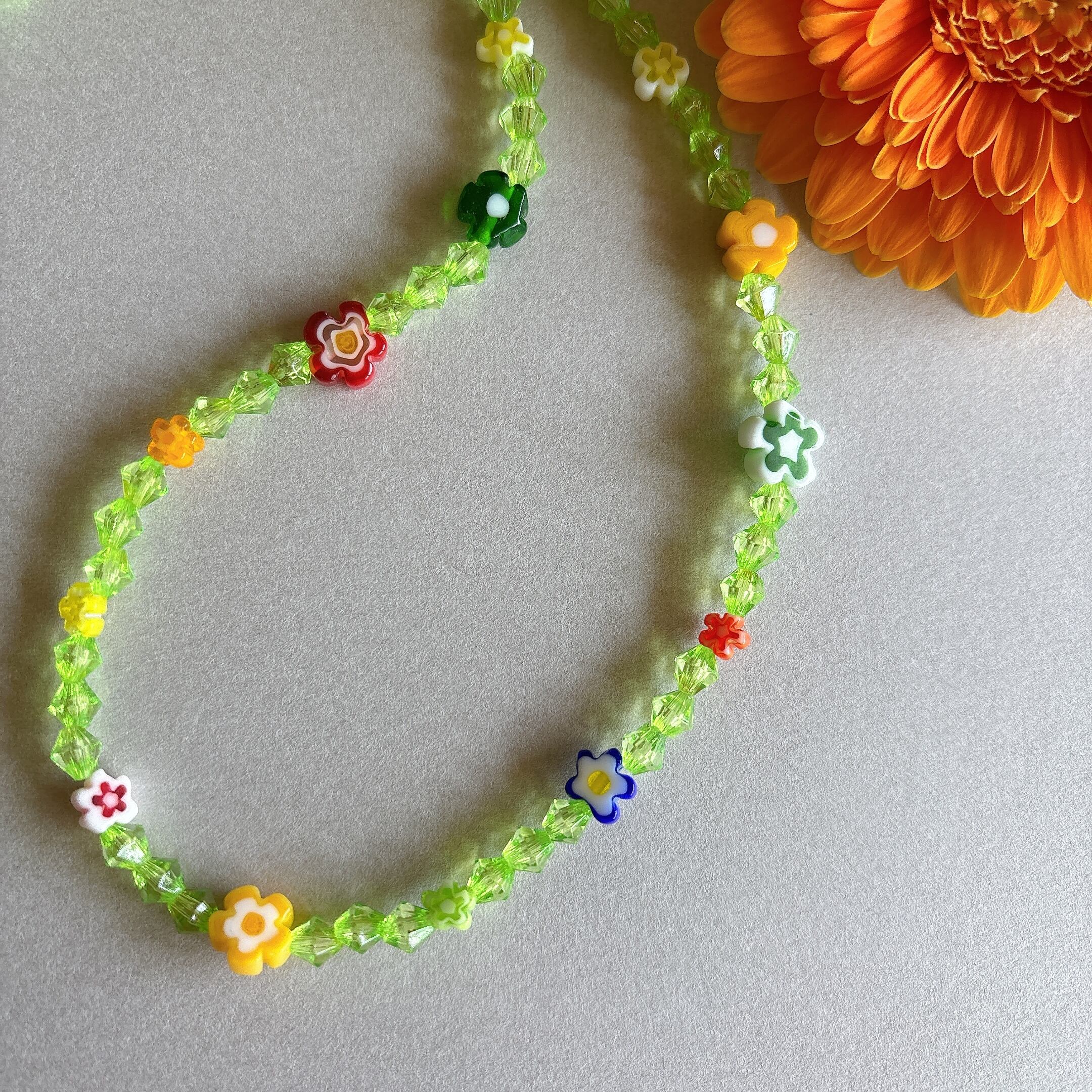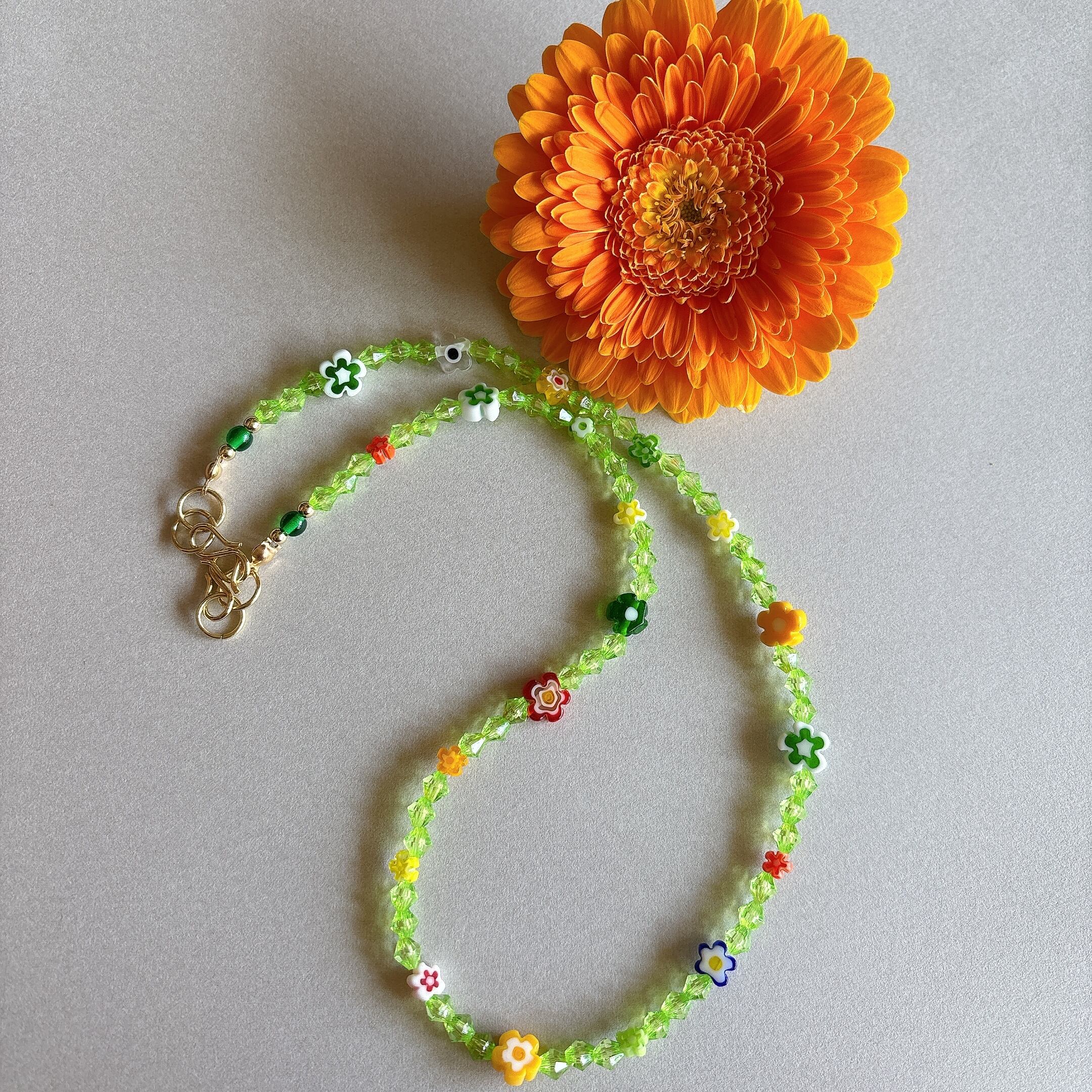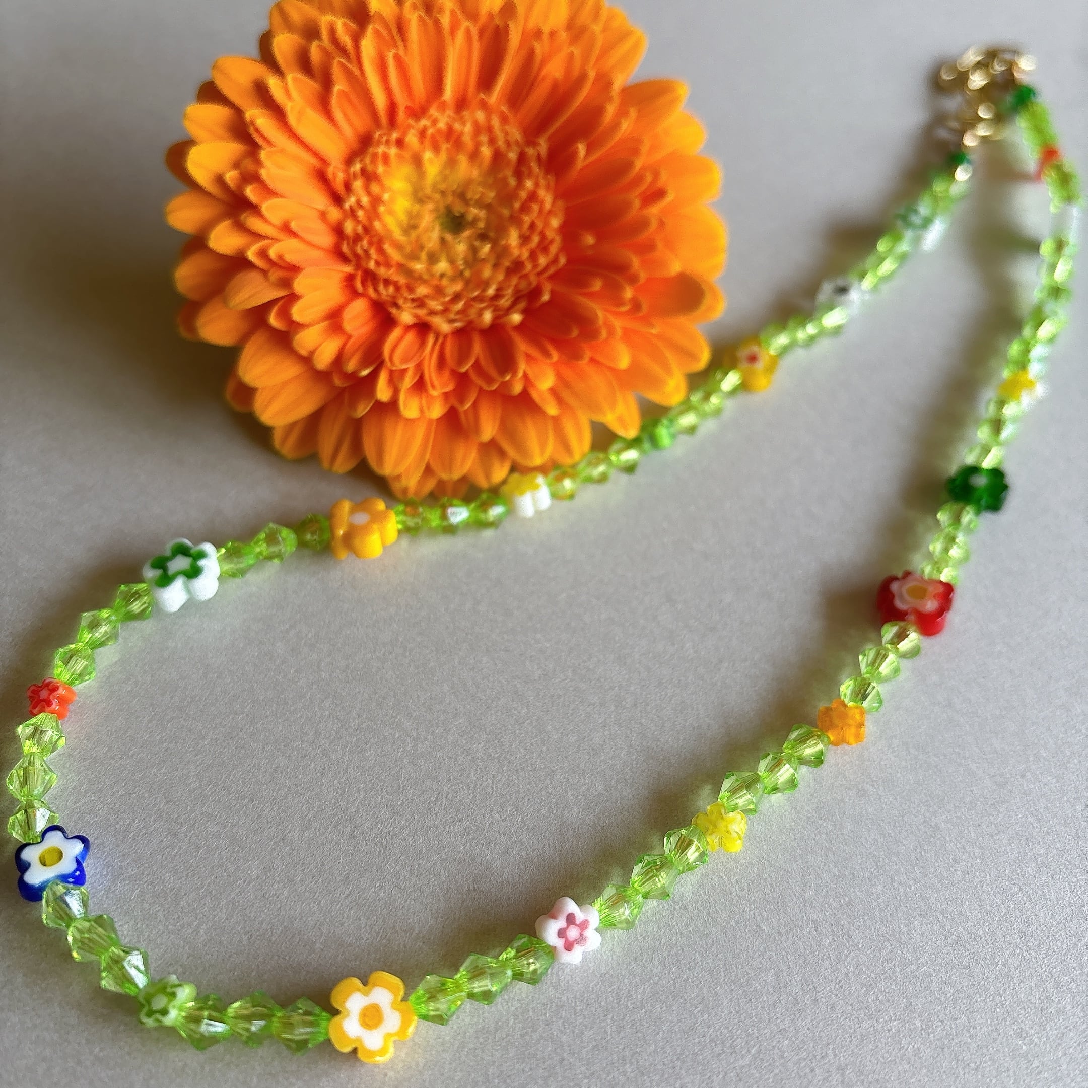 ◾️ 淡いグリーンのクリアビーズをベースに、カラフルなフラワーモチーフを散りばめたネックレス。軽やかで遊び心のあるデザインが、コーディネートに明るさと抜け感をプラスします。