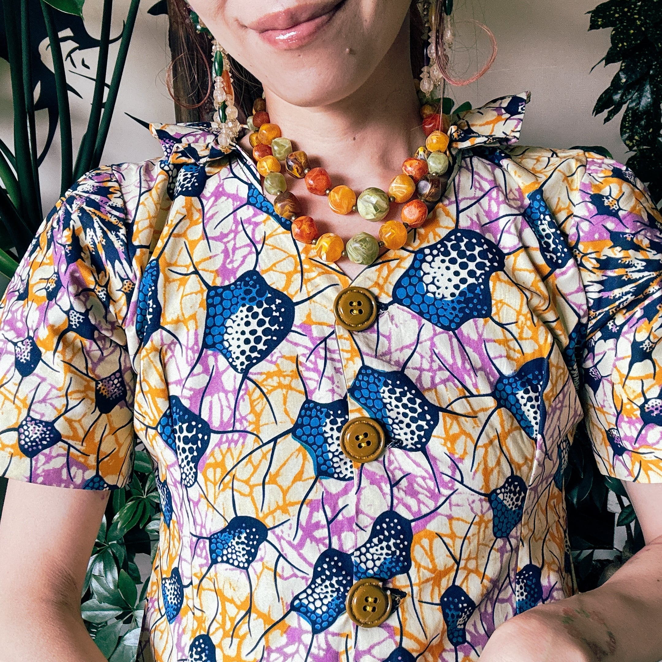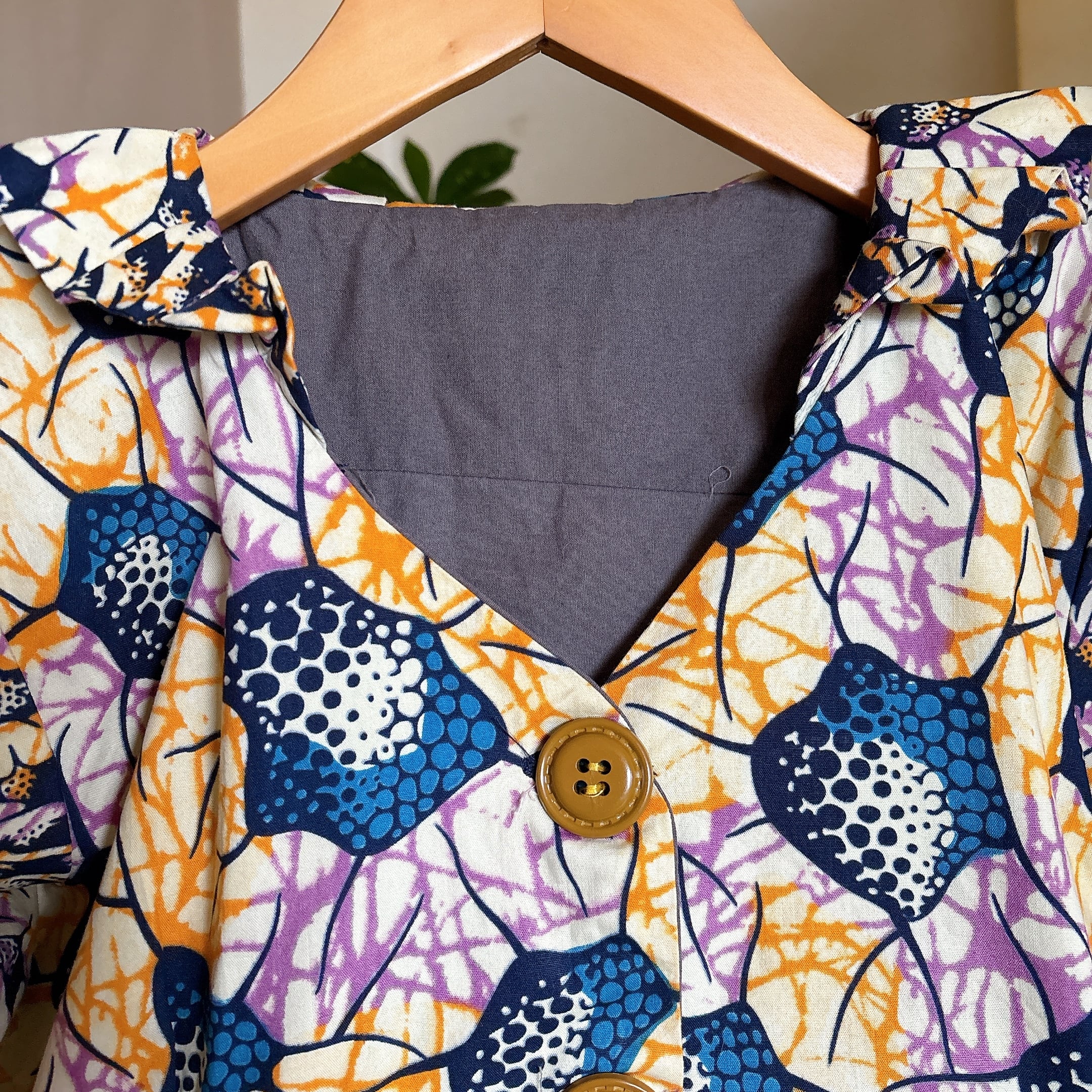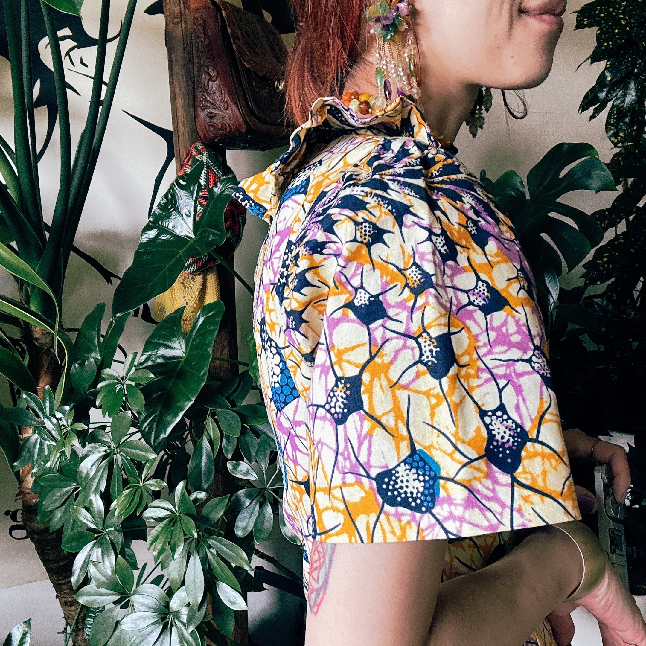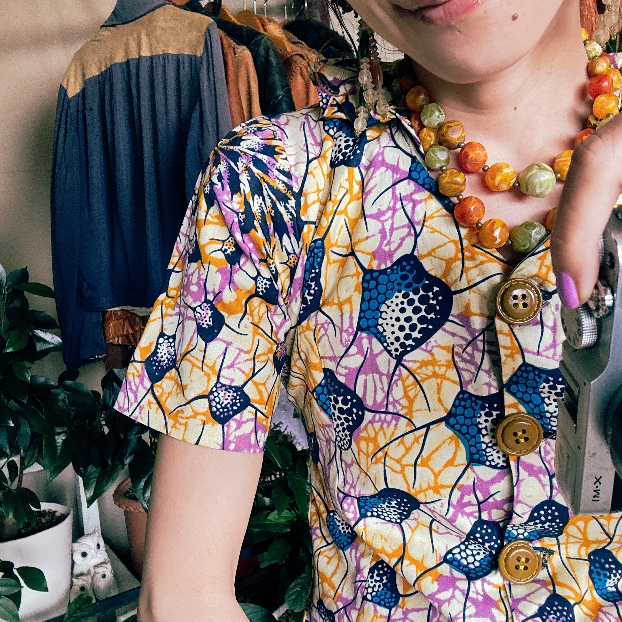 ◾️ 鮮やかなカラーリングが目を引く、アフリカンバティック調のヴィンテージブラウス。