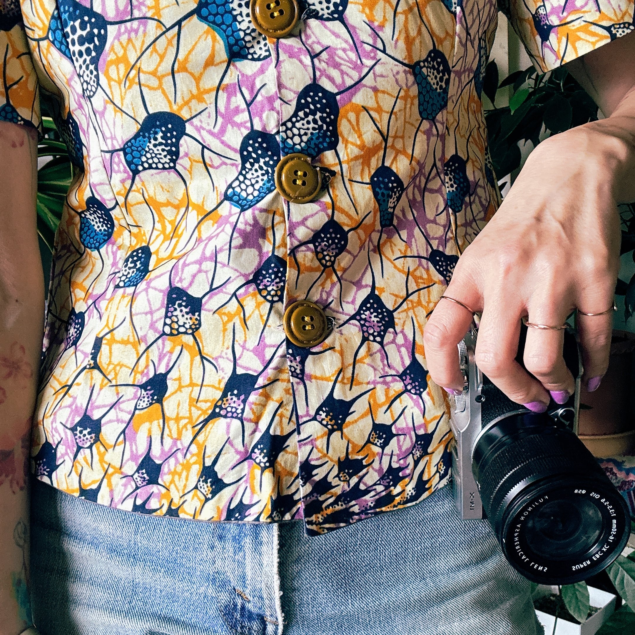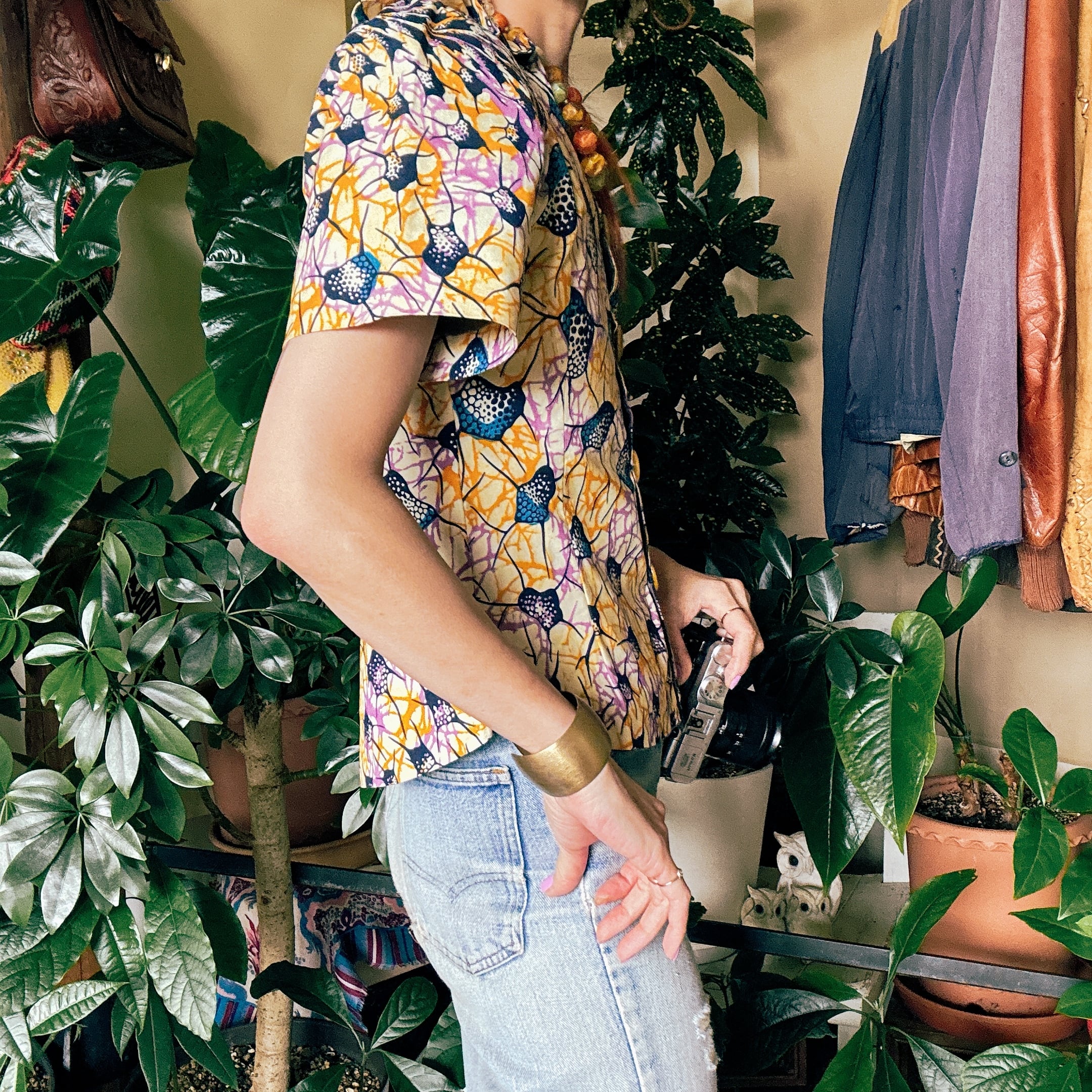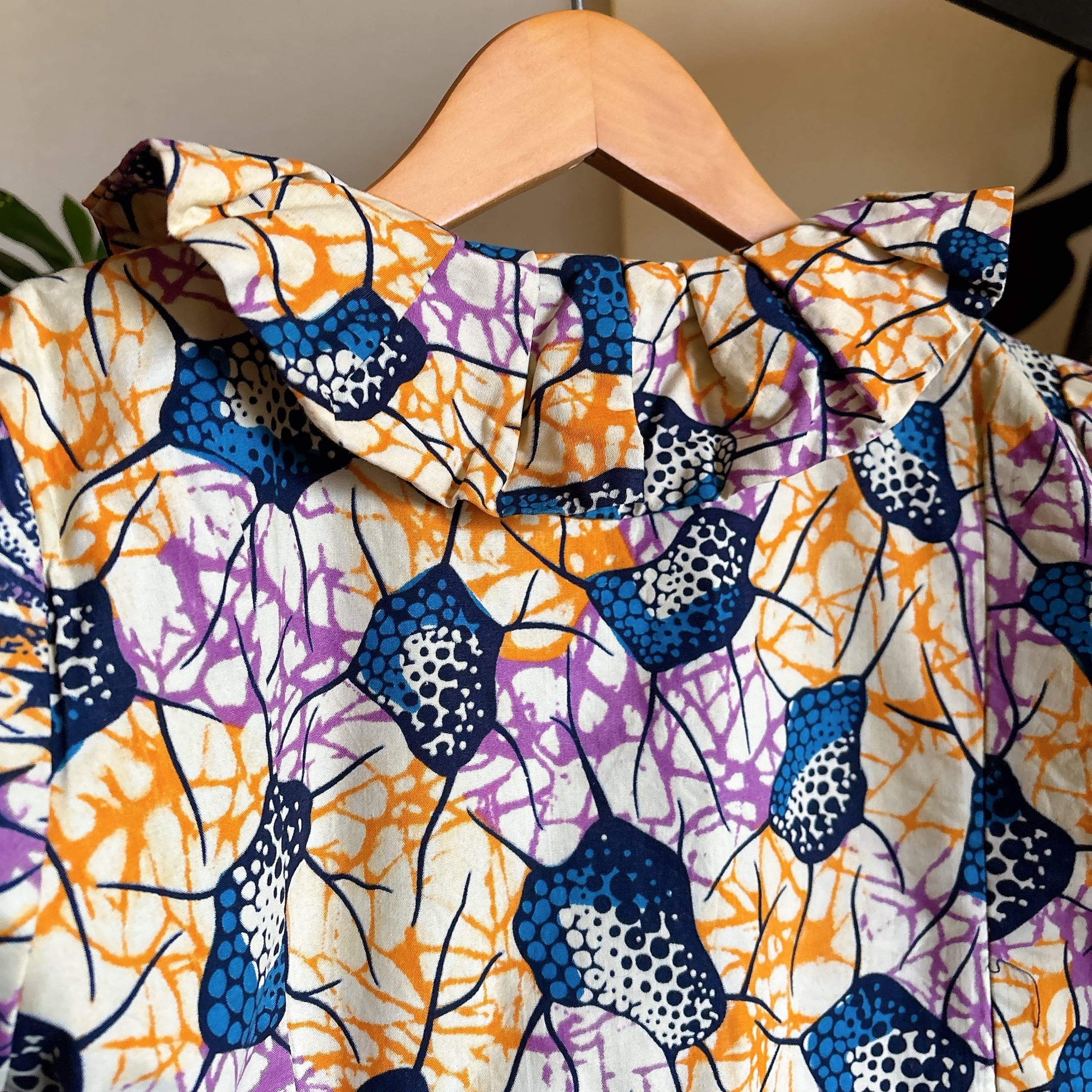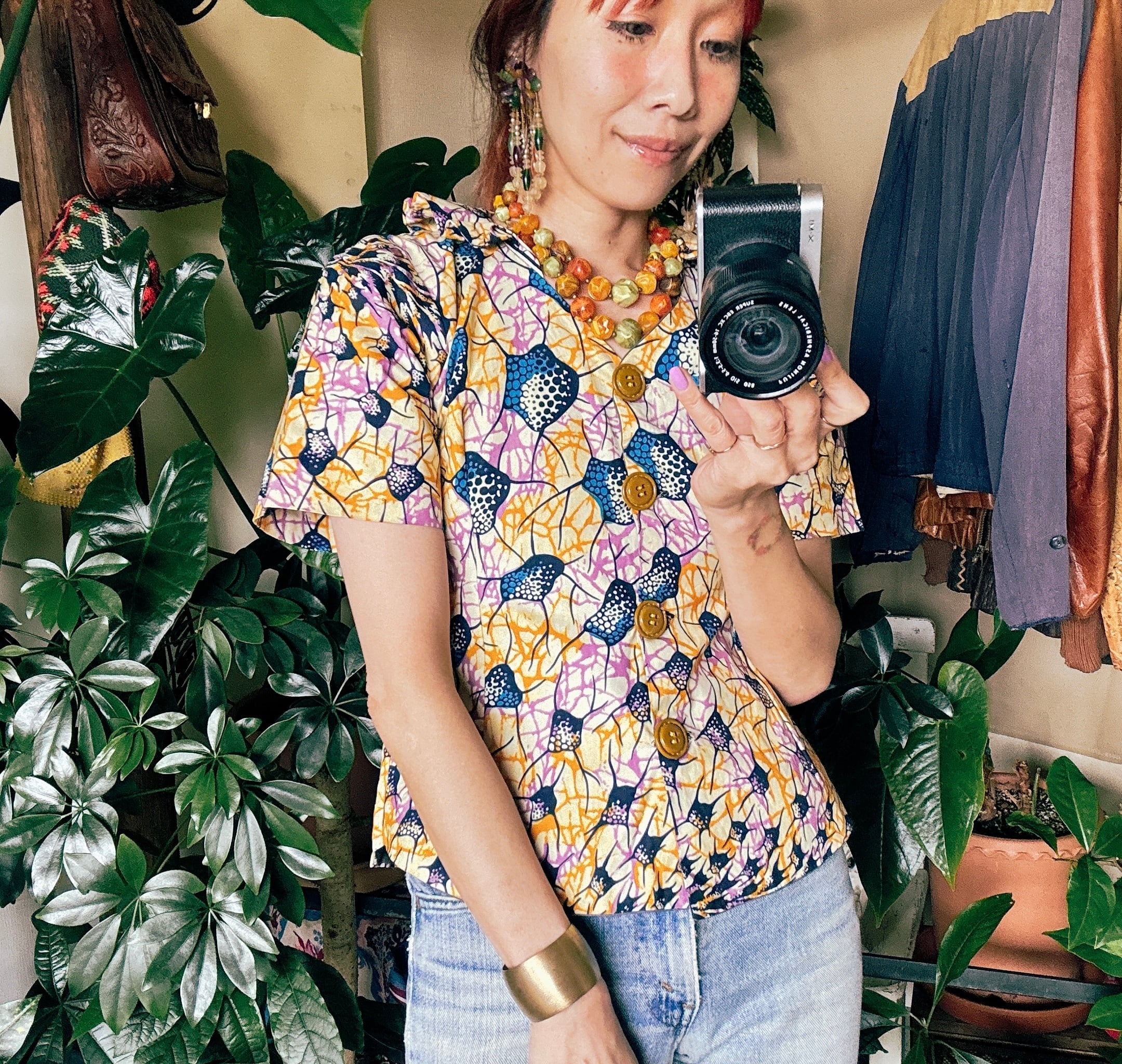 ◾️ 鮮やかなカラーリングが目を引く、アフリカンバティック調のヴィンテージブラウス。
