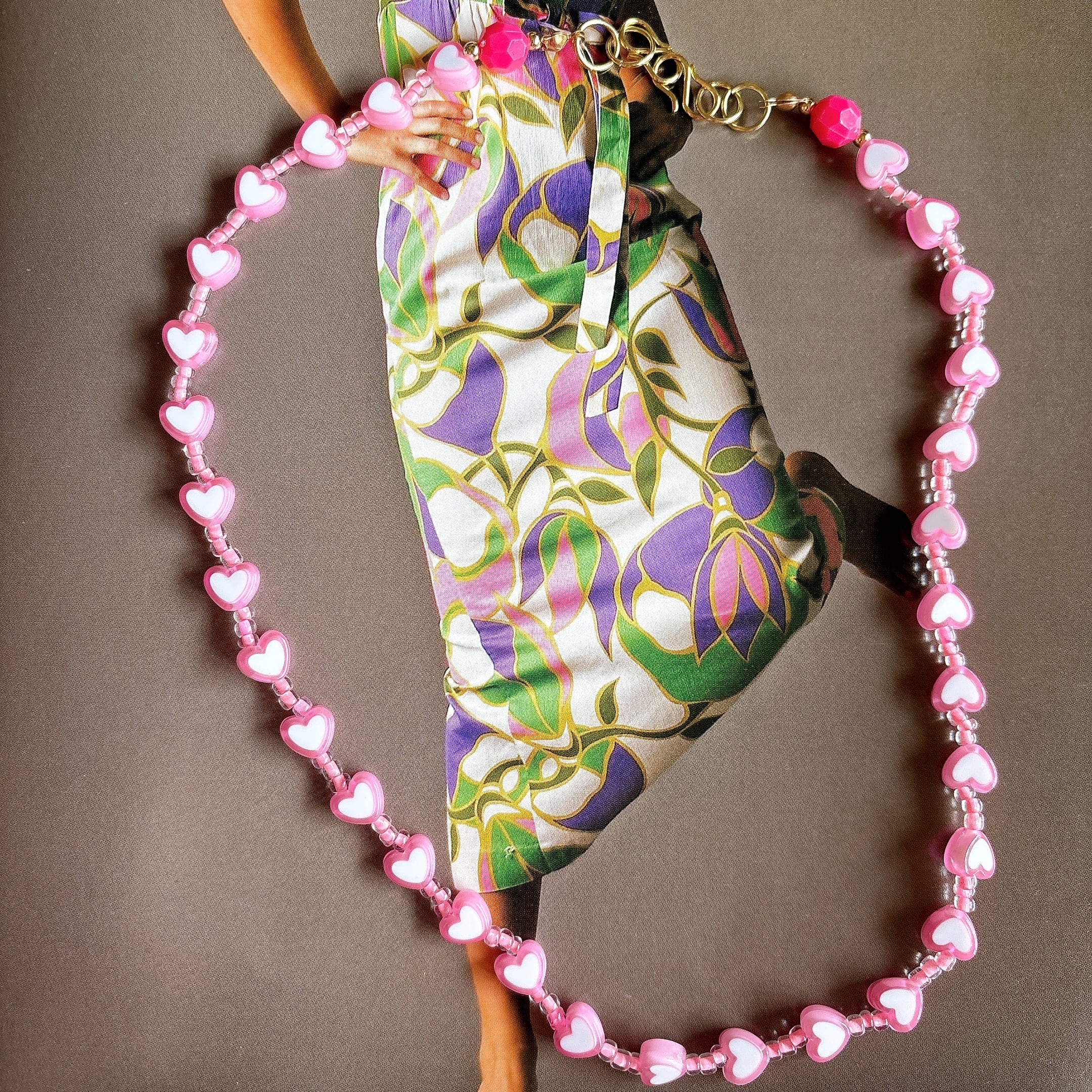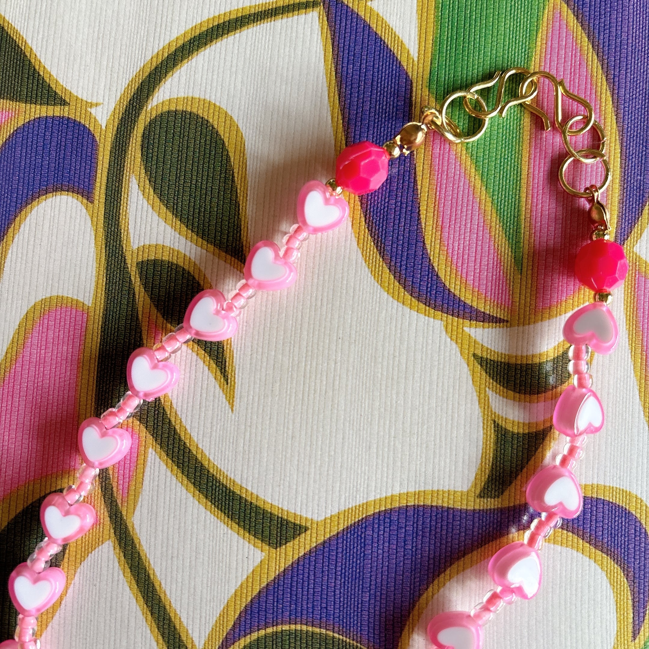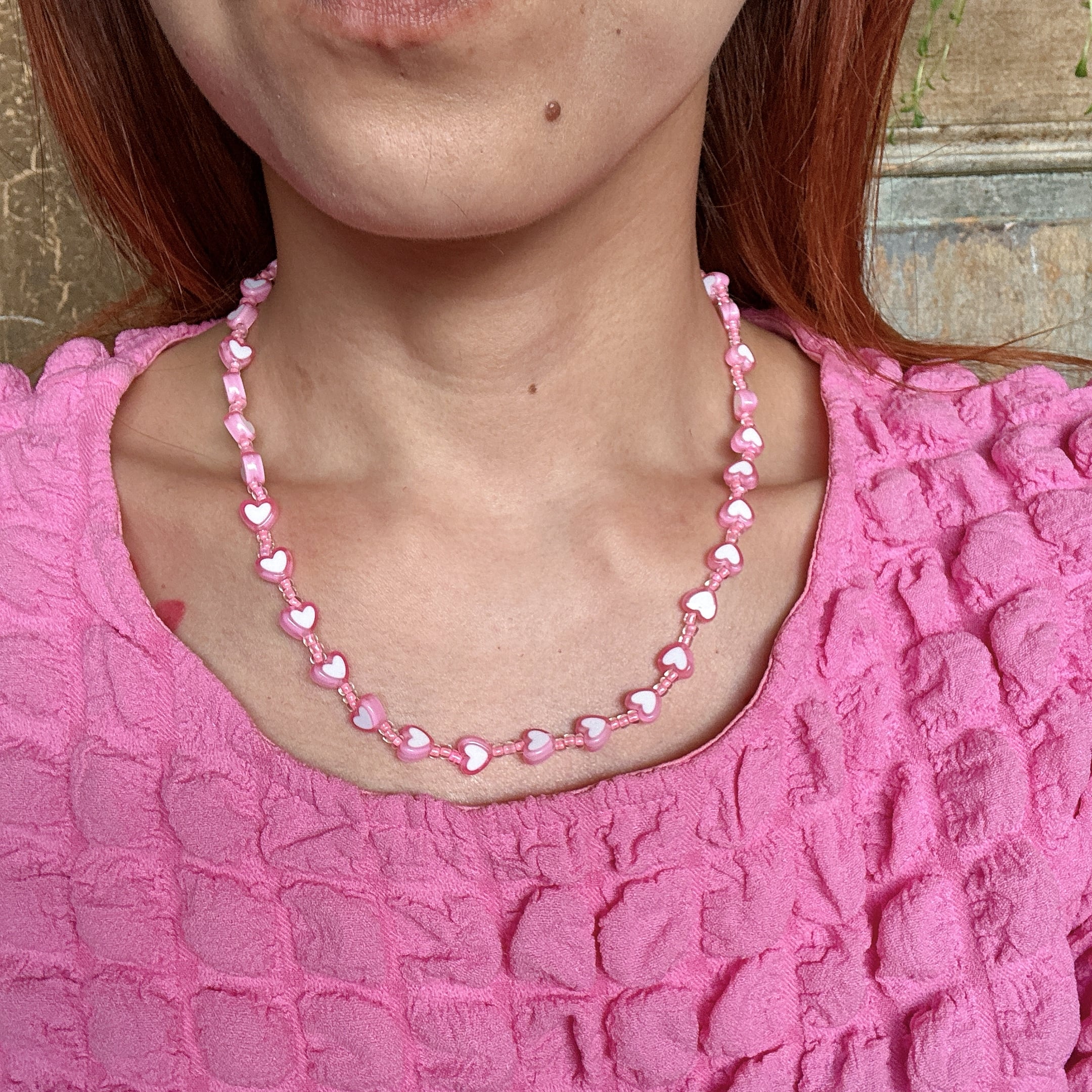 ◾️ やわらかなピンクカラーのハートビーズを贅沢に連ねたネックレス。