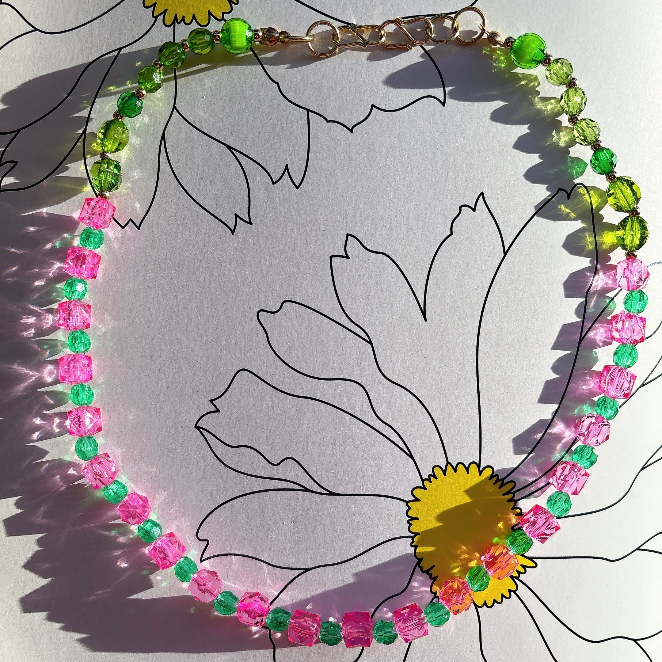◾️ 鮮やかなピンクとグリーンのコントラストが目を引く、ヴィンテージ感漂うビーズネックレス。カット入りのキューブビーズとラウンドビーズを組み合わせることで、光を受けた際にきらめきが生まれ、コーディネートのアクセントとして存在感を発揮します。軽やかなアクリル素材で着け心地も良く、デイリーからポイント使いまで幅広く活躍。ゴールドトーンの留め具が全体を上品に引き締めています。
