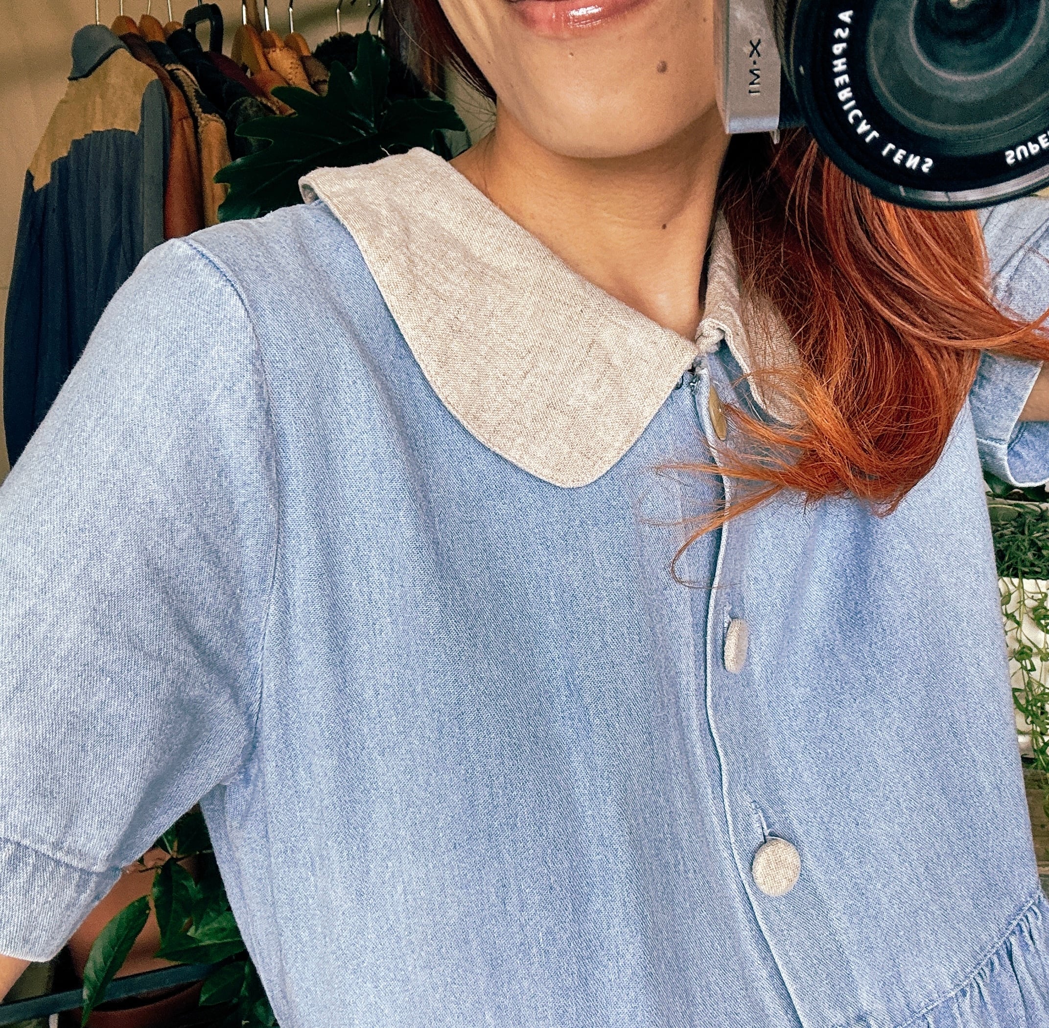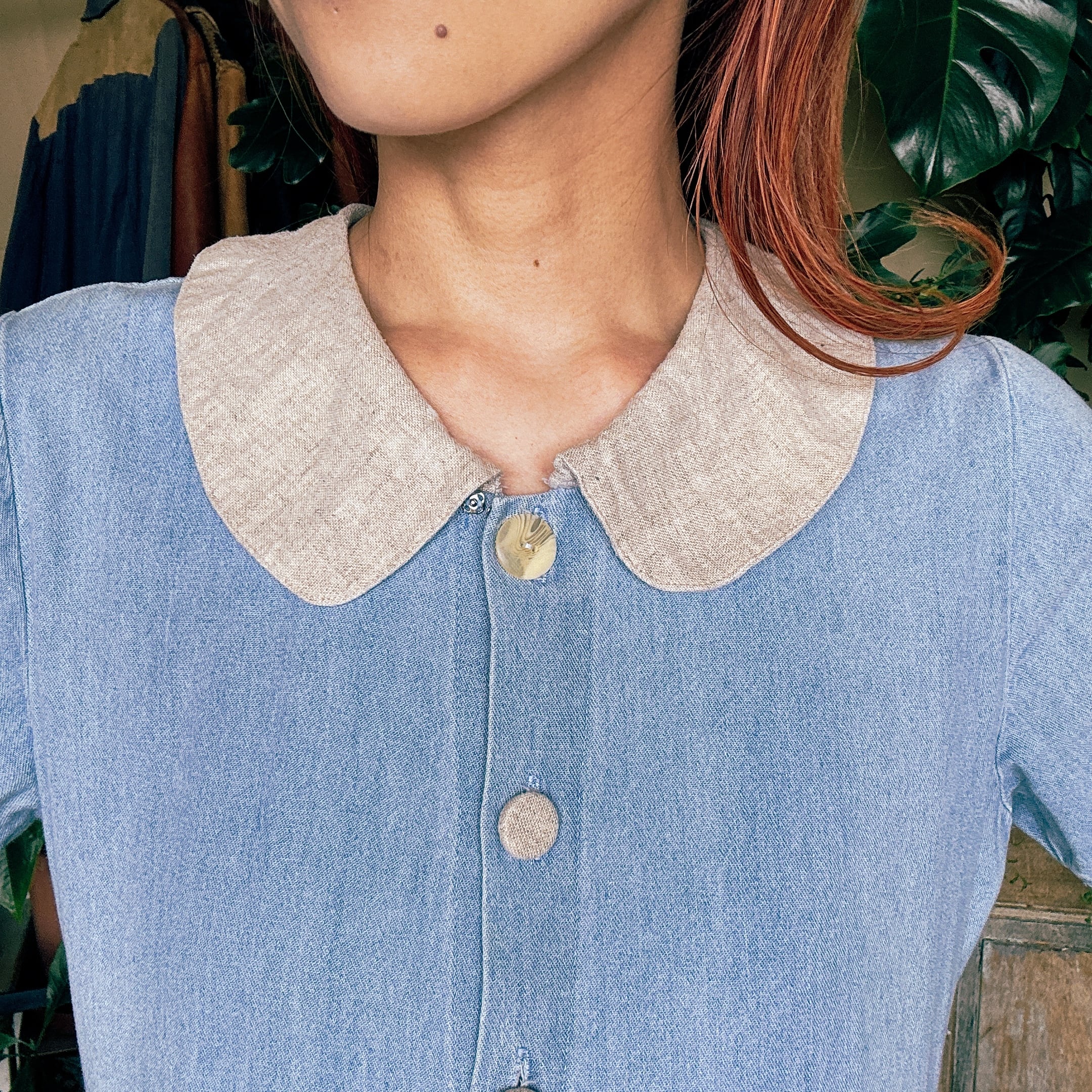 ◾️清潔感のあるベージュの丸襟と、淡いブルーのデニム地のコントラストが特徴です。