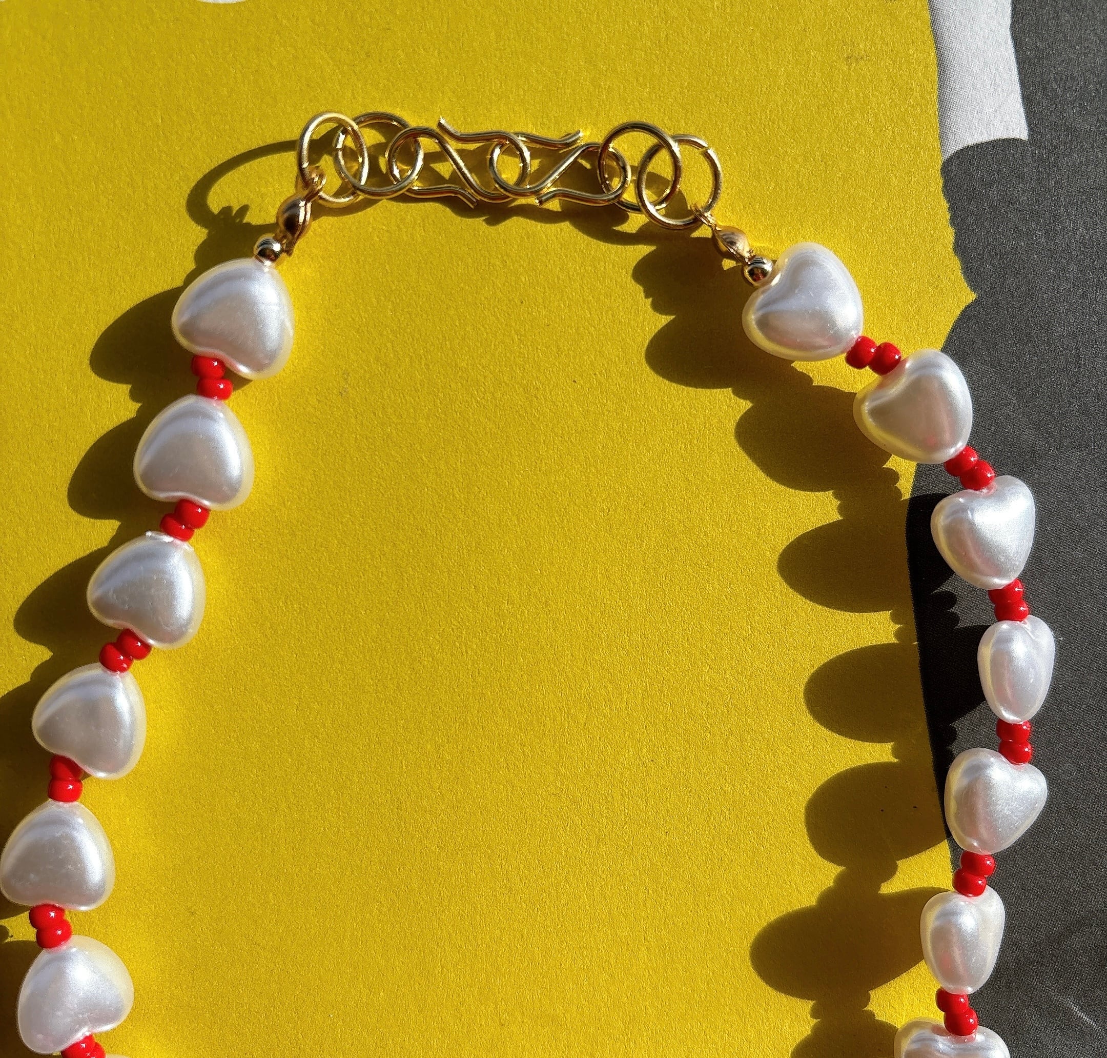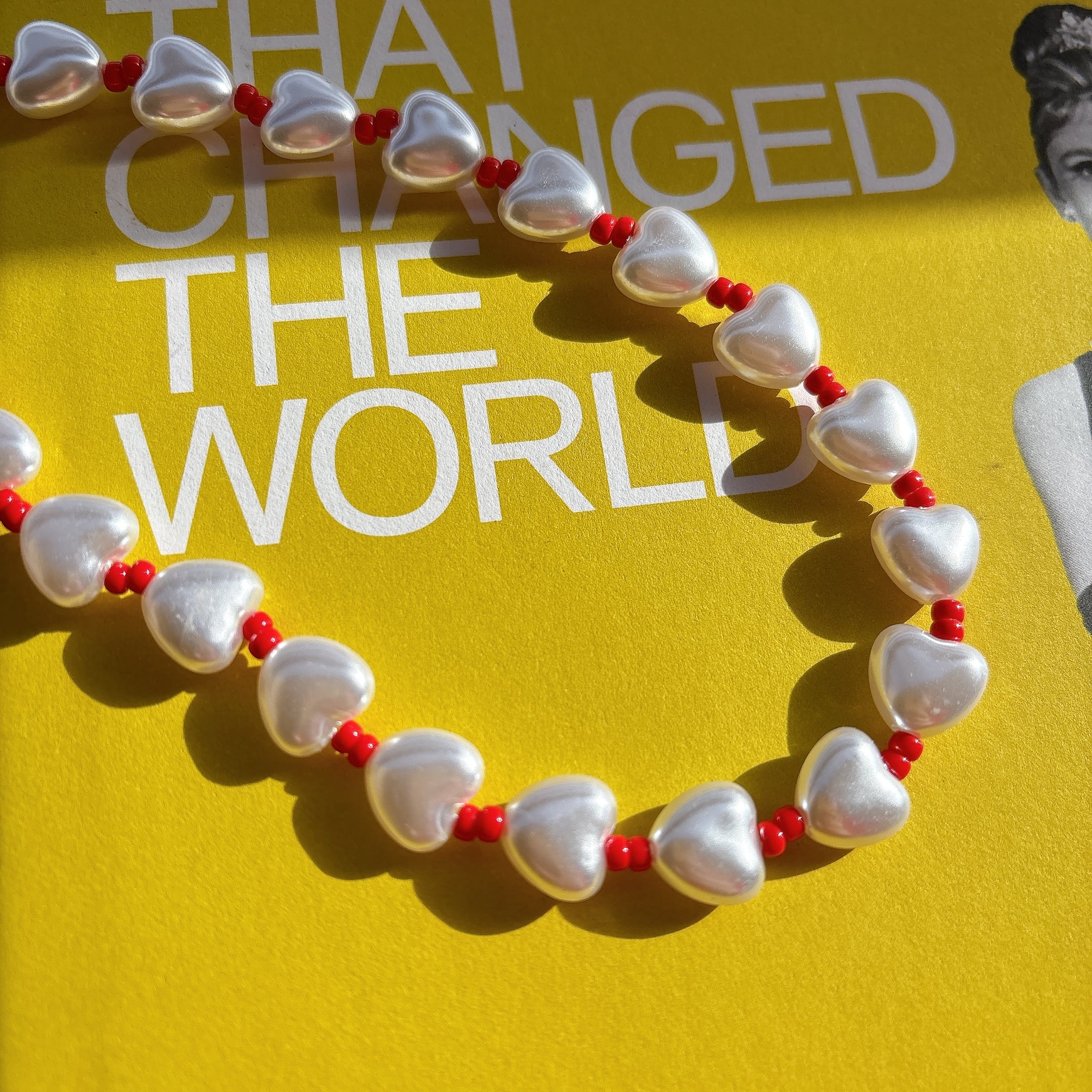 ◾️ 艶やかなハート型パールを主役に、小粒のレッドビーズでアクセントを効かせたネックレス。クラシカルなパールの上品さに、赤の差し色が加わることで、ほどよく遊び心のある印象に仕上がっています。