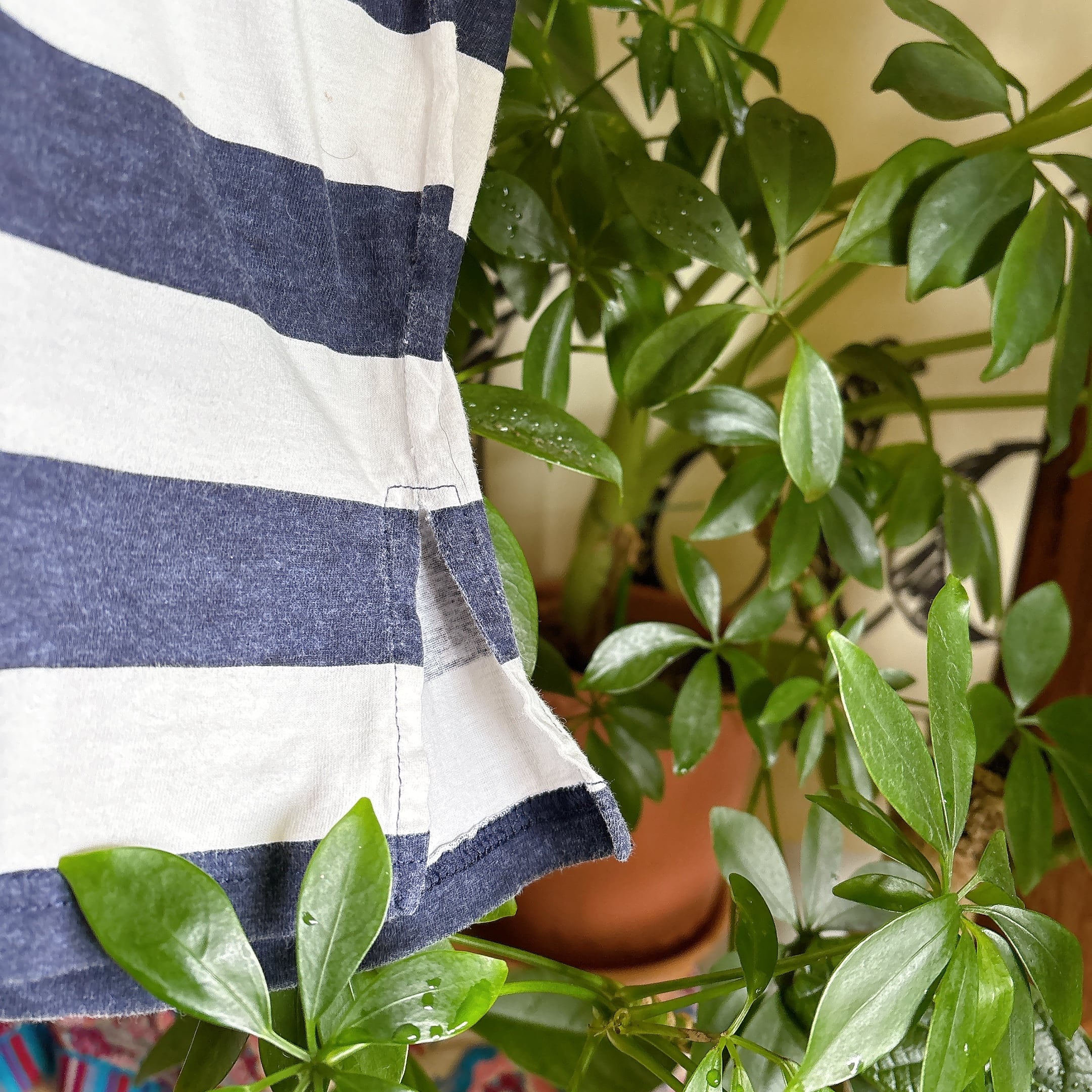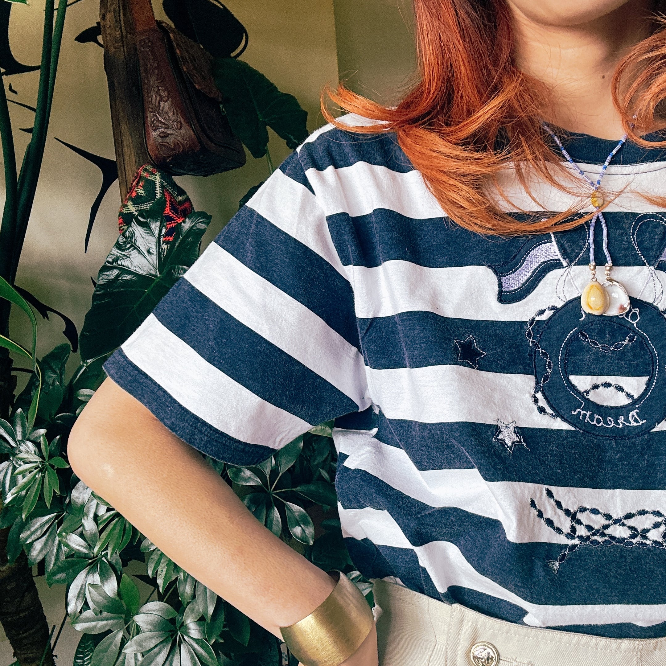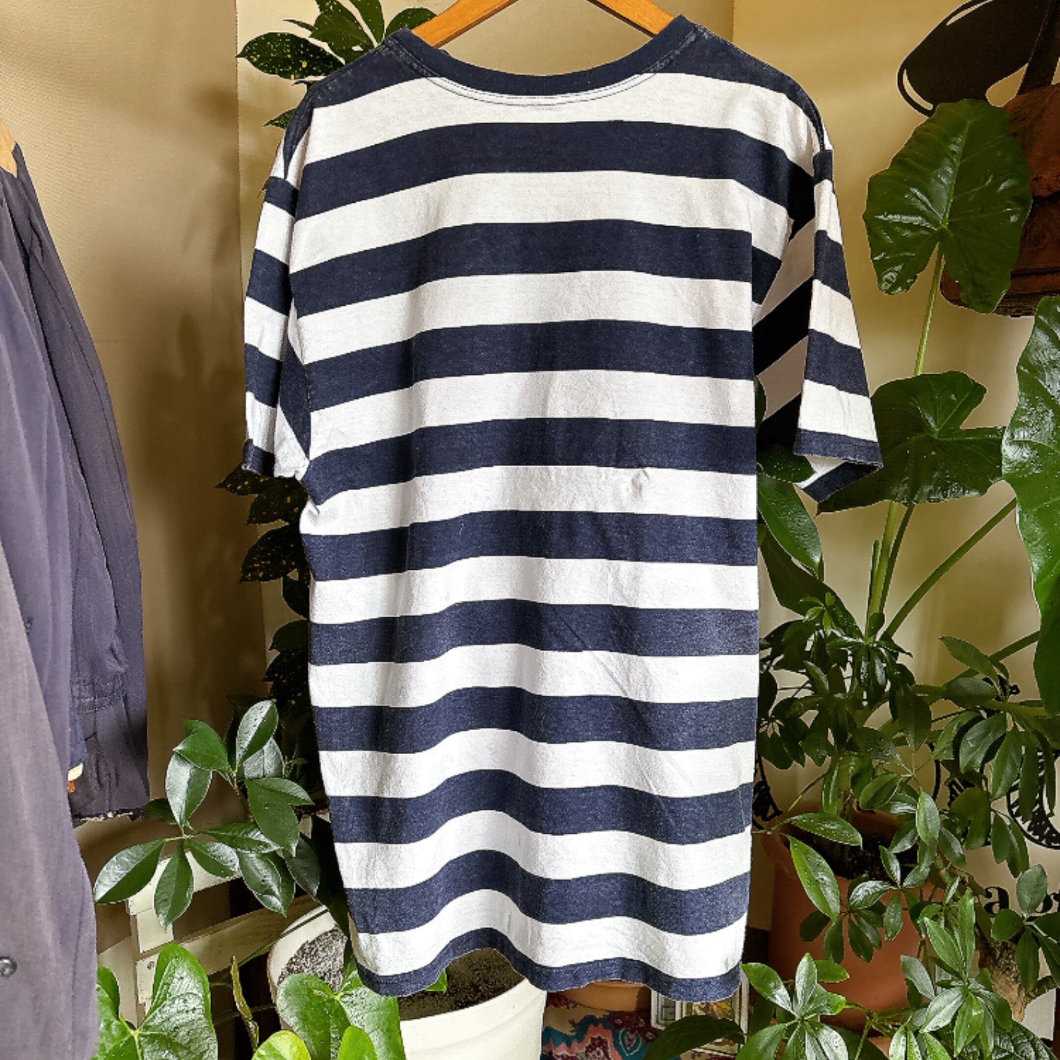 ◾️ ネイビー×生成りのマリンボーダーに、中央のセーラー風エンブレムプリントが特徴のTシャツ。かすれたプリントや少しフェードした色味から、着込まれた風合いがしっかり出ていて雰囲気抜群です。
