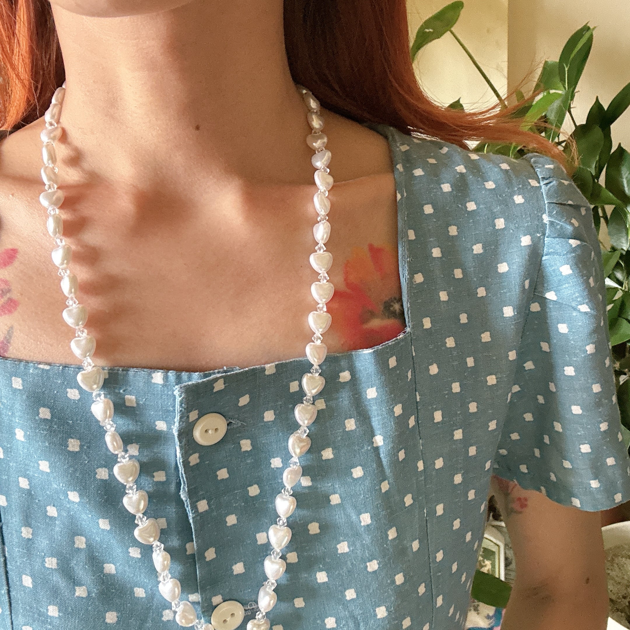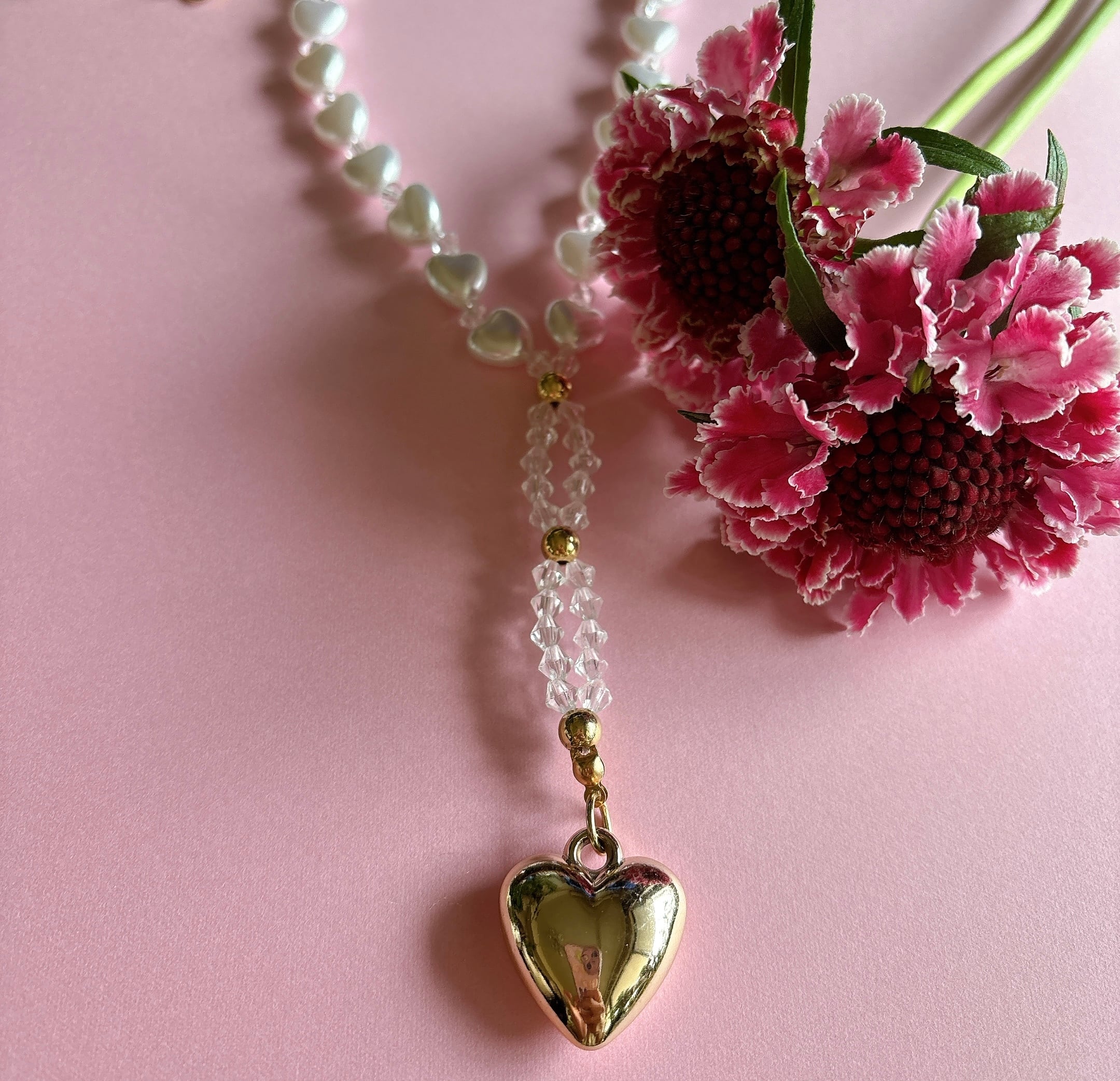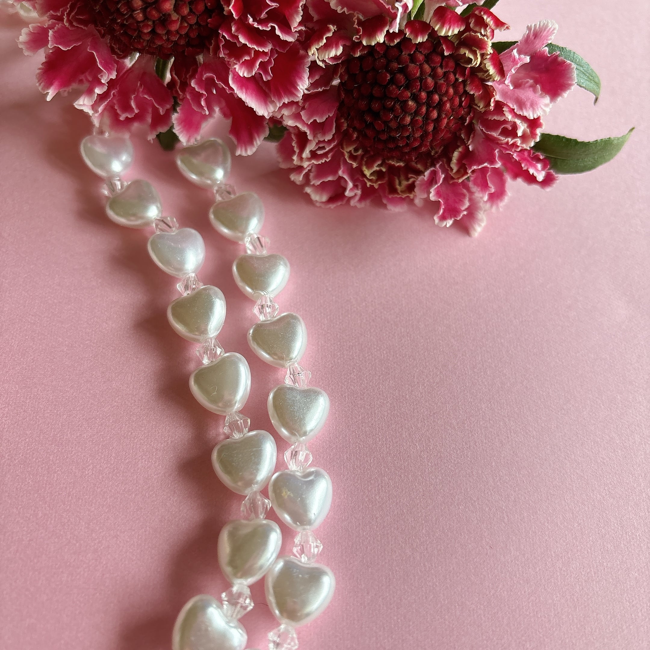 ◾️ やわらかな艶のハート型ビーズを連ねたロングネックレス。透明感のあるクリアビーズとゴールドパーツを組み合わせ、軽やかさと上品さを両立しています。
