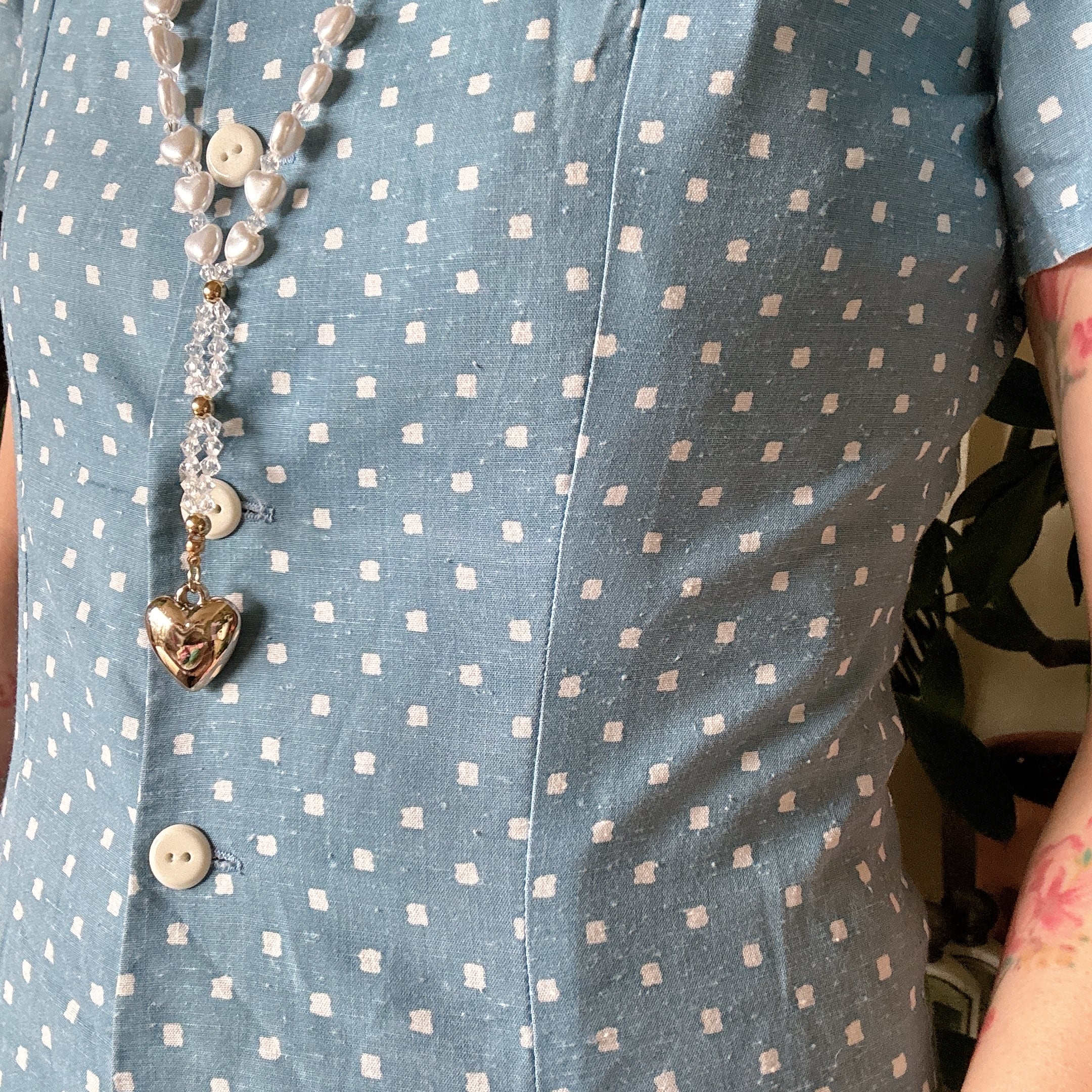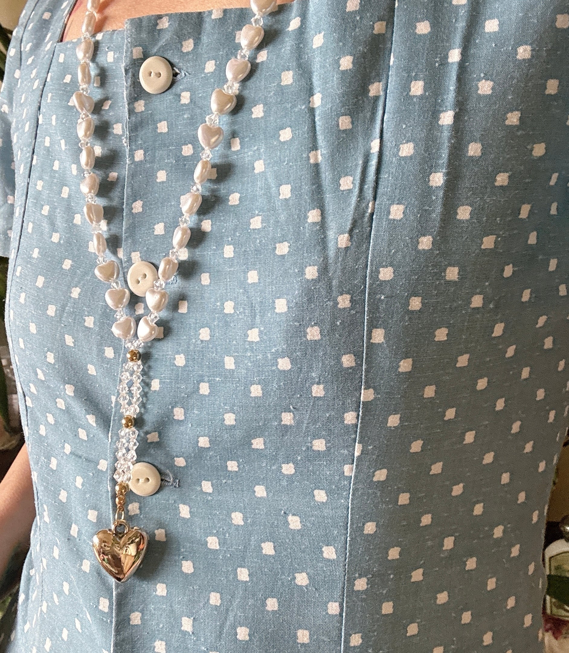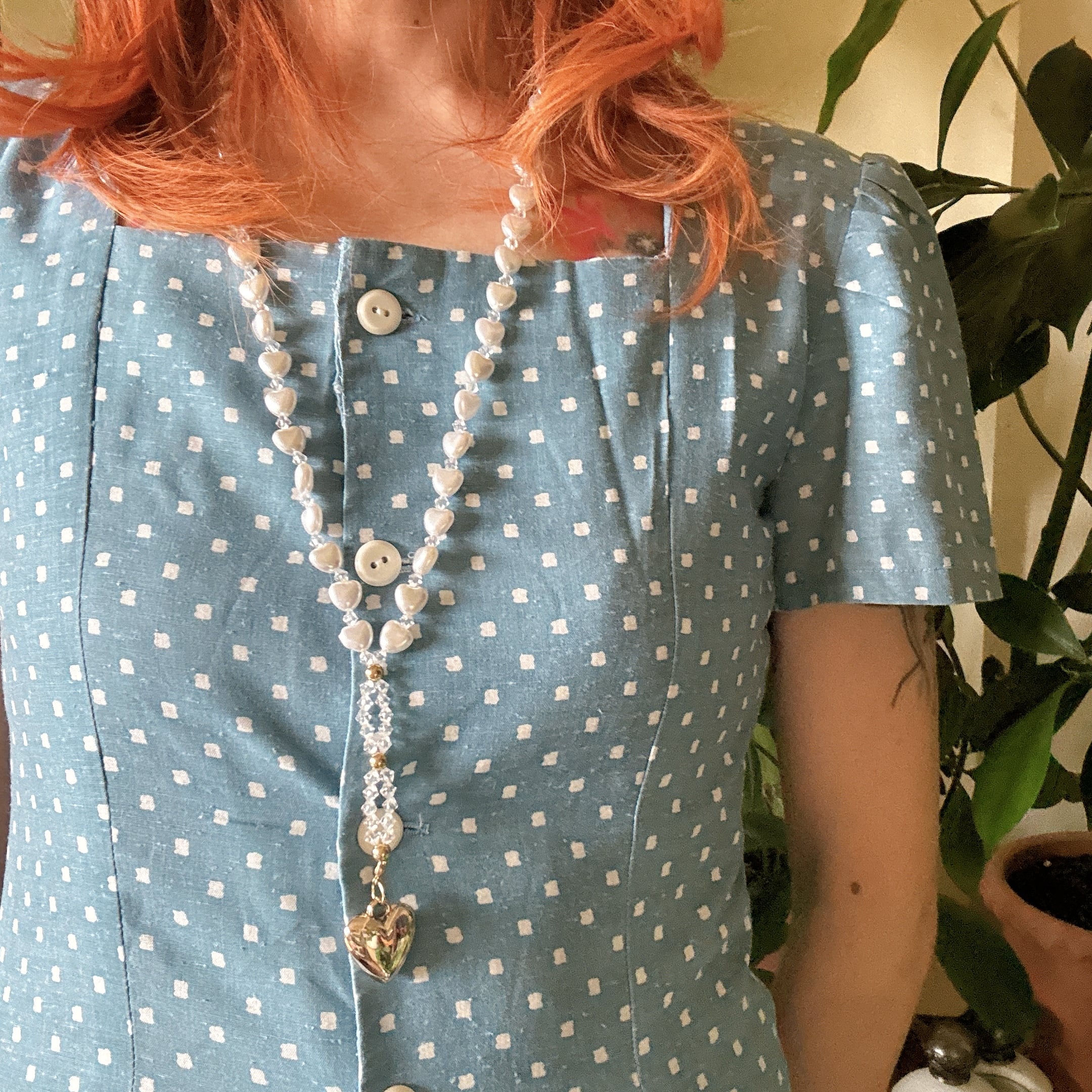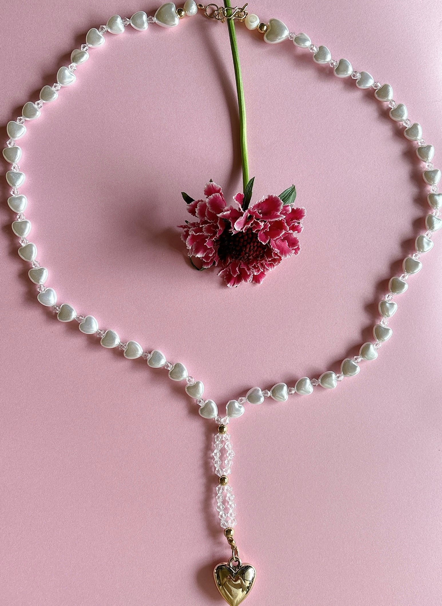 ◾️ やわらかな艶のハート型ビーズを連ねたロングネックレス。透明感のあるクリアビーズとゴールドパーツを組み合わせ、軽やかさと上品さを両立しています。