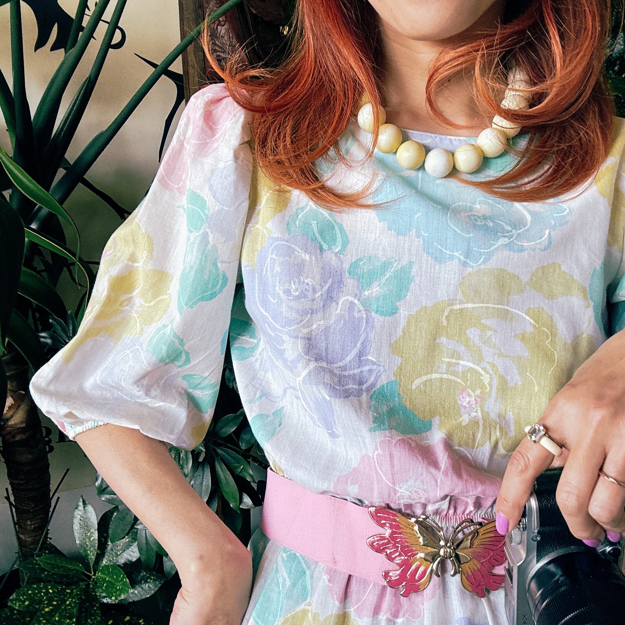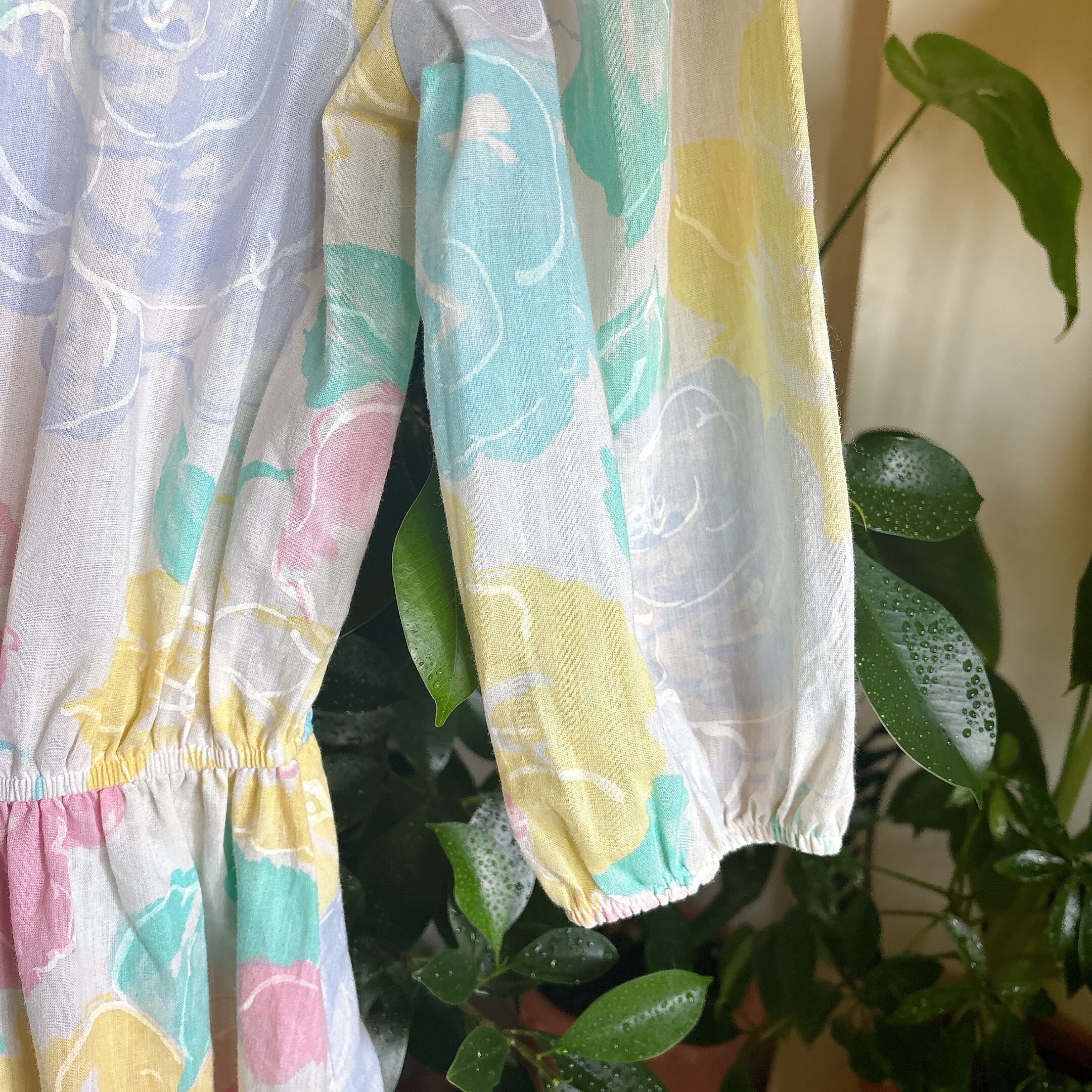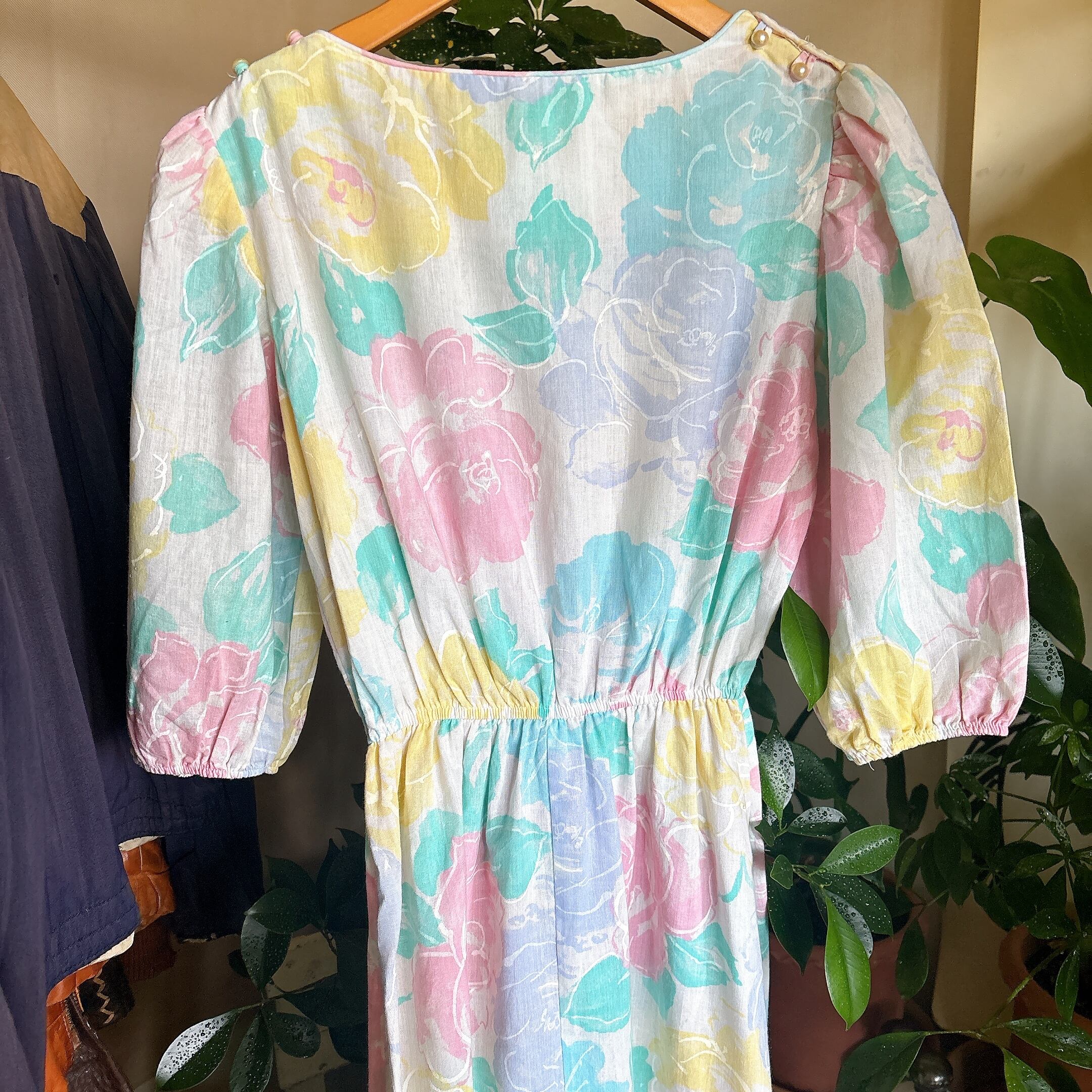 ◾️ 淡いピンク、イエロー、ブルーが溶け合う、まるで水彩画のような大判のバラ模様が美しいビンテージワンピースです。 程よいボリュームのパフスリーブ(五分〜七分袖)が、肩周りを華奢に見せつつレトロな雰囲気を演出します。