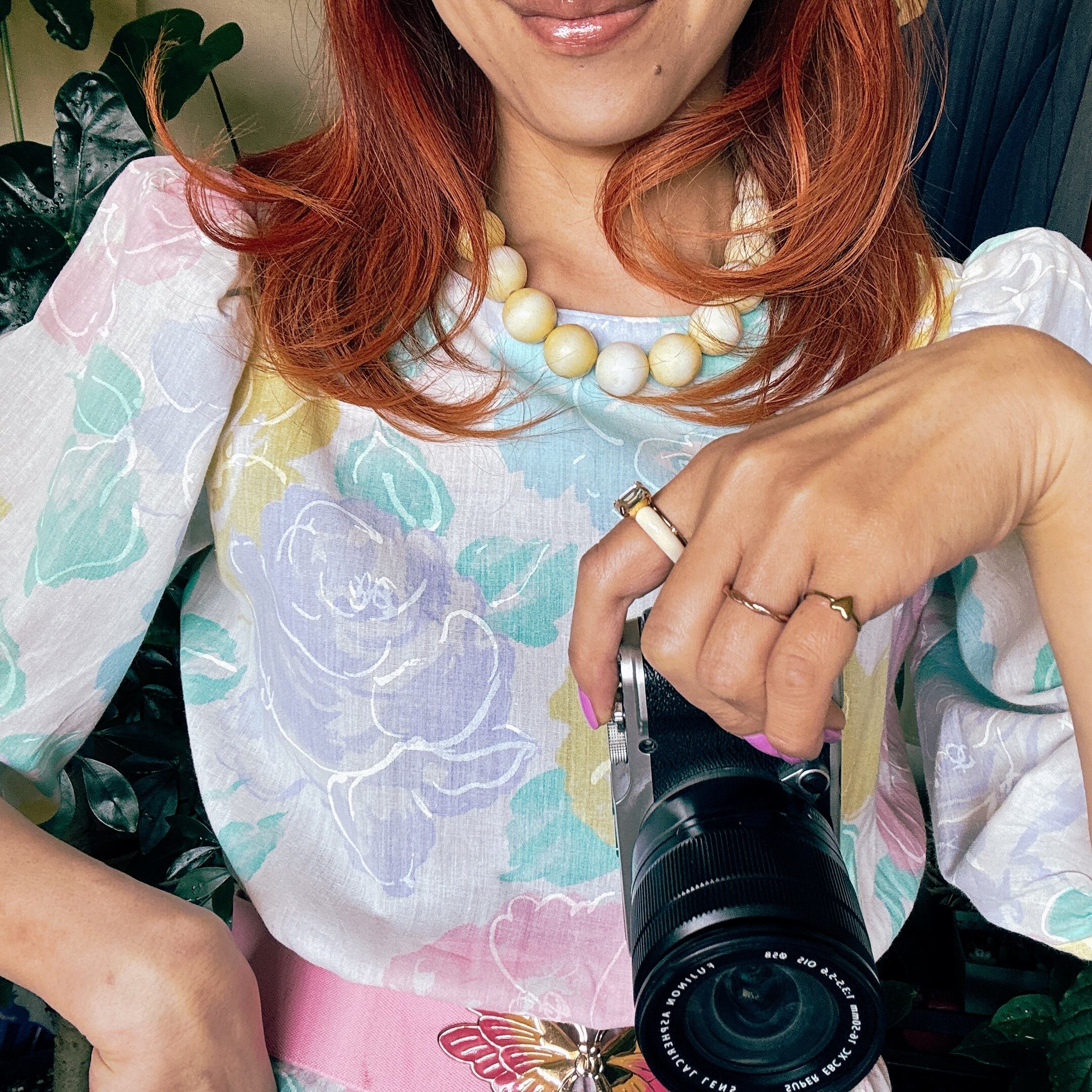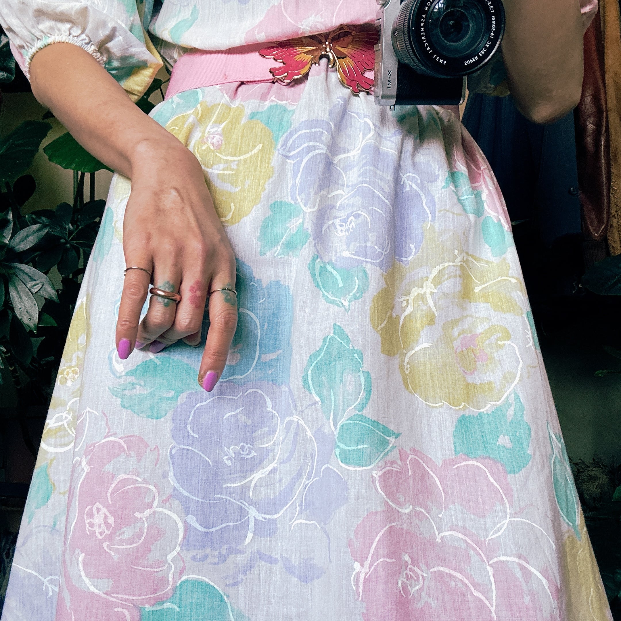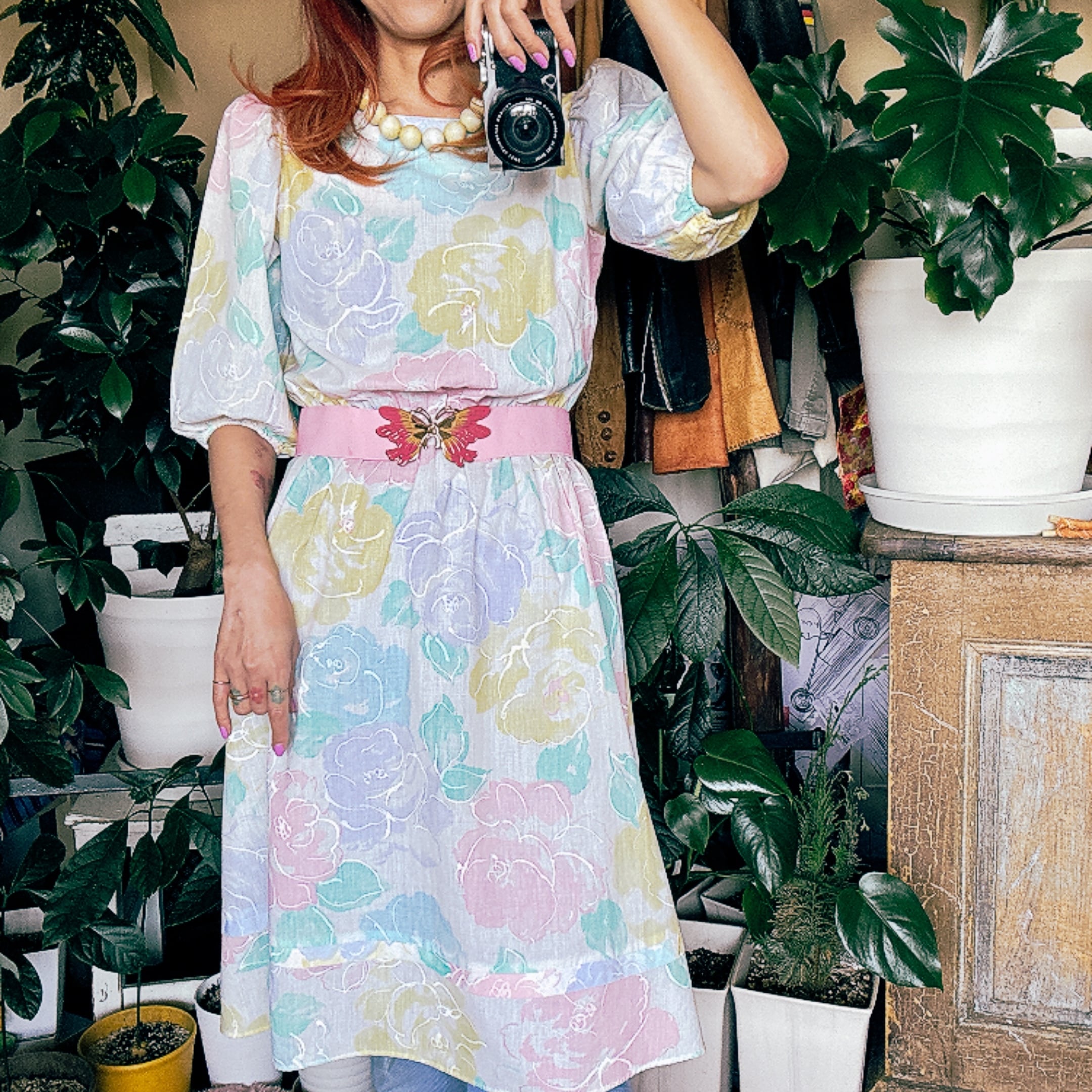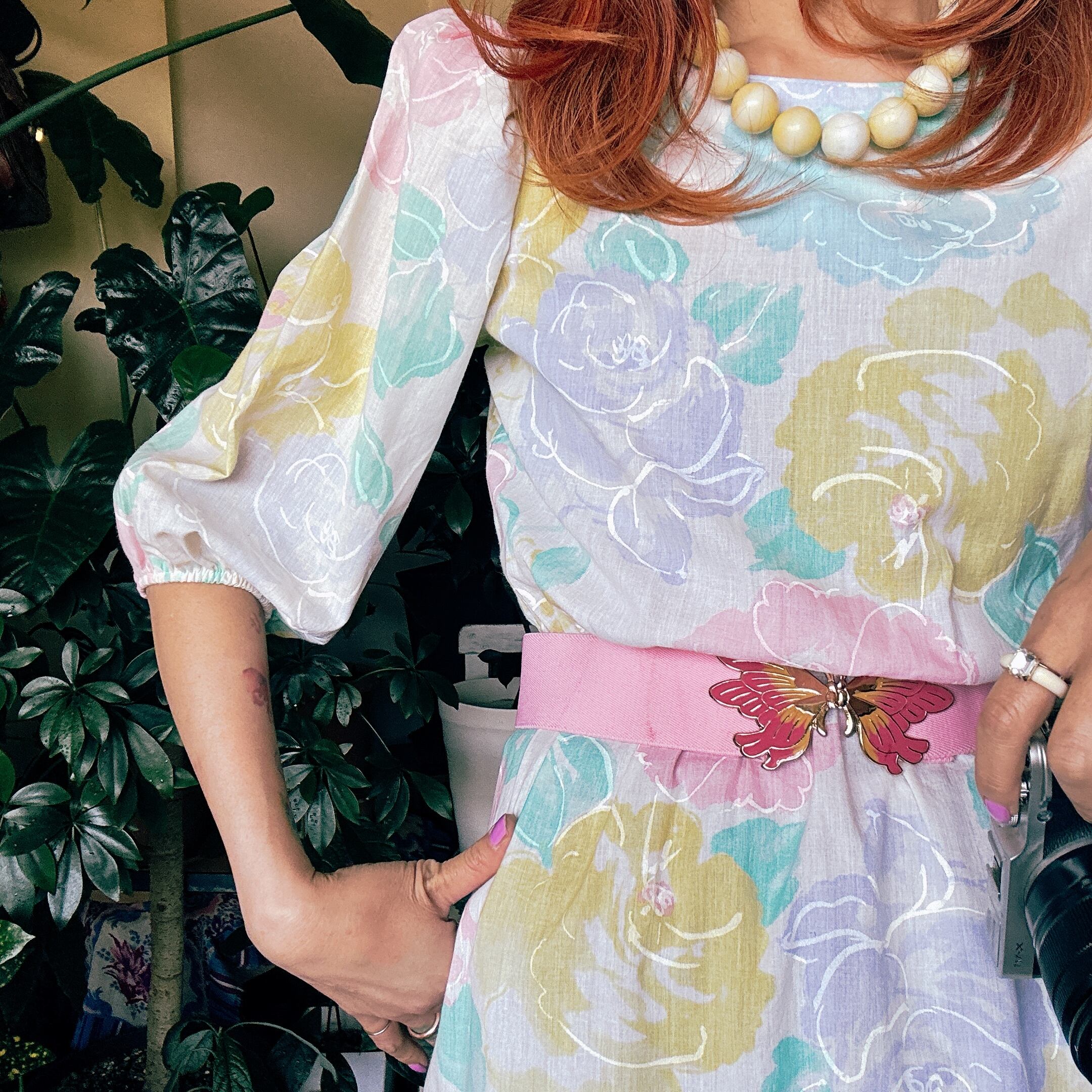 ◾️ 淡いピンク、イエロー、ブルーが溶け合う、まるで水彩画のような大判のバラ模様が美しいビンテージワンピースです。 程よいボリュームのパフスリーブ(五分〜七分袖)が、肩周りを華奢に見せつつレトロな雰囲気を演出します。