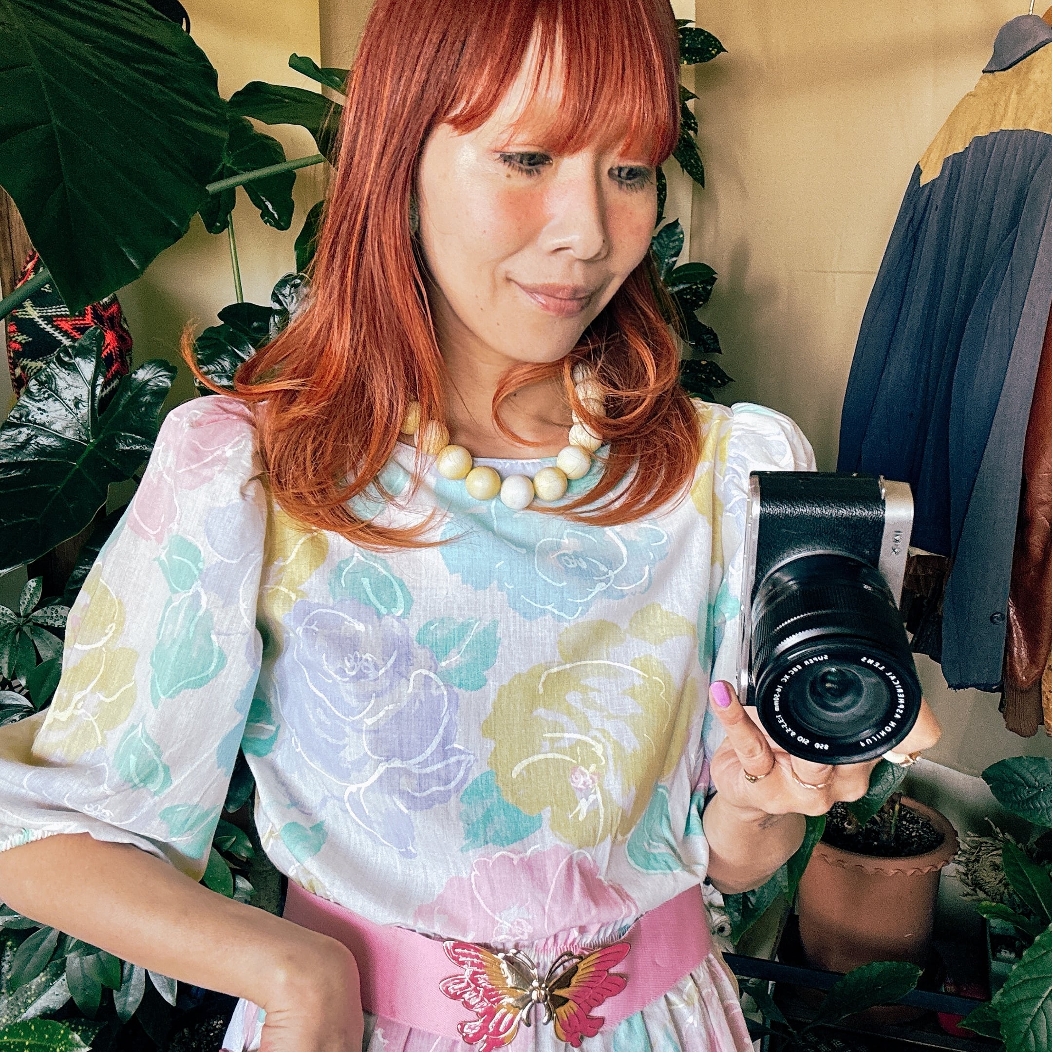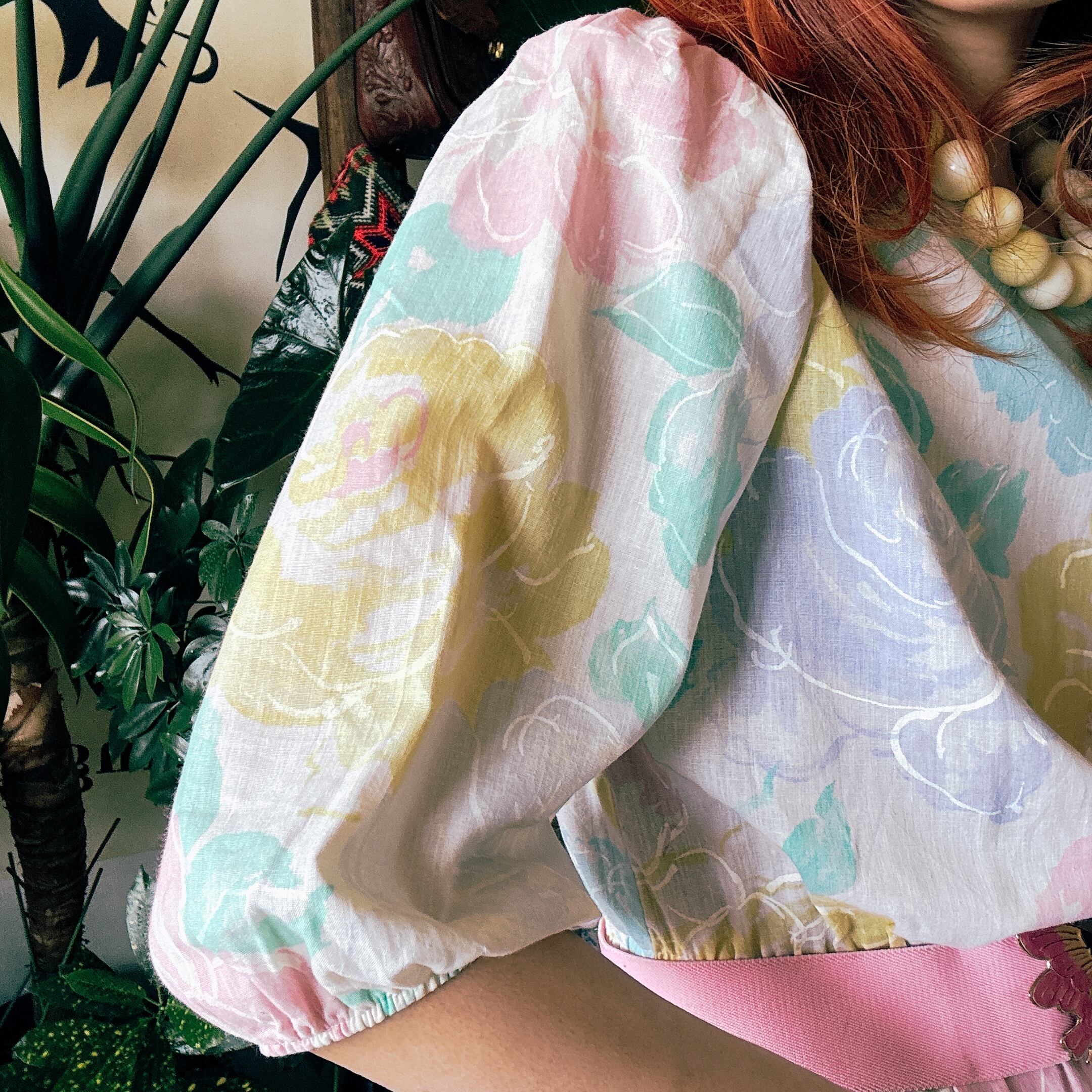 80s パステルローズ 花柄 パフスリーブ ワンピース