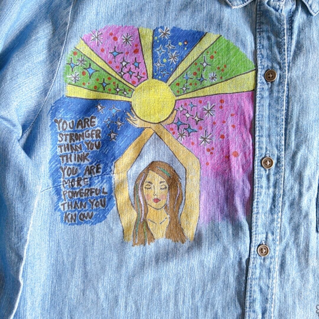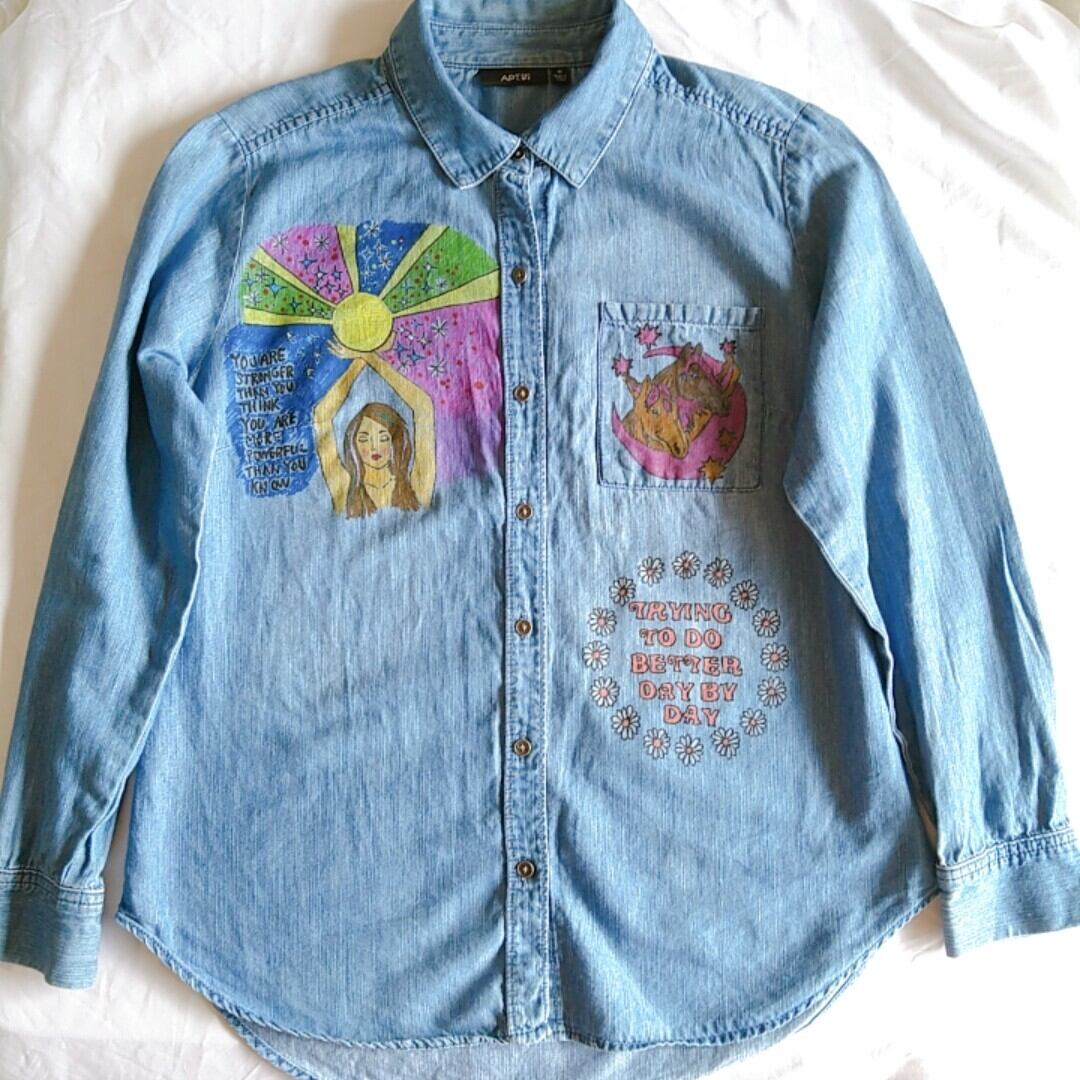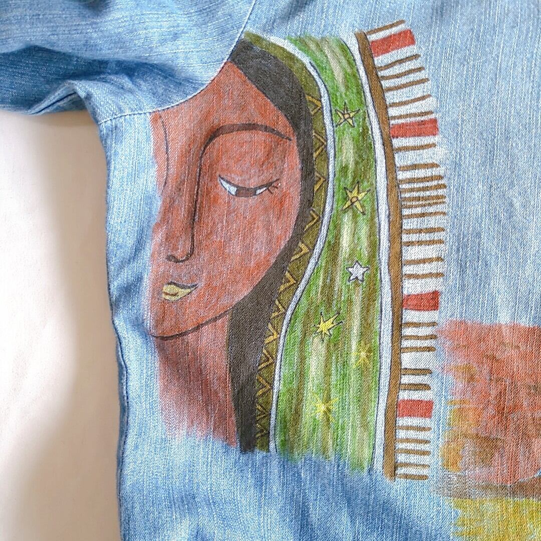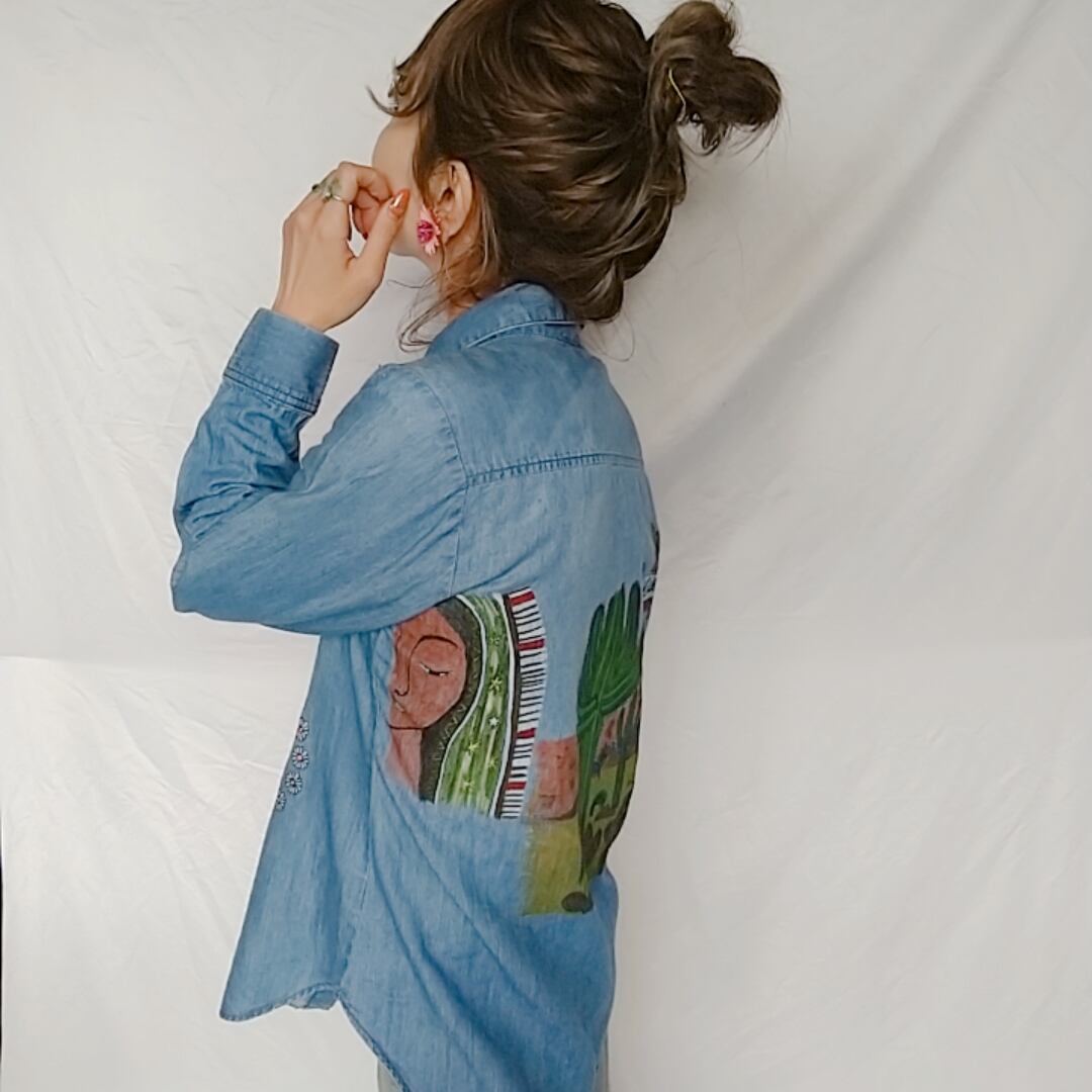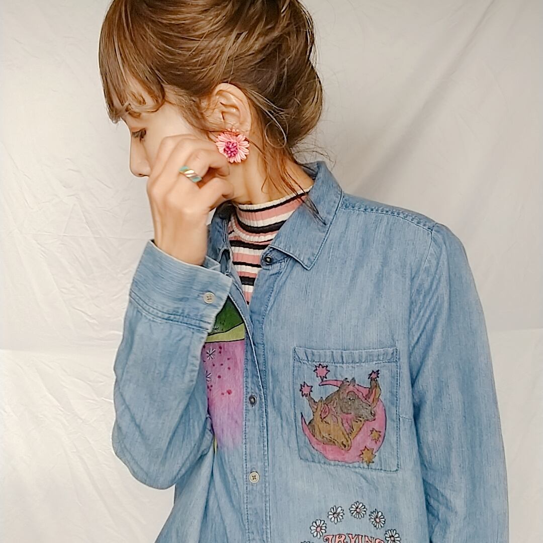 柔らかな肌触りのシャツで、真夏以外シーズンレスにお使いになれる1枚です。お背中を中心にあったダメージをカバーする為に大胆にイラストを施しました。1枚でも勿論、Tシャツや柄物の上に羽織としても是非◎*。
