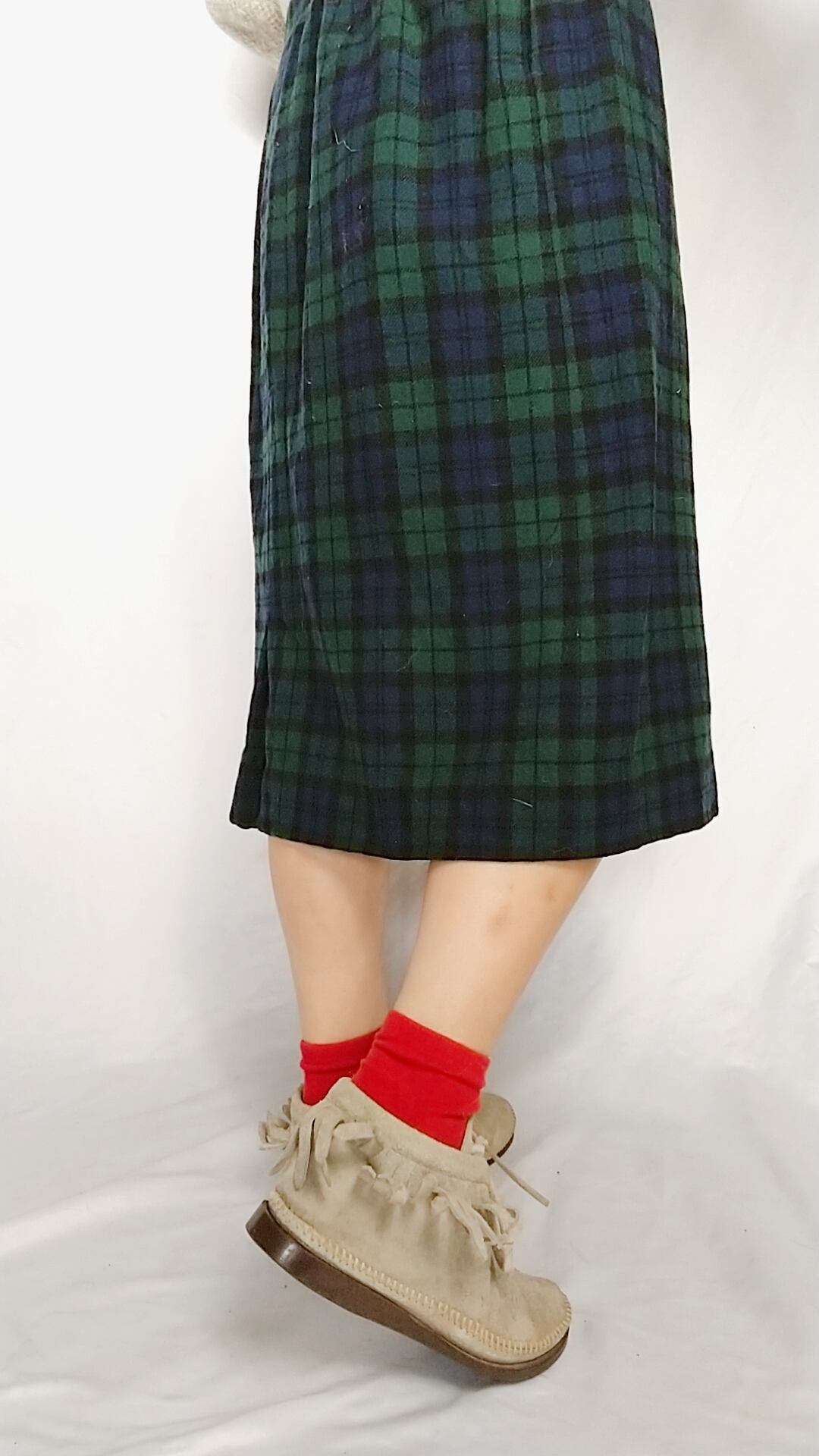 ■100%ヴァージンウールの保温性に優れたペンドルトンのプレイドパターンスカート。お色味、生地感は7枚目の画像が実際に近いです。落ち着いたグリーンがシックな雰囲気◎*。サスペンダーをしてもキュートです。