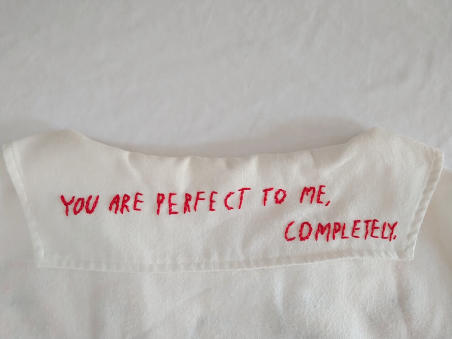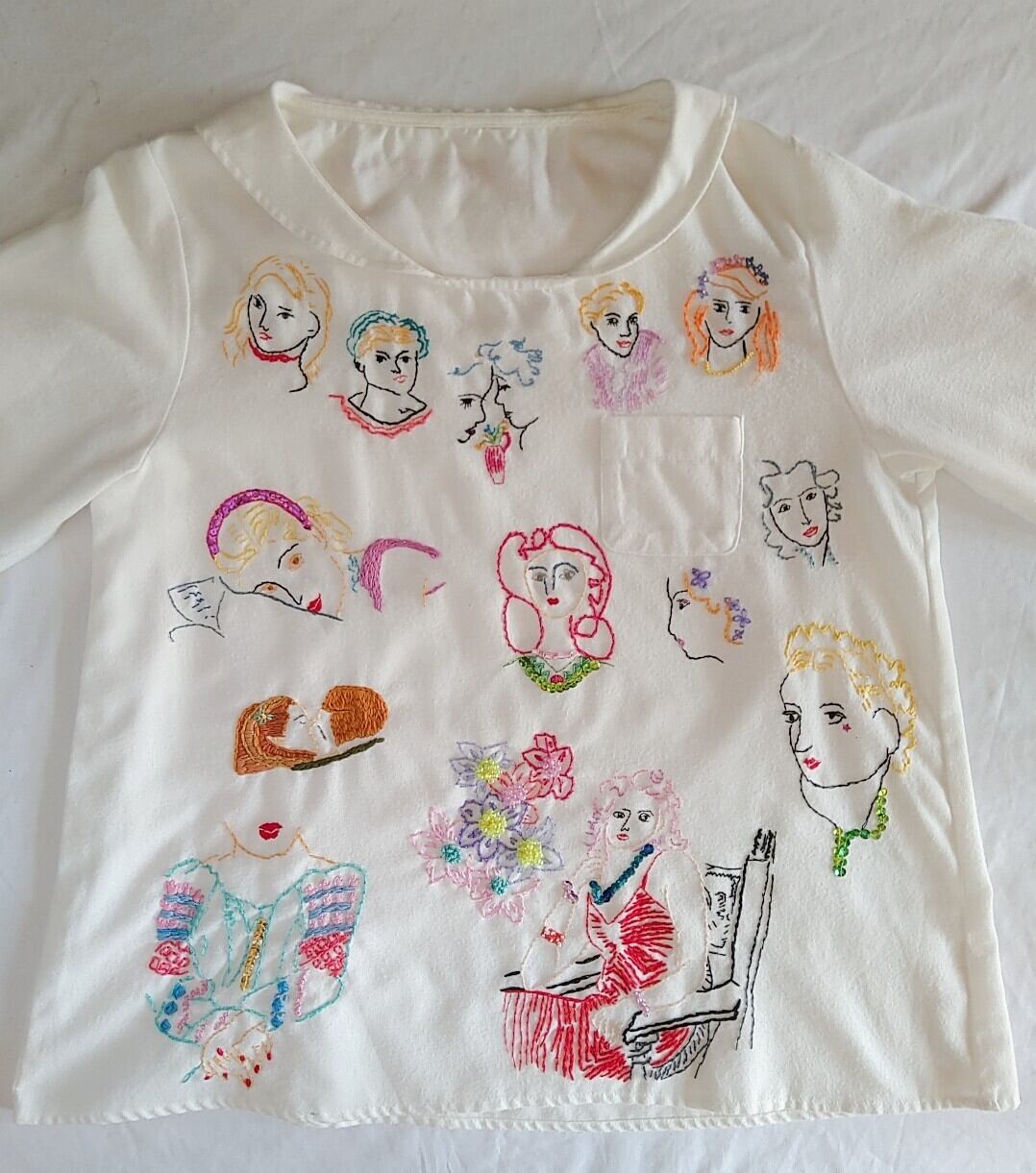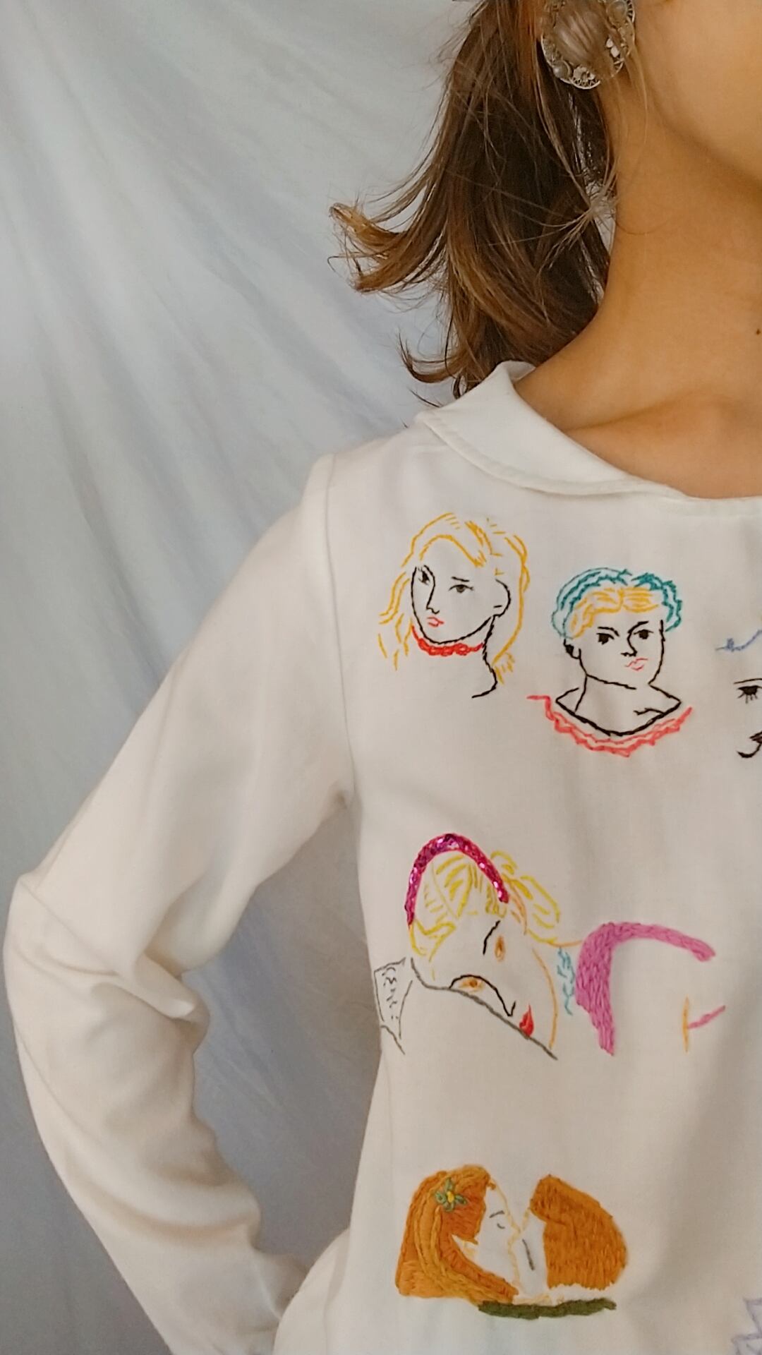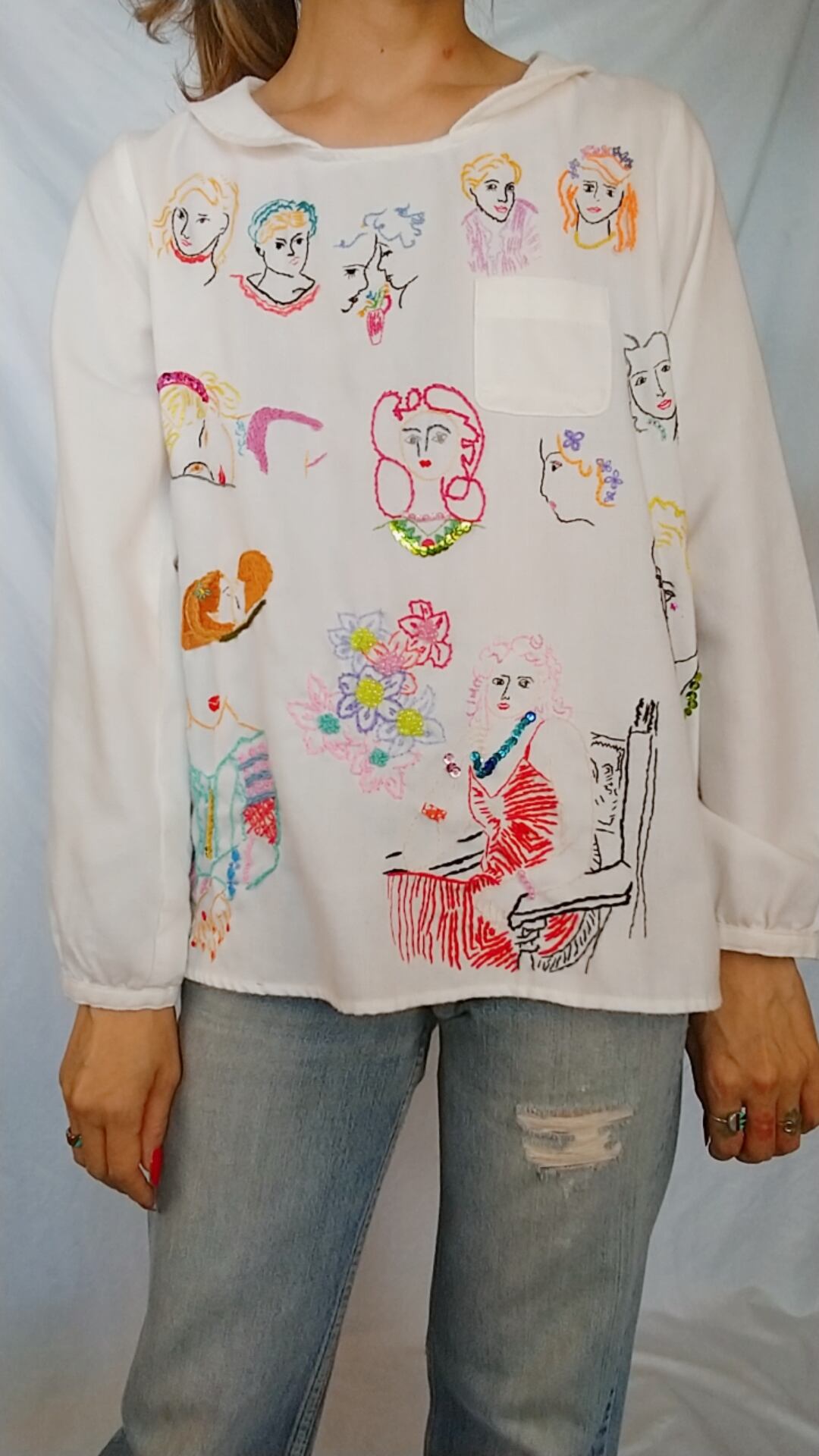 ■カジュアルにもフォーマルなスタイリングにも取り入れやすいホワイトベースのトップスです。幅広く活躍する白も汚れが残りやすいのが悩み。。。今回は刺繍で汚れをカバーし、更にバランスと雰囲気を重視しながら刺繍を施しました。カラフルな色糸とビーズ、スパンコール使いで生まれ変わった1枚に仕上がりました。