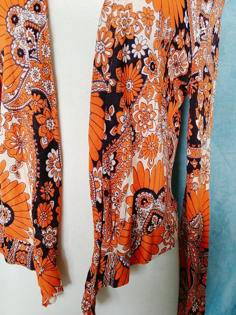 ■鮮やかなオレンジとネイビーのバランスが目をひく美しいデザインのトップスです。タイトなシルエットですが程よい伸縮性があり着心地抜群です。