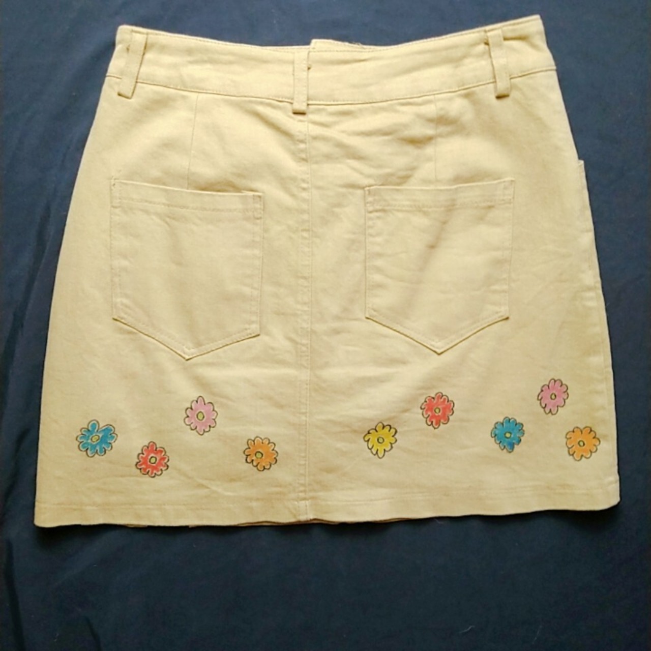 ■スッキリとした丈感がキュートなスカートです。柔らかな肌触りで履き心地も抜群。落ち着いた色味に映える、カラフルで雰囲気のあるハンドライティングを施しました。