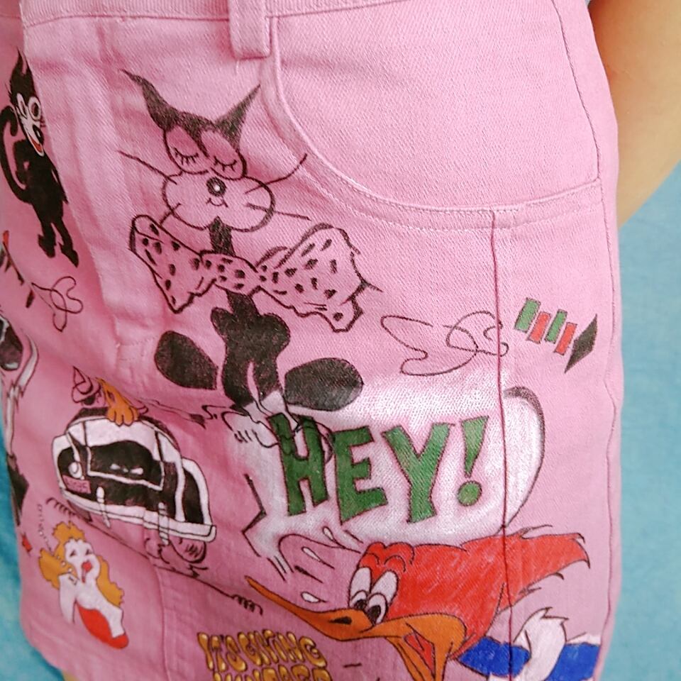 ■スッキリとした丈感がキュートなスカートです。柔らかな肌触りで履き心地も抜群。深みのある落ち着いたピンクに映えるハンドライティングを施しました。