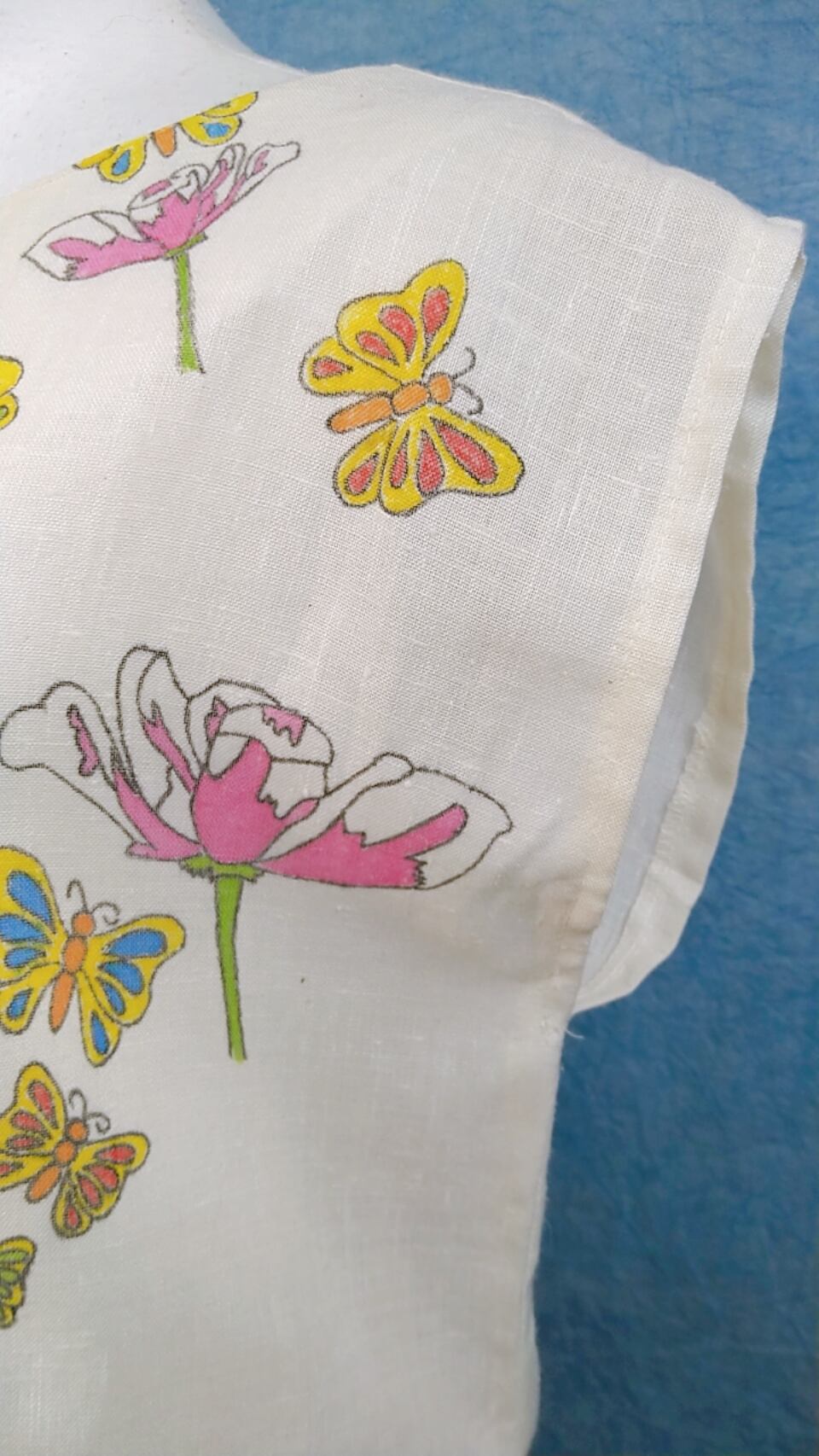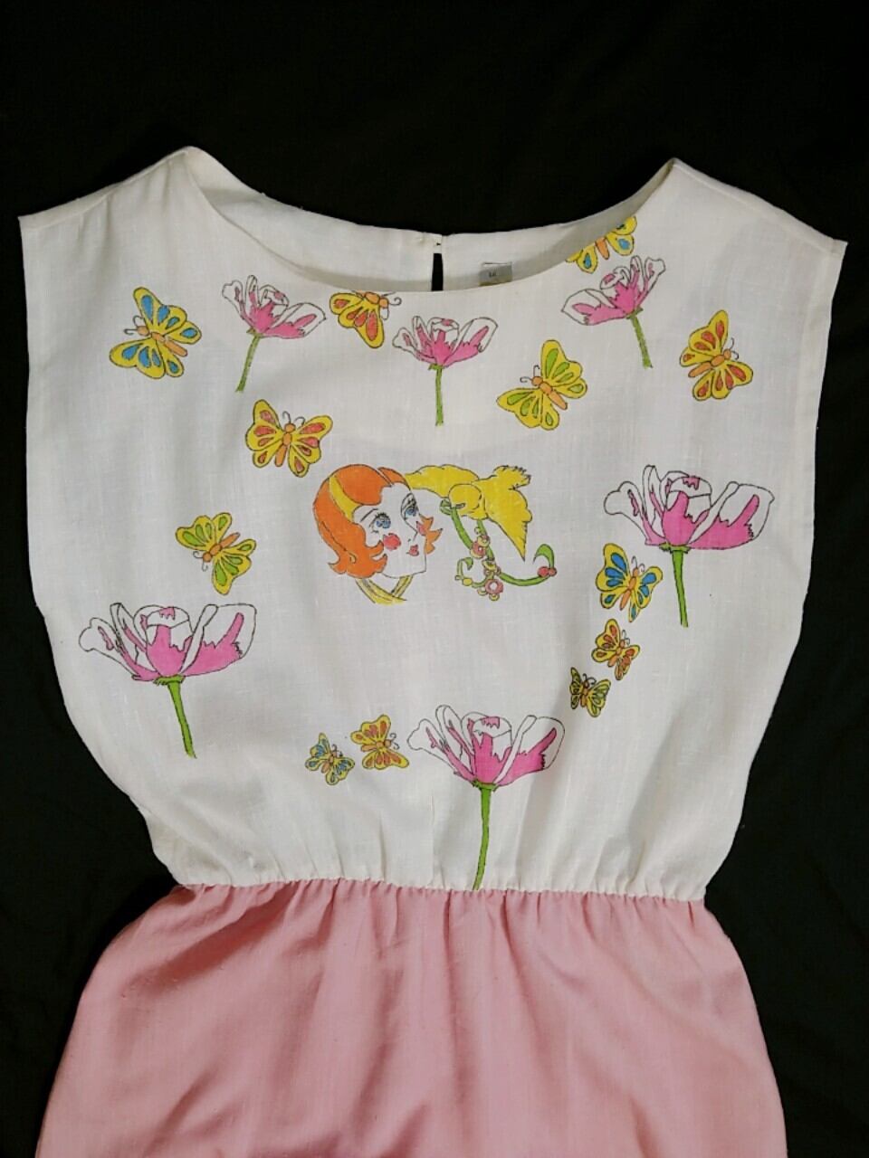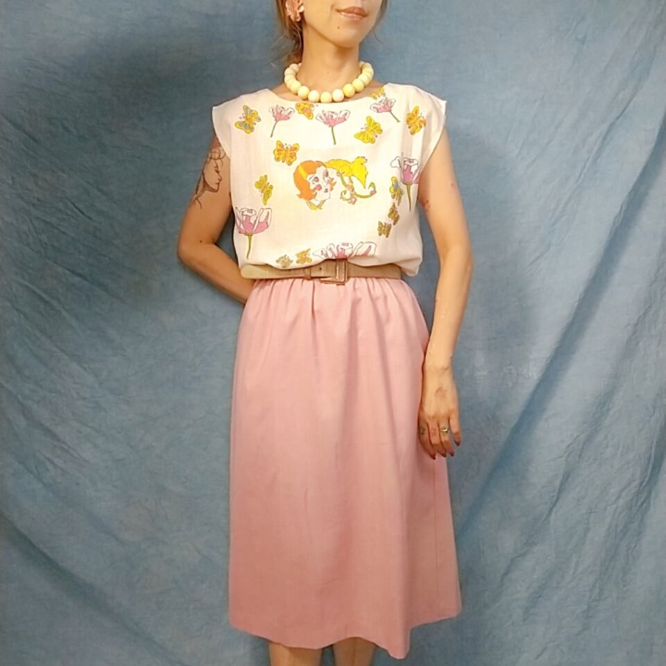■カラーリングや生地の雰囲気がキュートなドレスです。汚れがありましたが本来のドレスの柔らかな雰囲気に合わせたハンドライティングで汚れをカバーしました。涼しく、軽い着用感です。