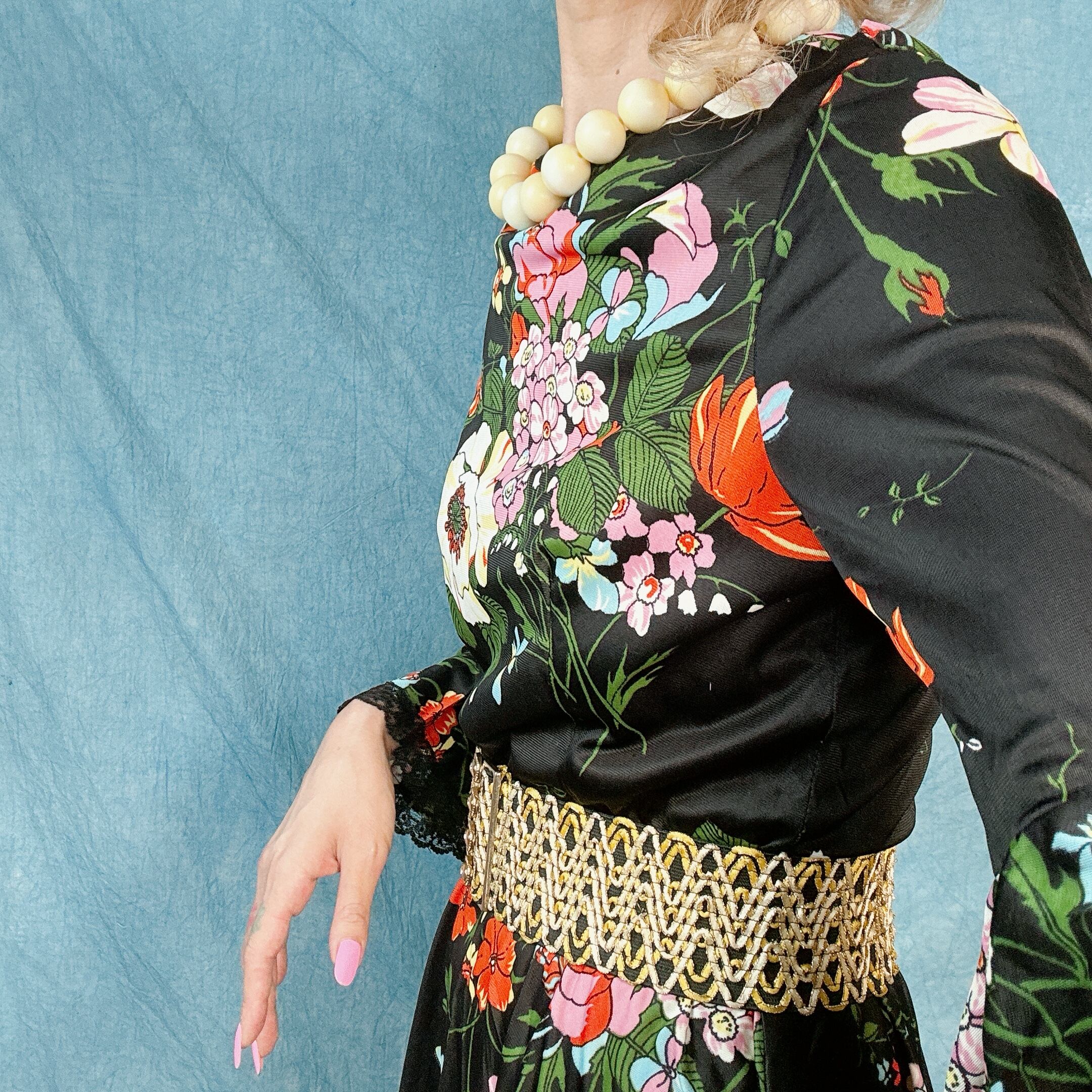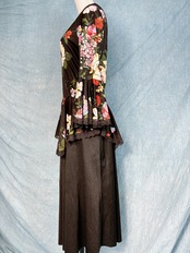 ■デザイン性の高い美しいドレスです。バタフライスリーブが雰囲気満点。お腰周りのデザインもシルエットを美しくみせてくれます。大胆なフラワーパターンが黒地に映えてとても美しいですね。フレアパンツやスカートとレイヤードしても◎*。パーティシーンにも是非。